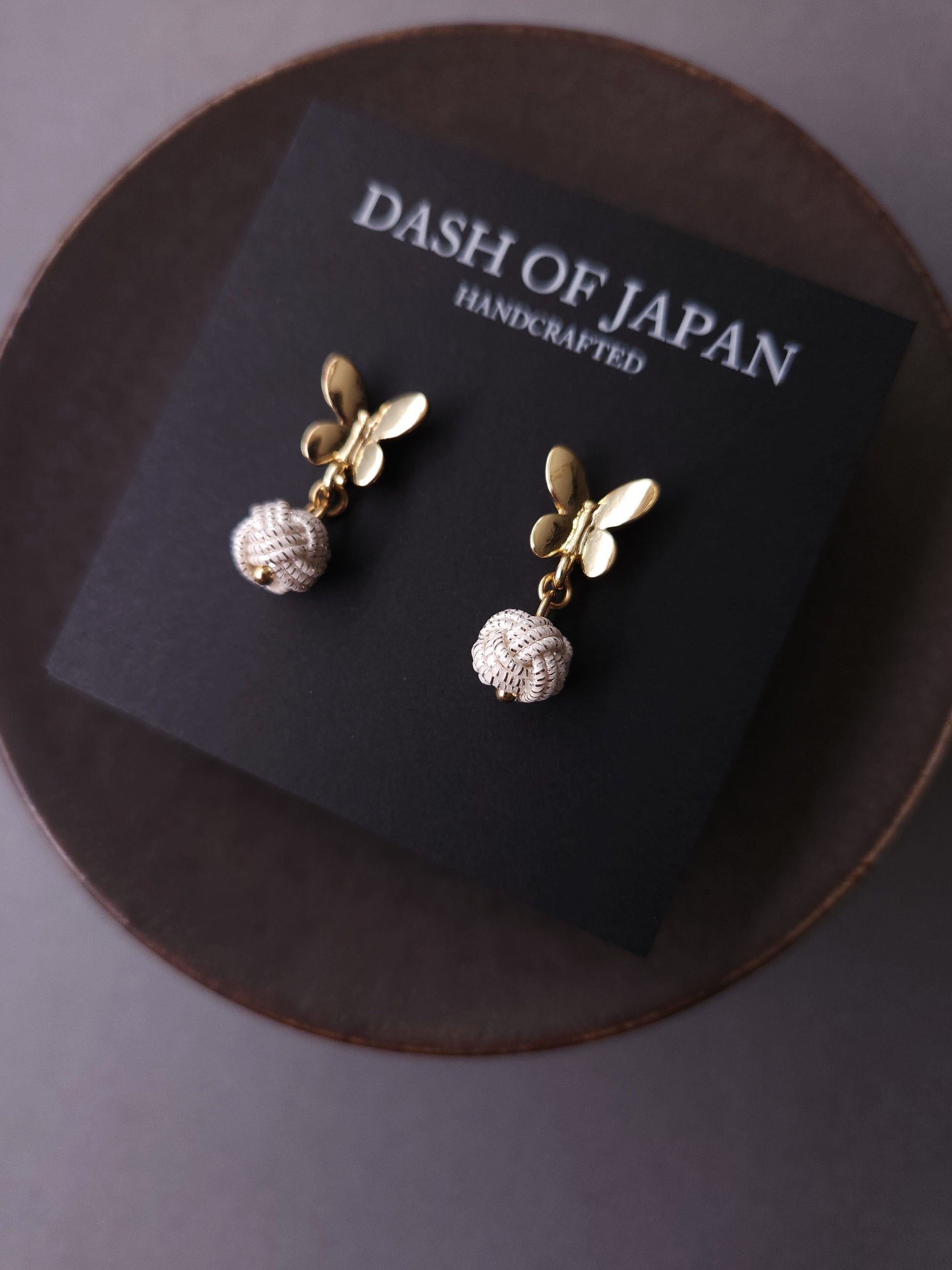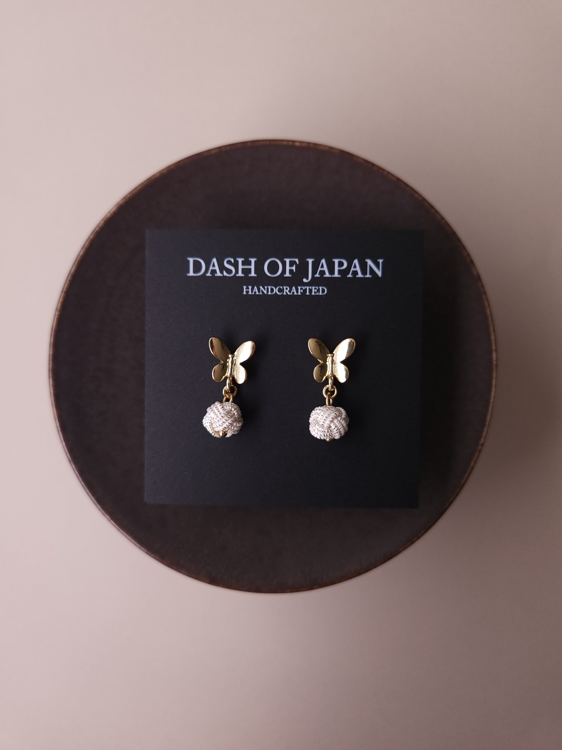 Handcrafted earrings featuring a delicate butterfly motif paired with a Mizuhiki knot.