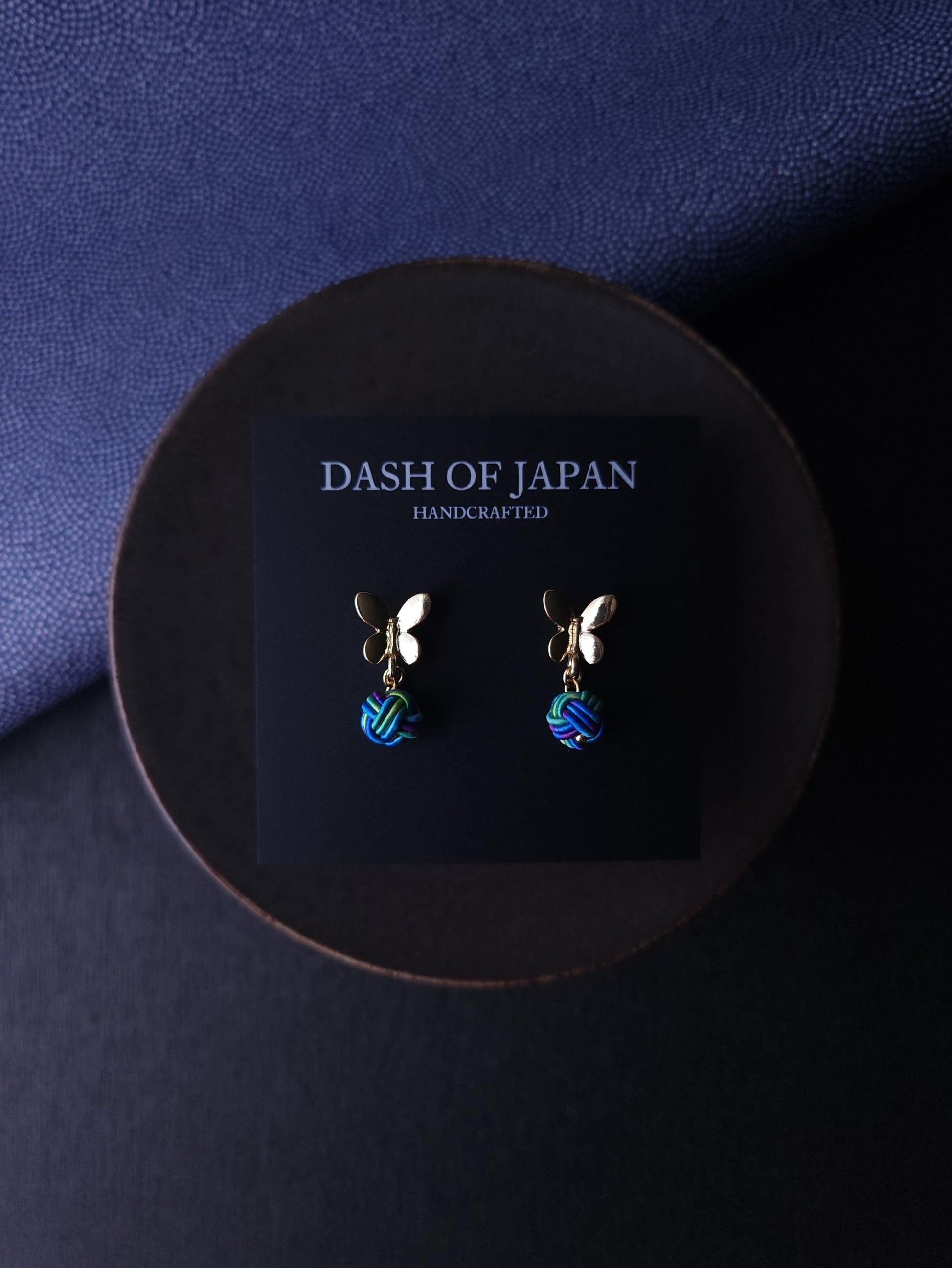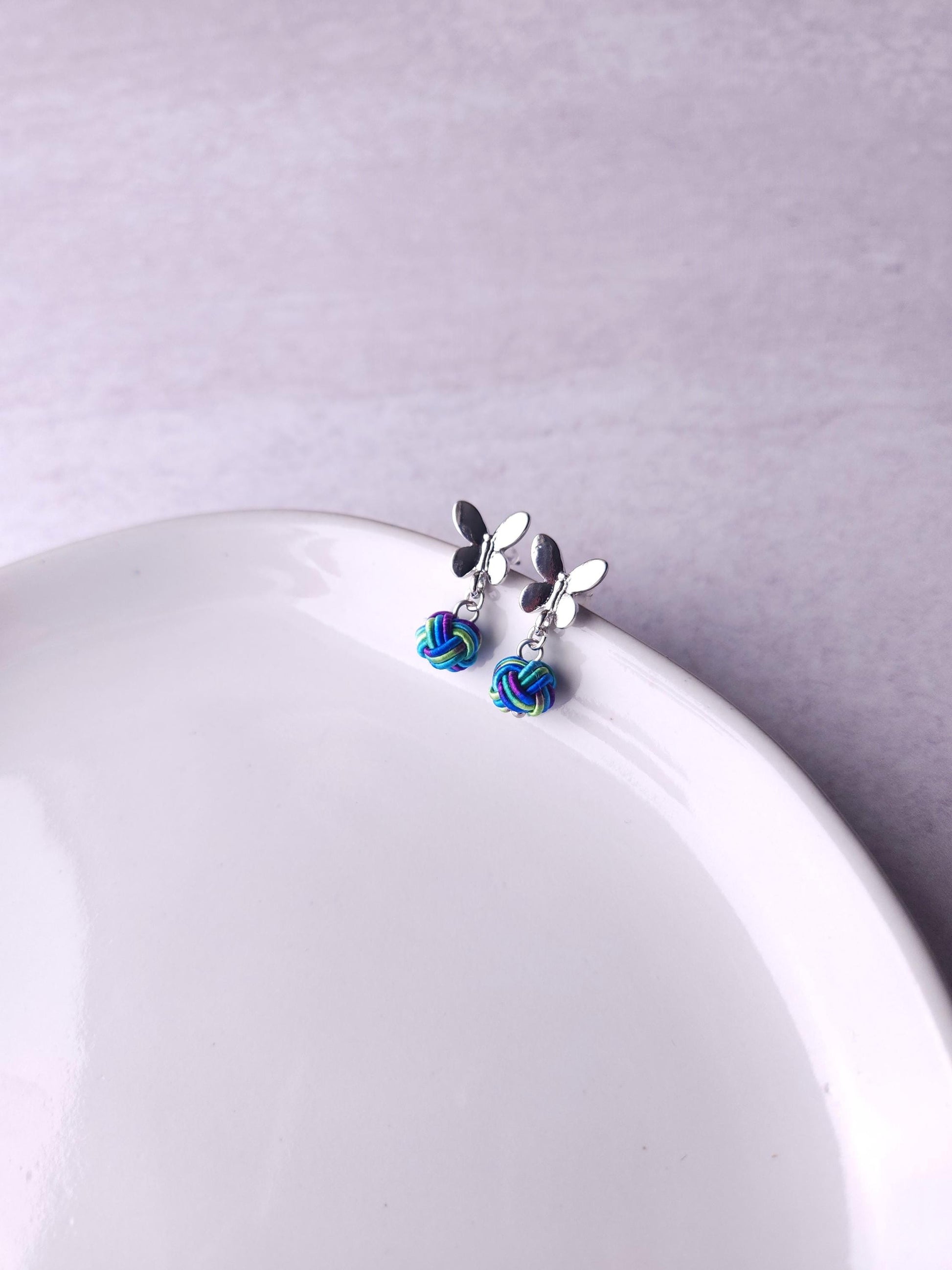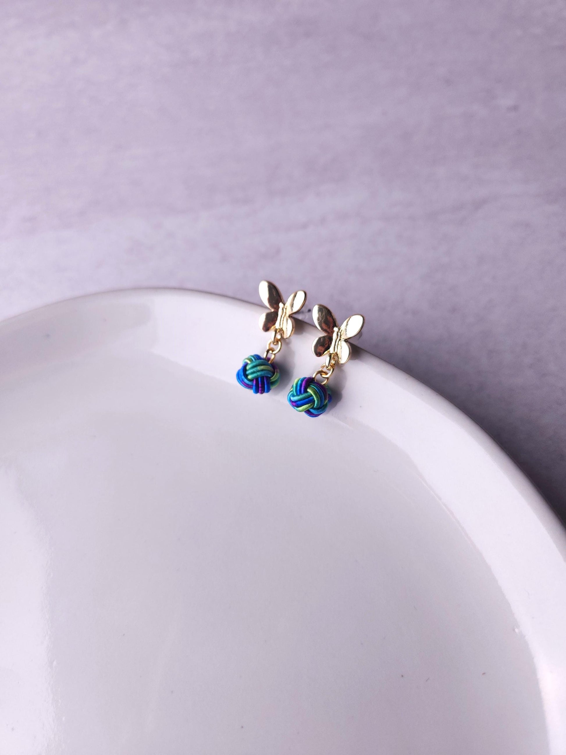 Handcrafted earrings featuring a delicate butterfly motif paired with a Mizuhiki knot.