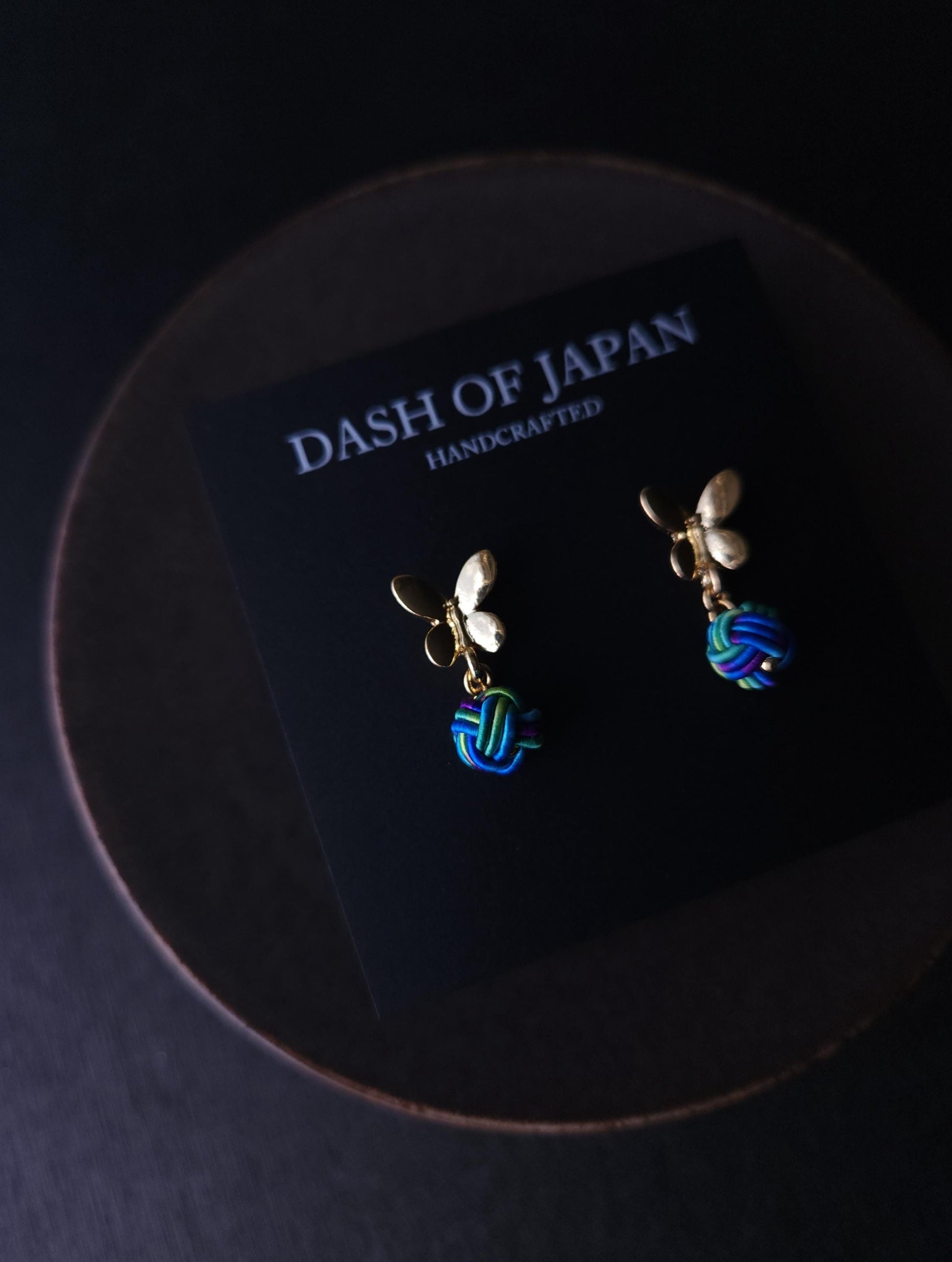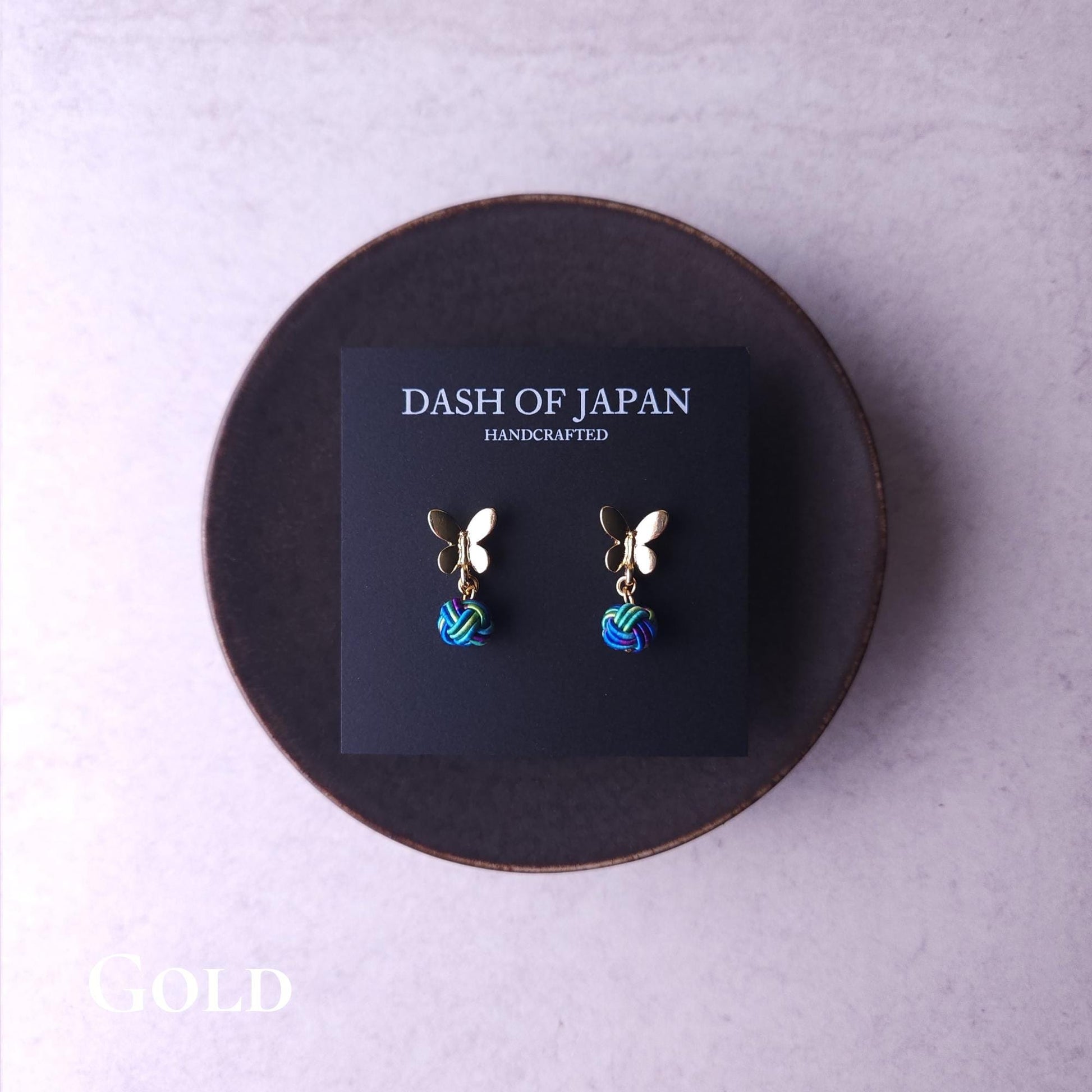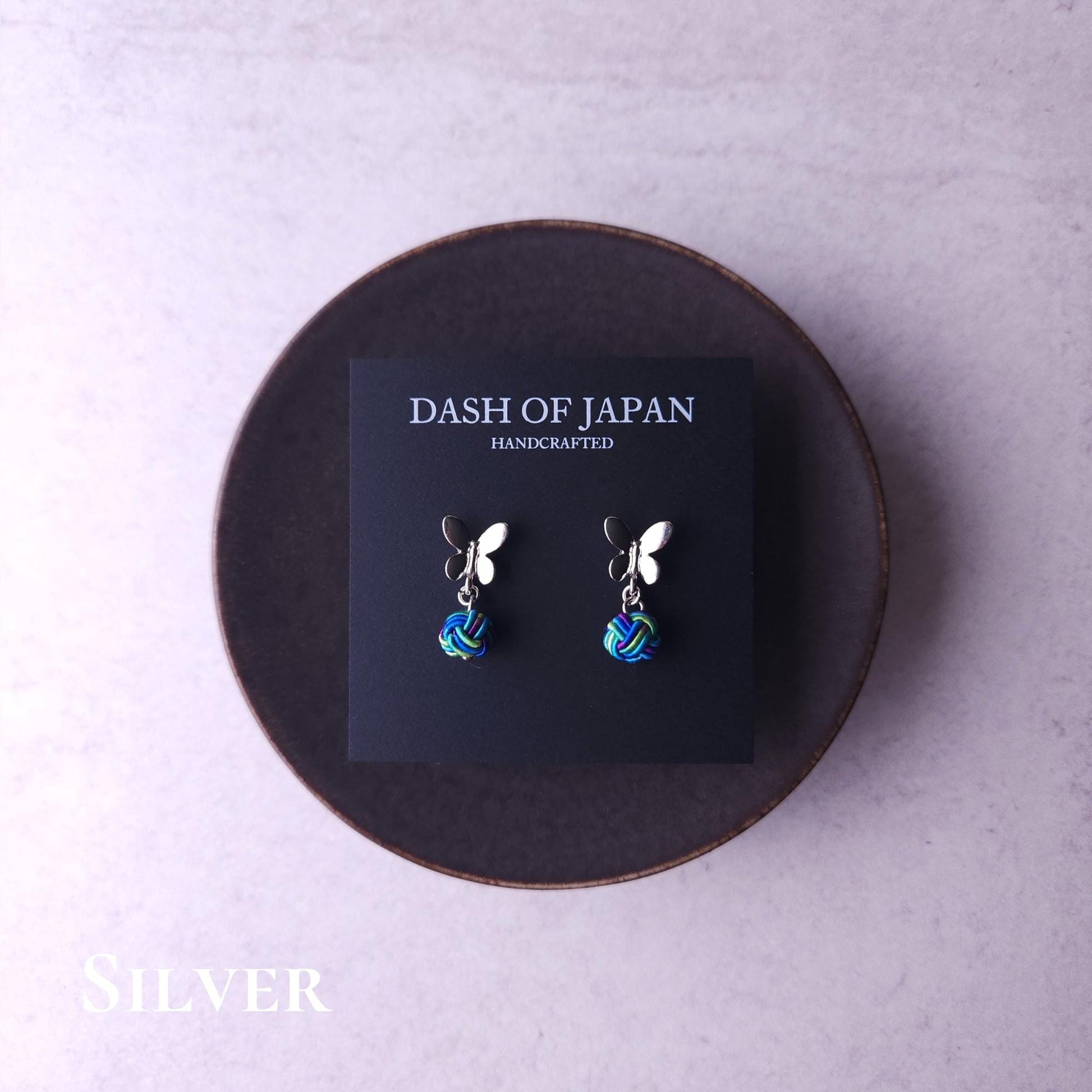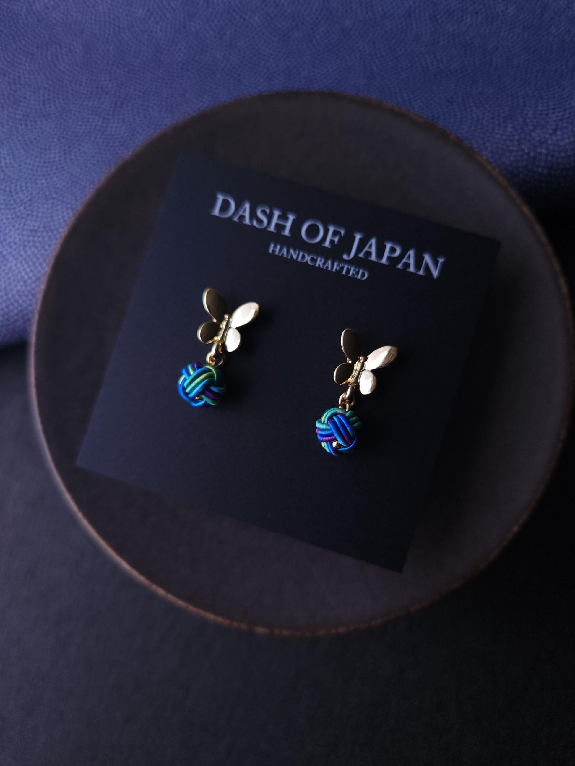 Handcrafted earrings featuring a delicate butterfly motif paired with a Mizuhiki knot.