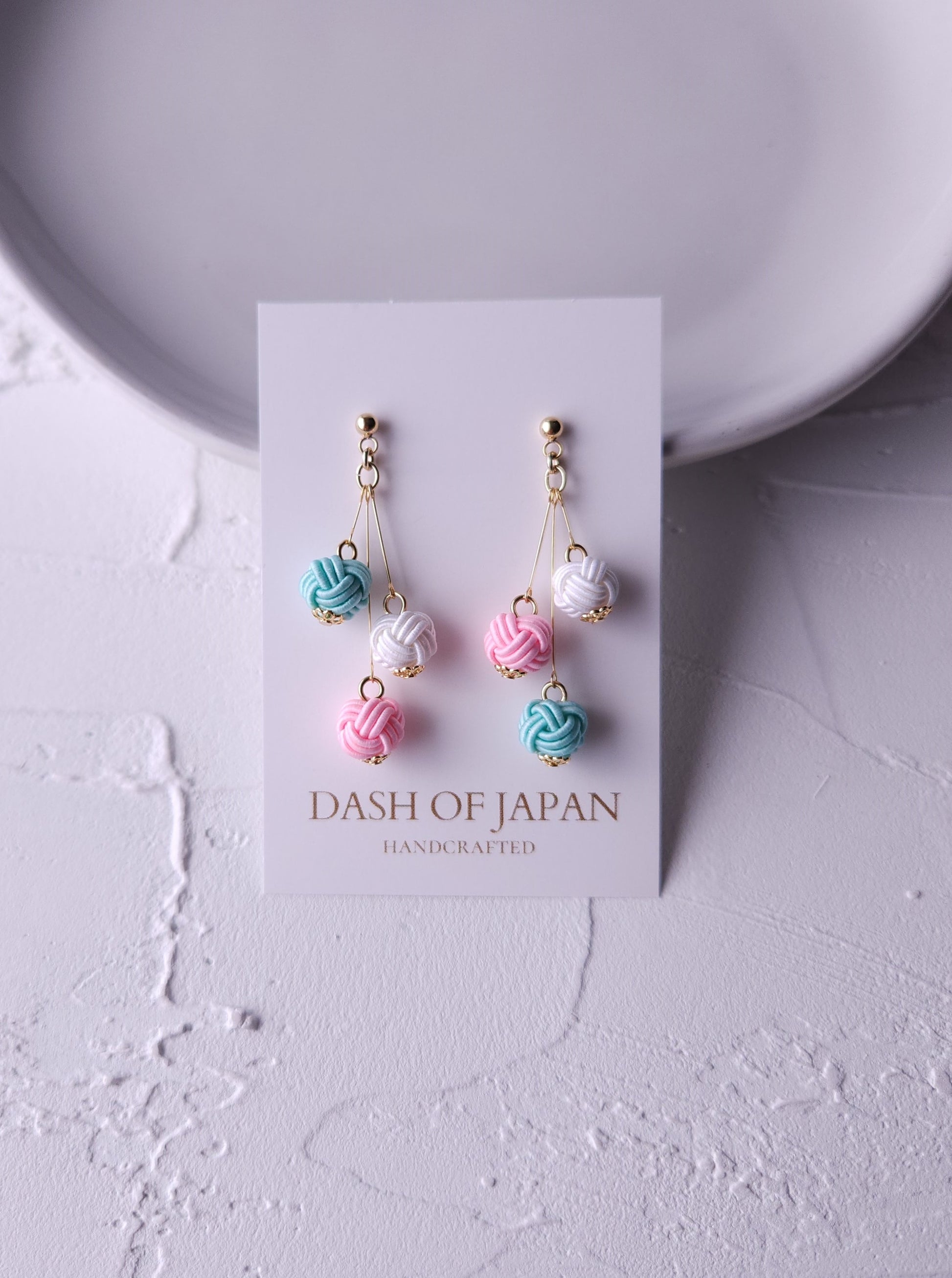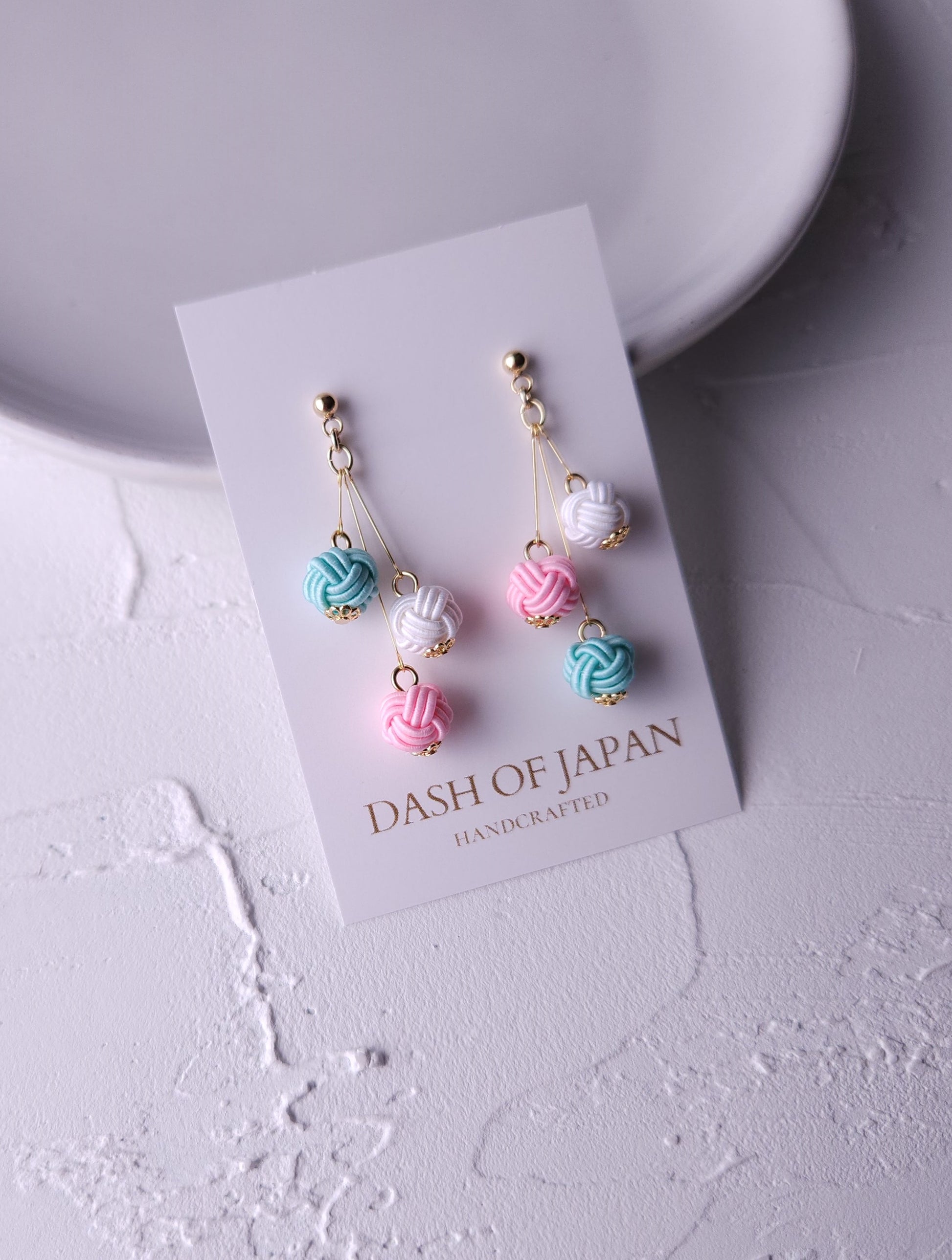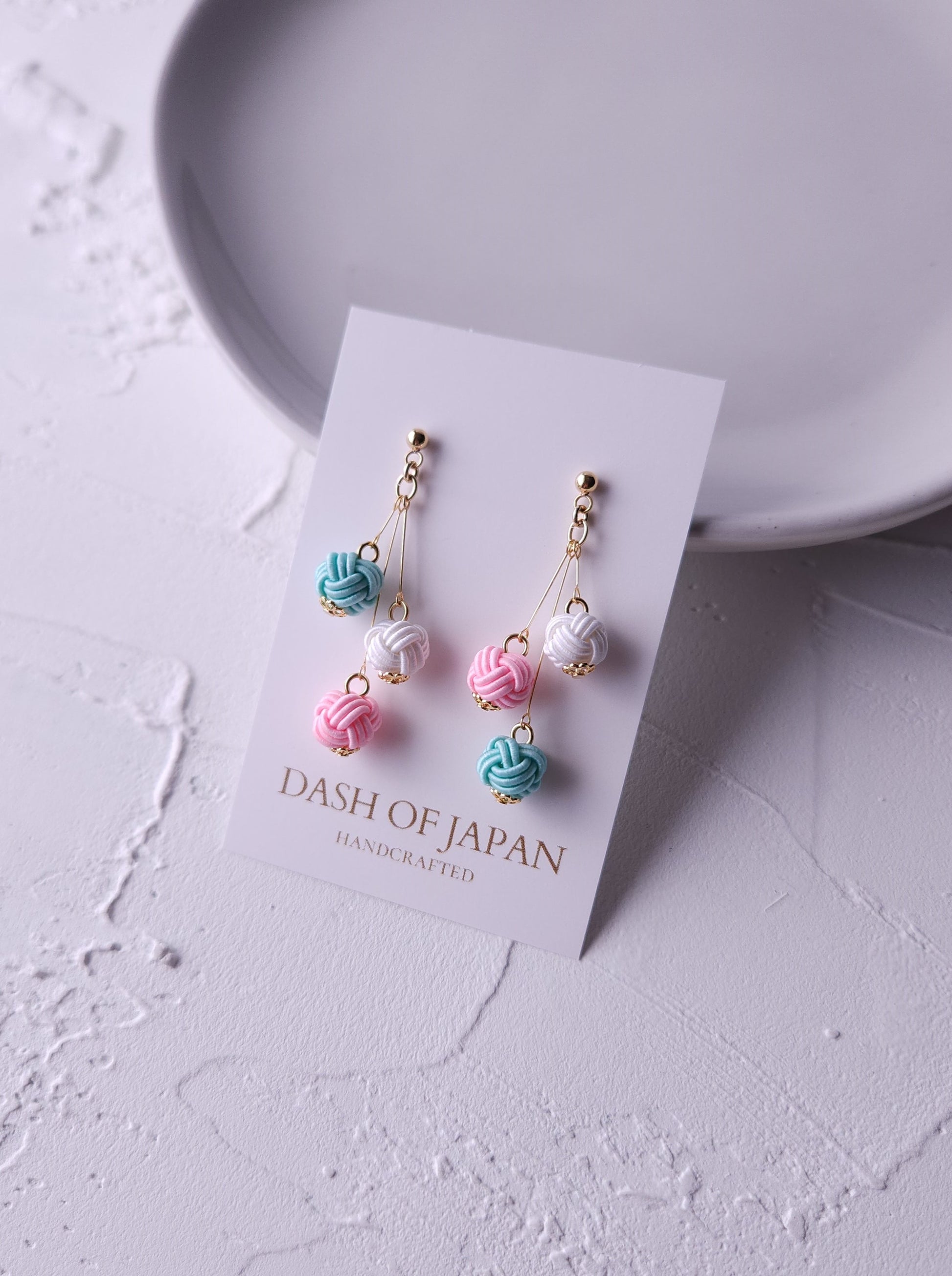 Each ball knots are meticulously handwoven with Mizuhiki, connected with wire, resembling sweet candies. The colors are also matched in soft and pop hues reminiscent of candies.