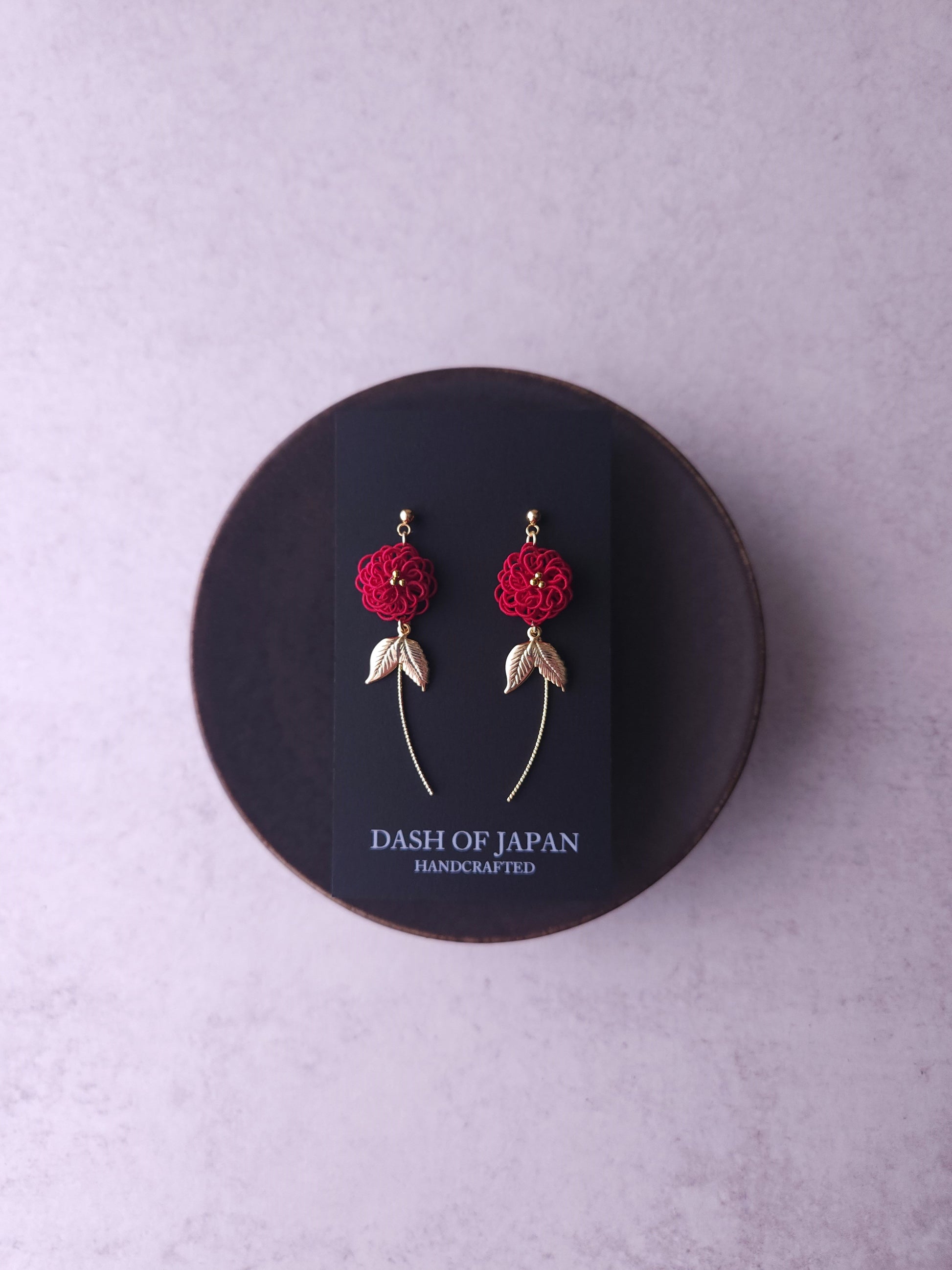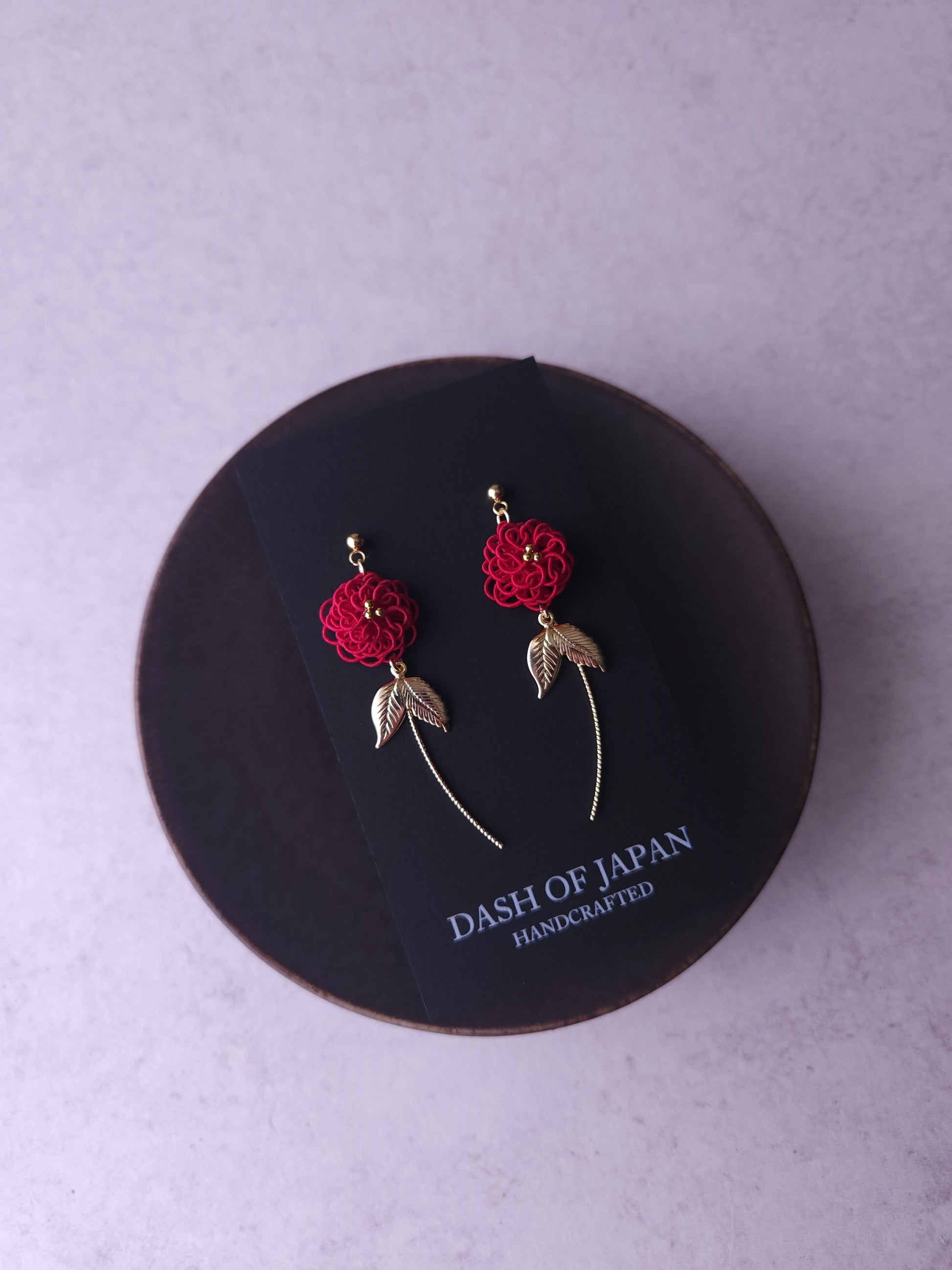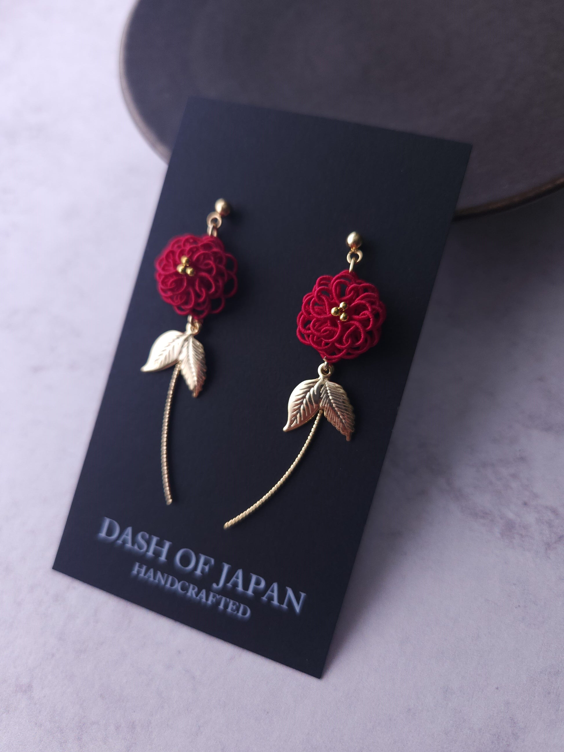 These floral earrings are meticulously crafted with very thin type Mizuhiki cords, forming a delicate flower motif. To enhance their charm, we've added metallic leaves and sparkling, gracefully curved wire components that resemble the stems of the flowers