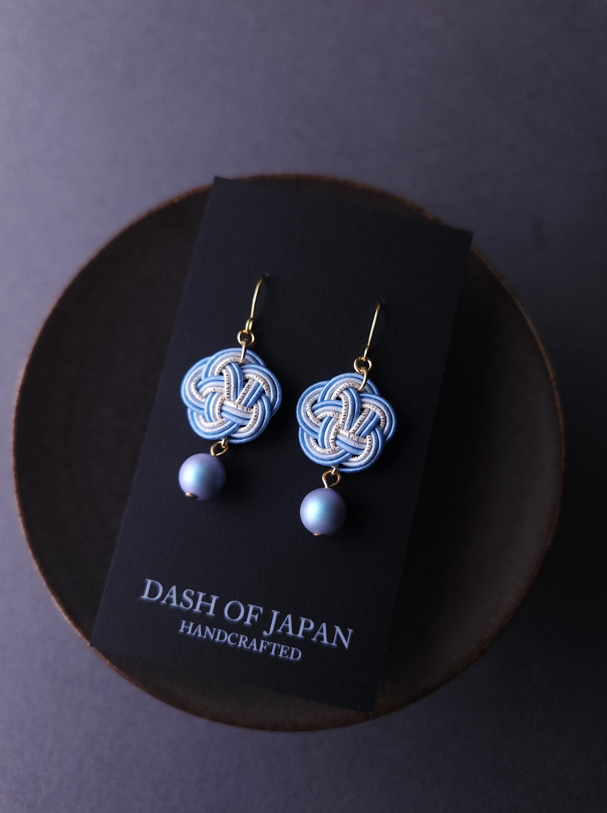 These earrings are handwoven using a paper cord called Mizuhiki and matched with glass pearl beads.