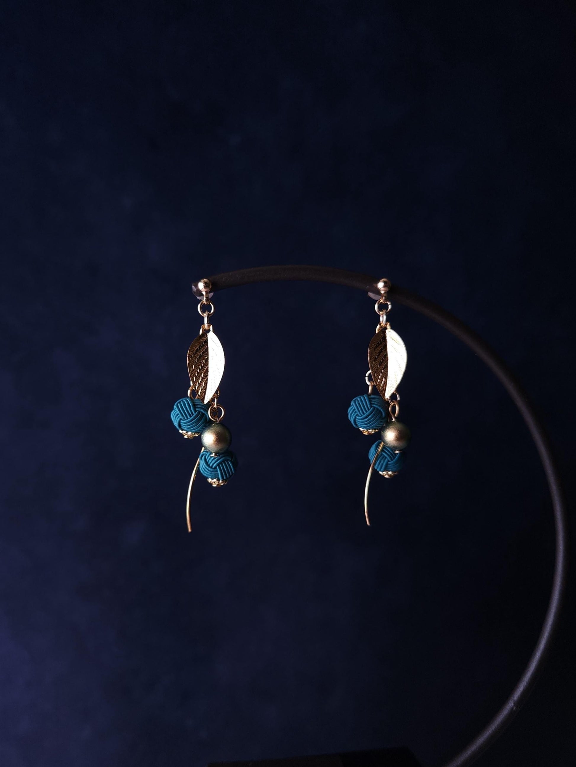 These earrings are designed to evoke delicate mimosa blossoms, gracefully dripping yellow petals. Each ball knots are meticulously handwoven using thin type of Japanese paper cord called Mizuhiki, matched with metal leaf elements, Japanese-made cotton pearl beads (compressed beads), and a metal curved bars.
