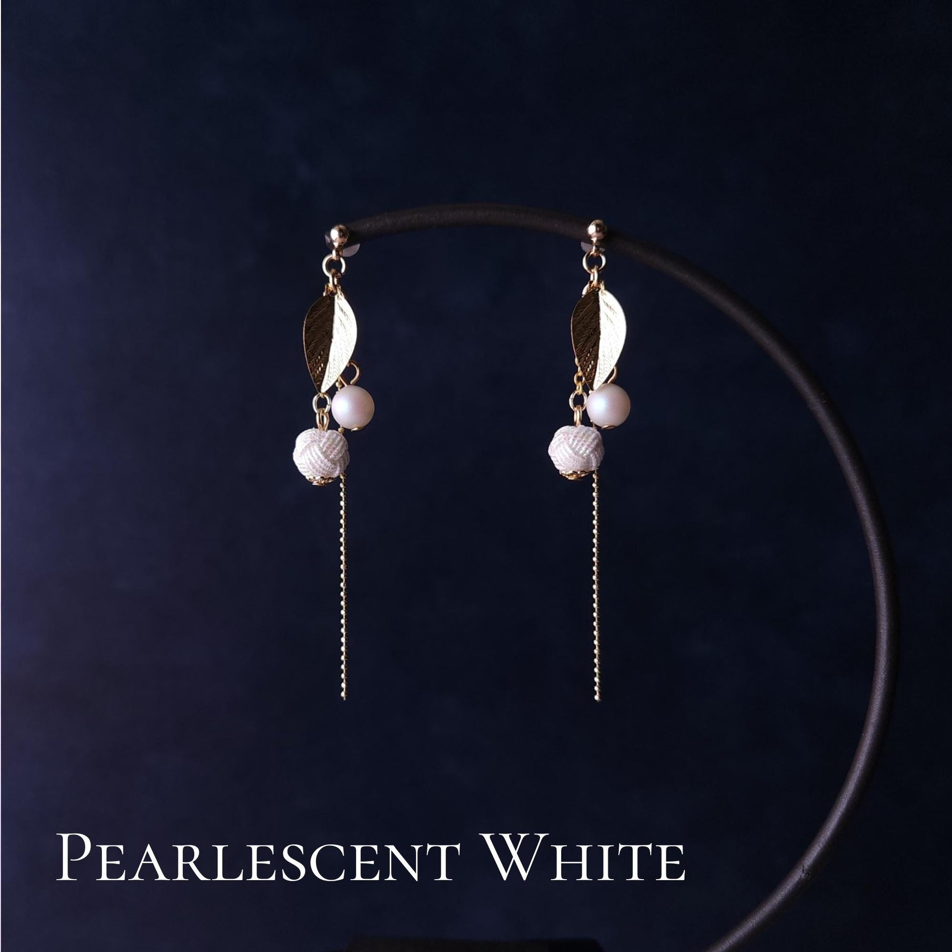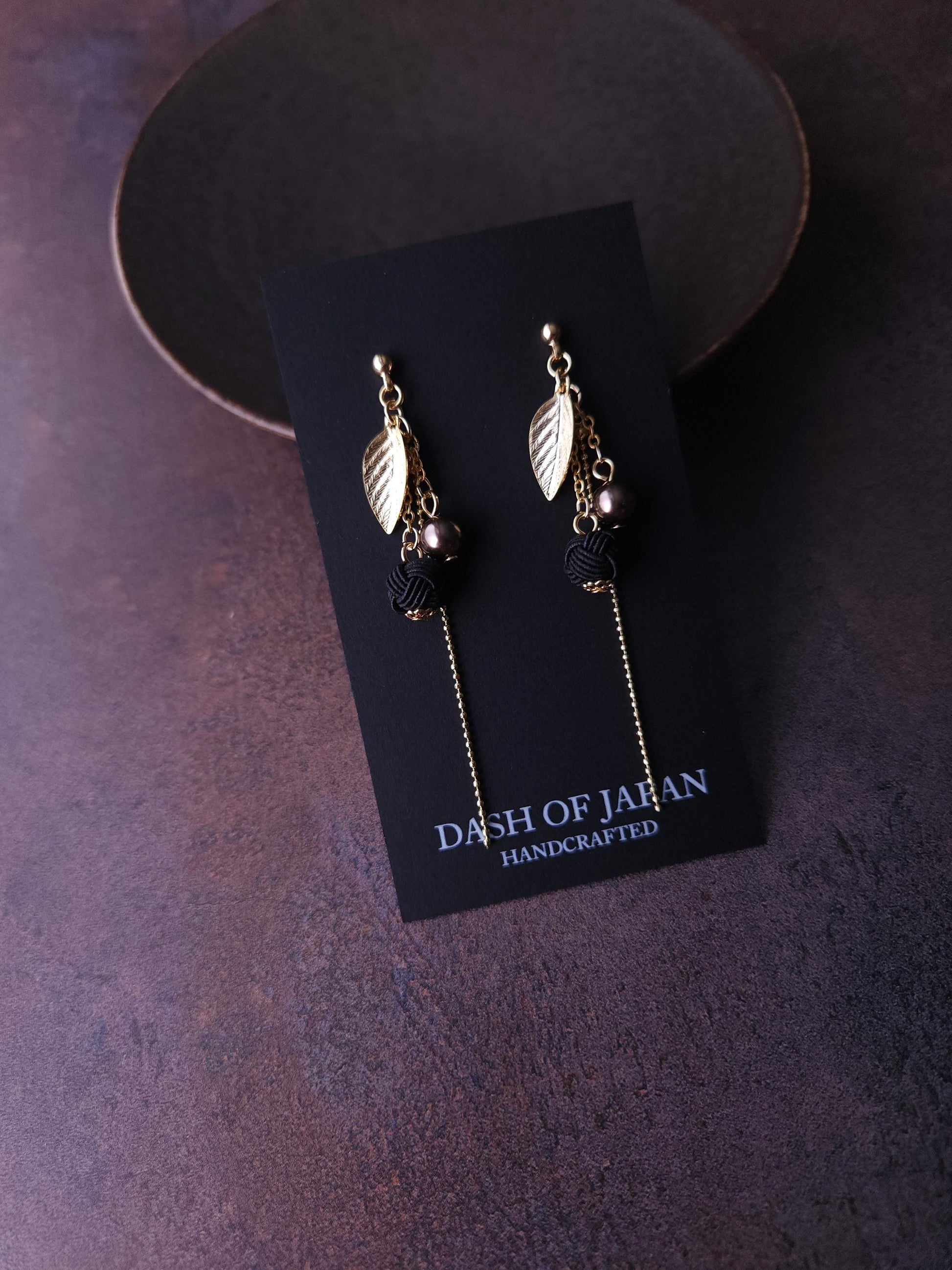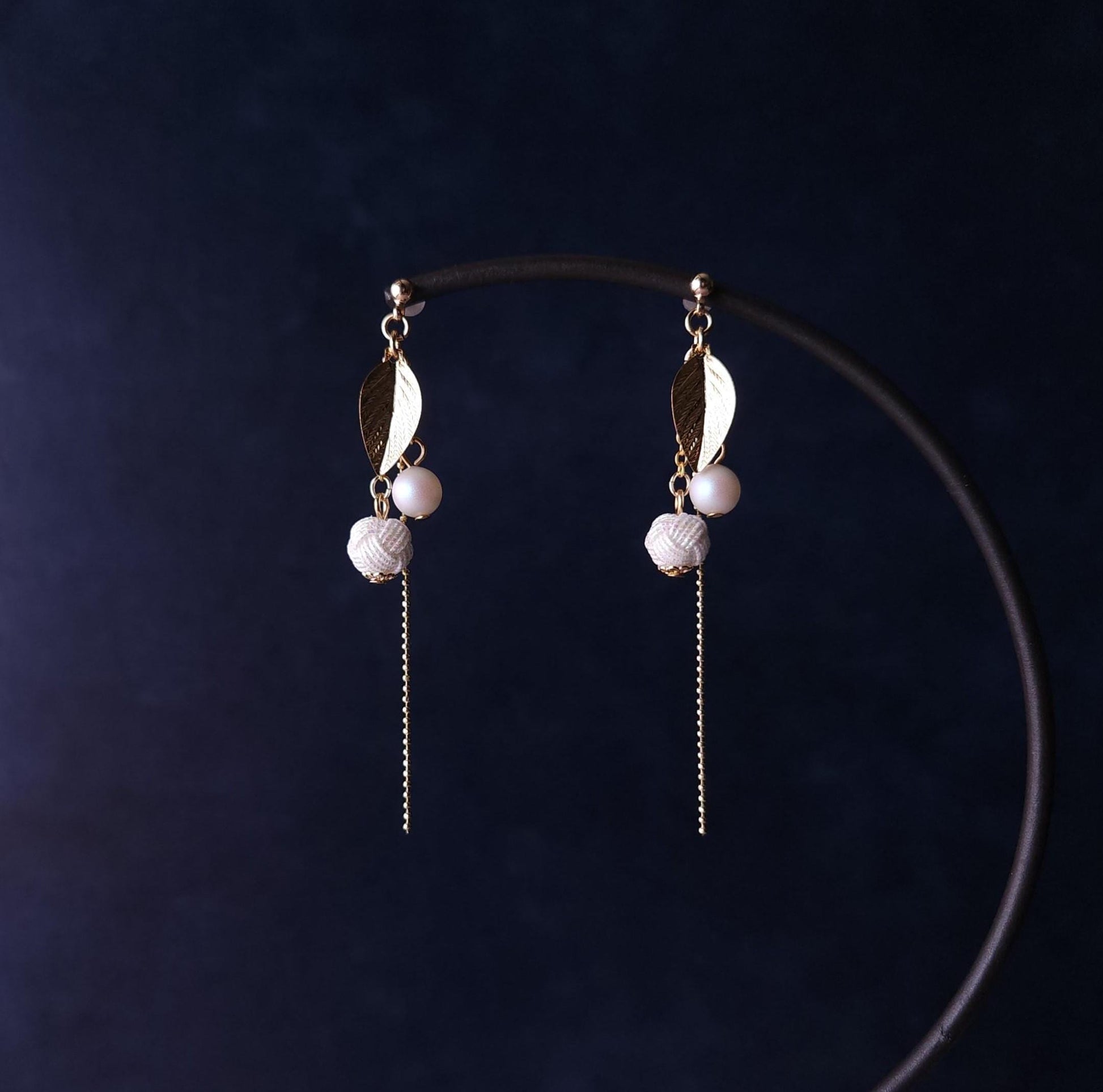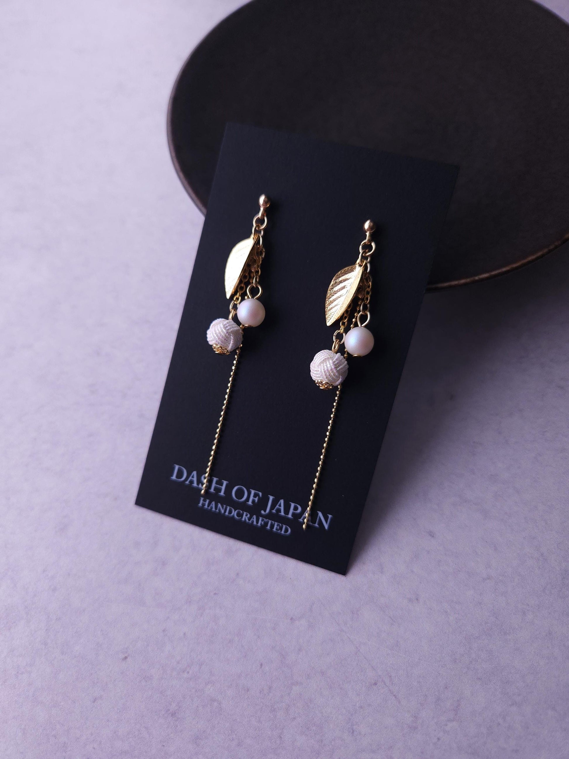 Each ball knots are meticulously handwoven using thin type of Mizuhiki, matched with metal leaf elements, glass pearl beads and shiny ball chains.