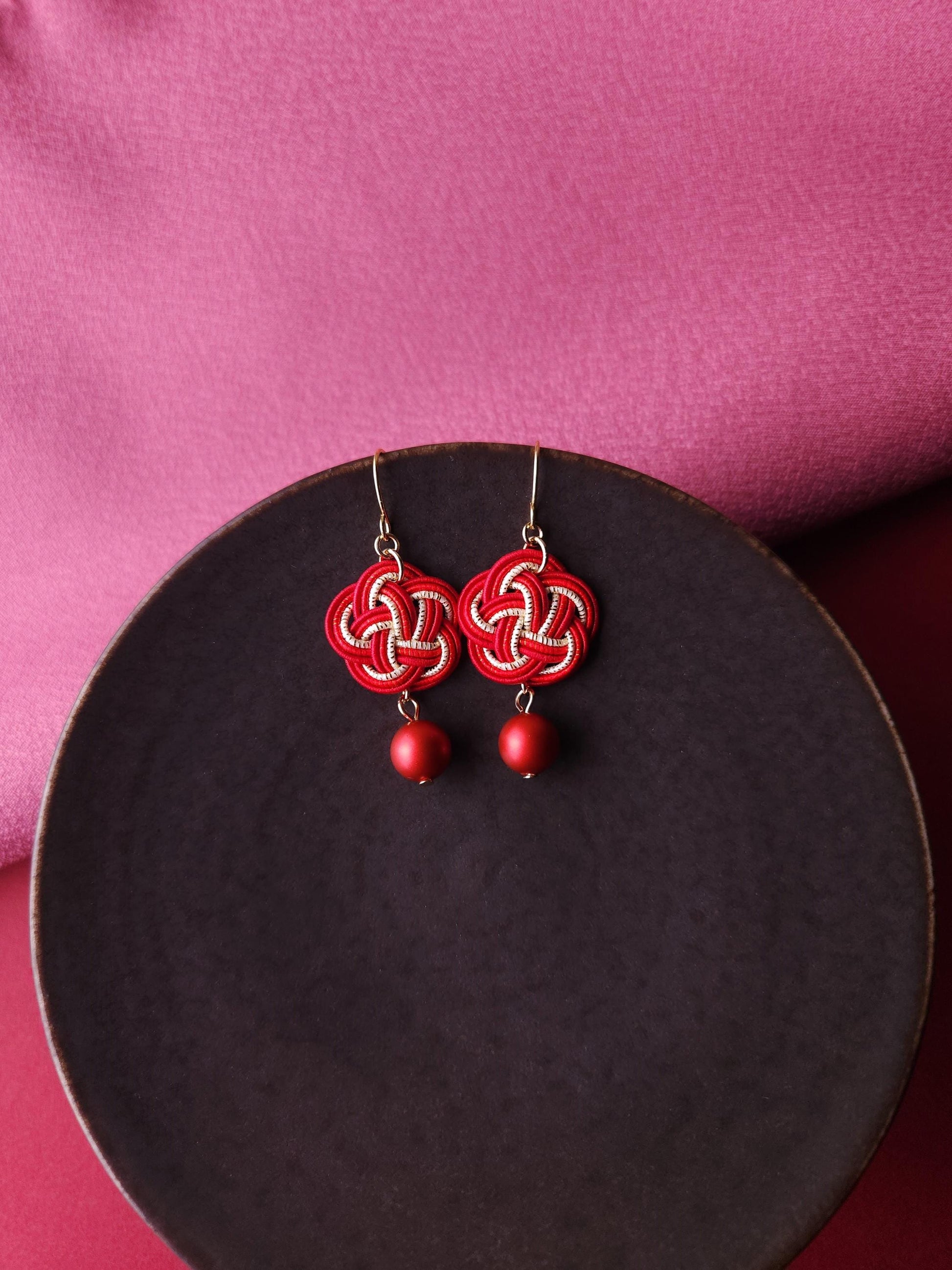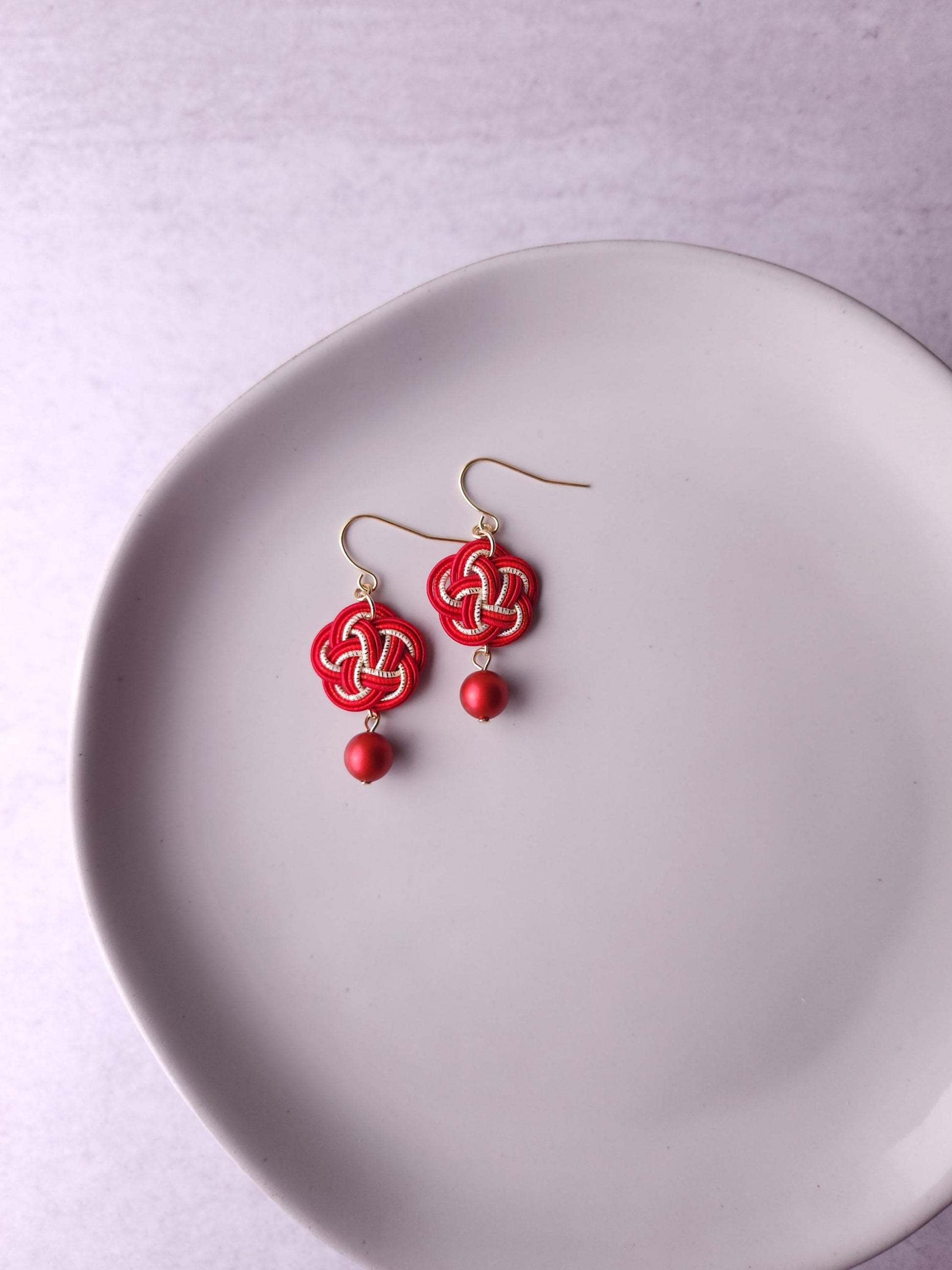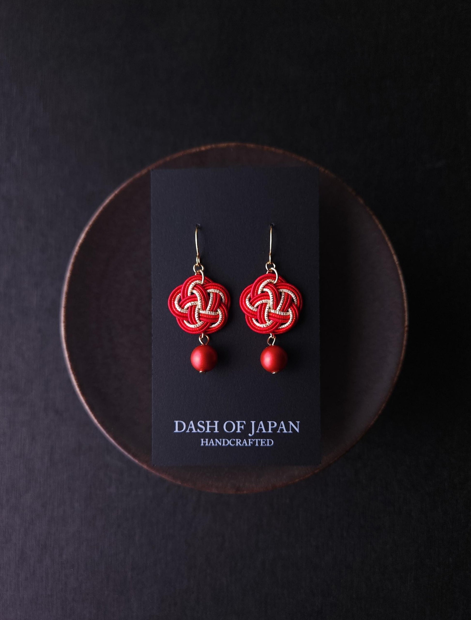 These earrings are handwoven using a paper cord called Mizuhiki and matched with crystal pearl beads.