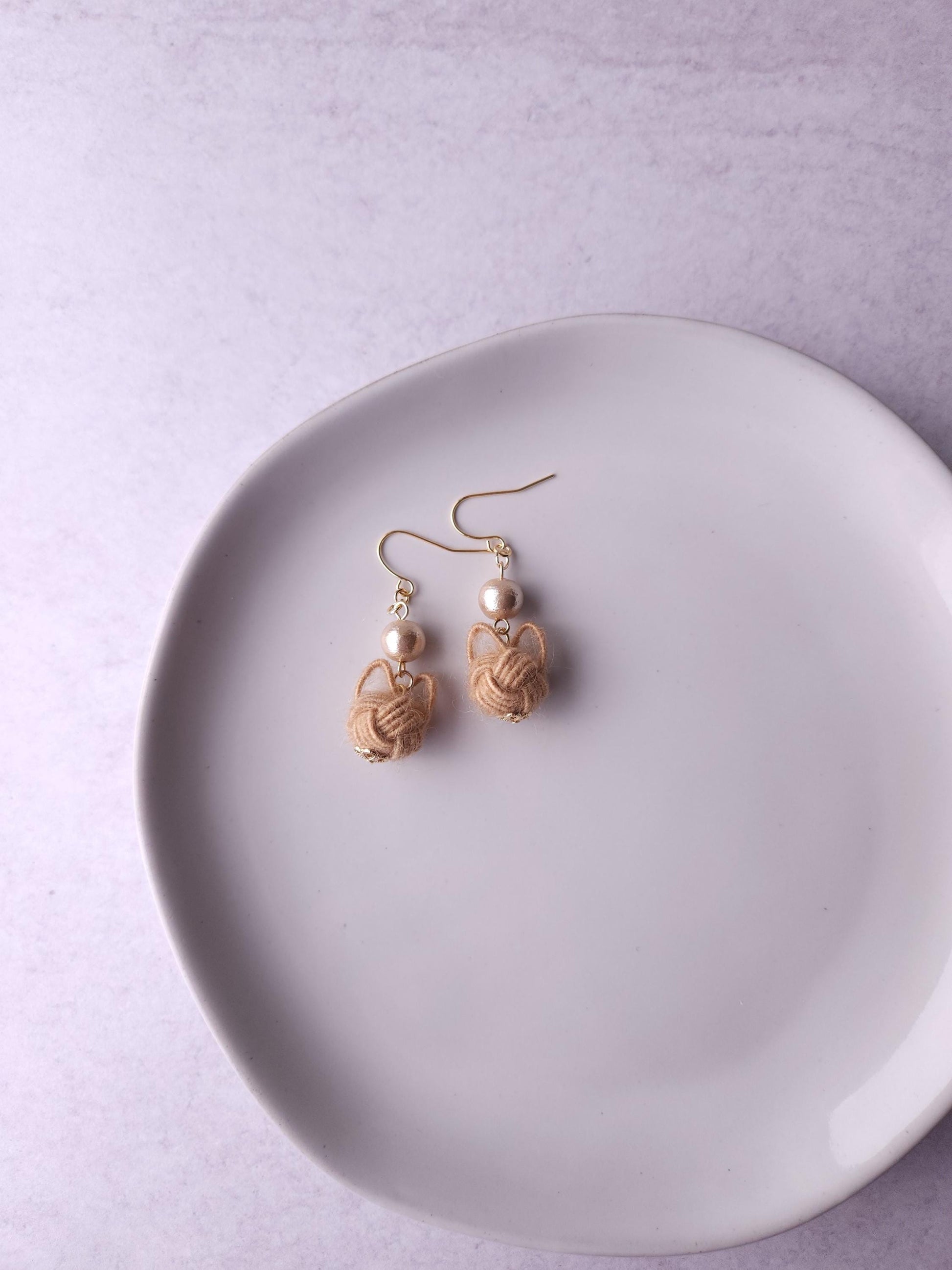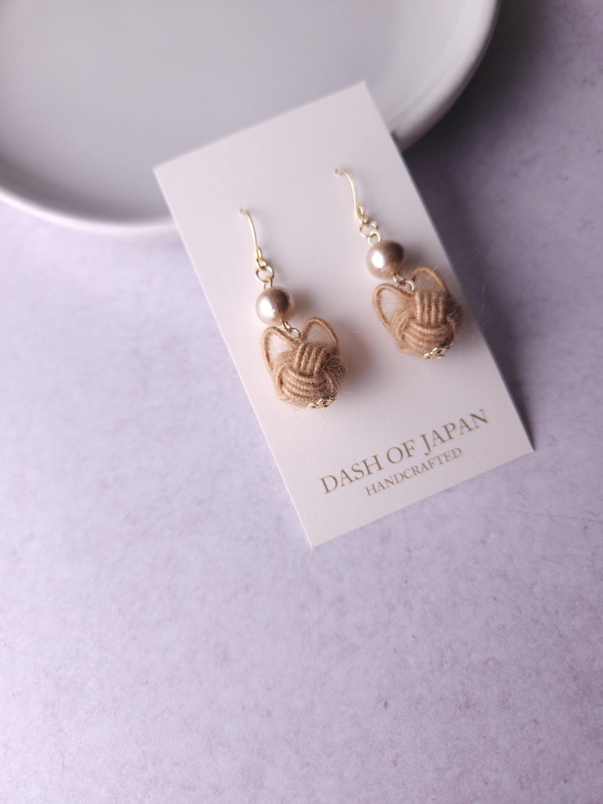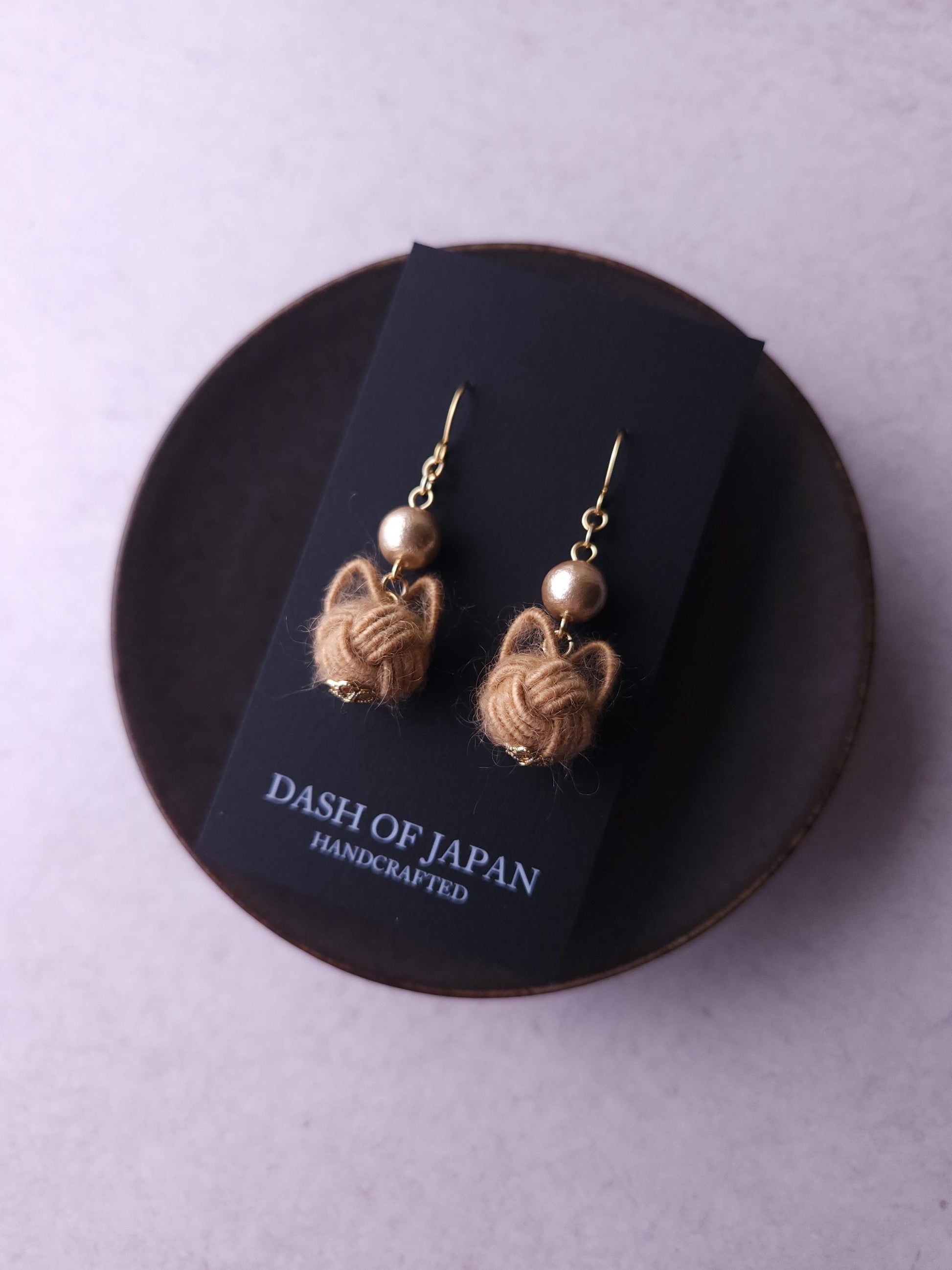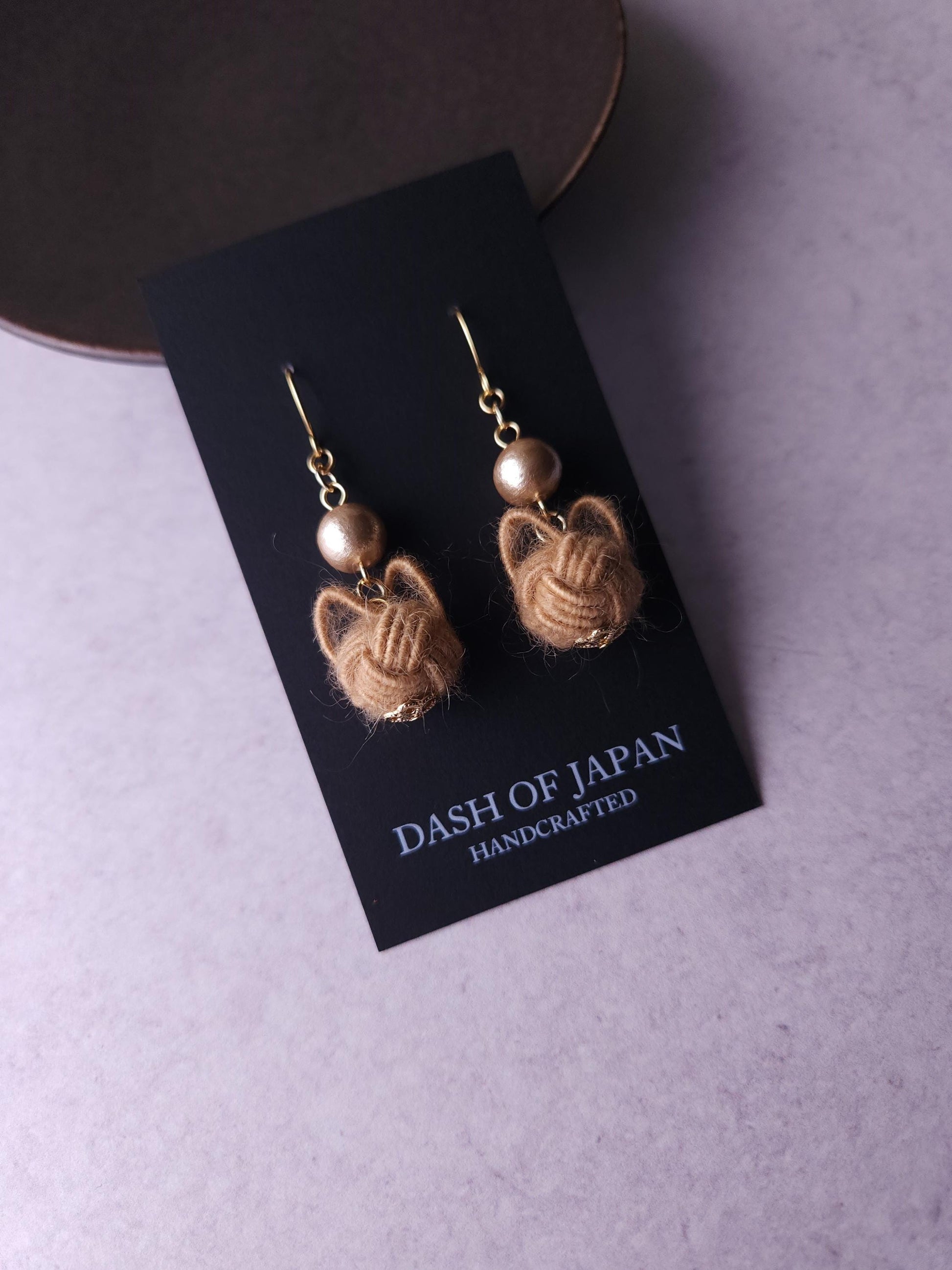 Handcrafted with a unique Mizuhiki cord that resembles yarn, make soft and fluffy cats. The adorable cats are elegantly paired with cotton pearl beads (Compressed Cotton beads). Very lightweight and comfortable to wear all day long.