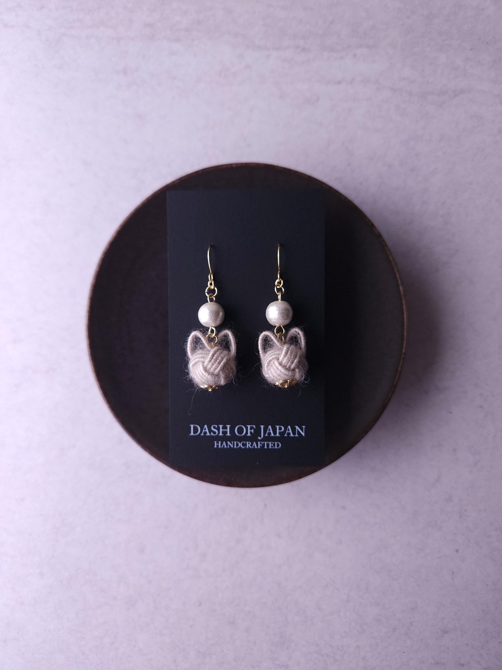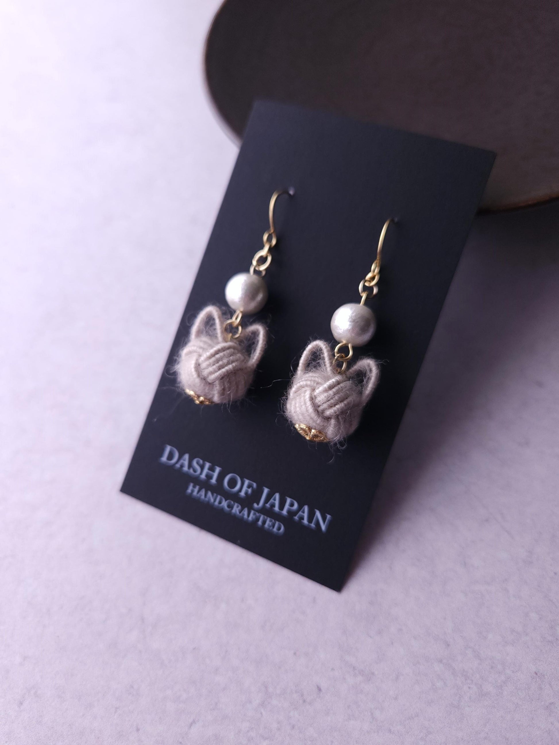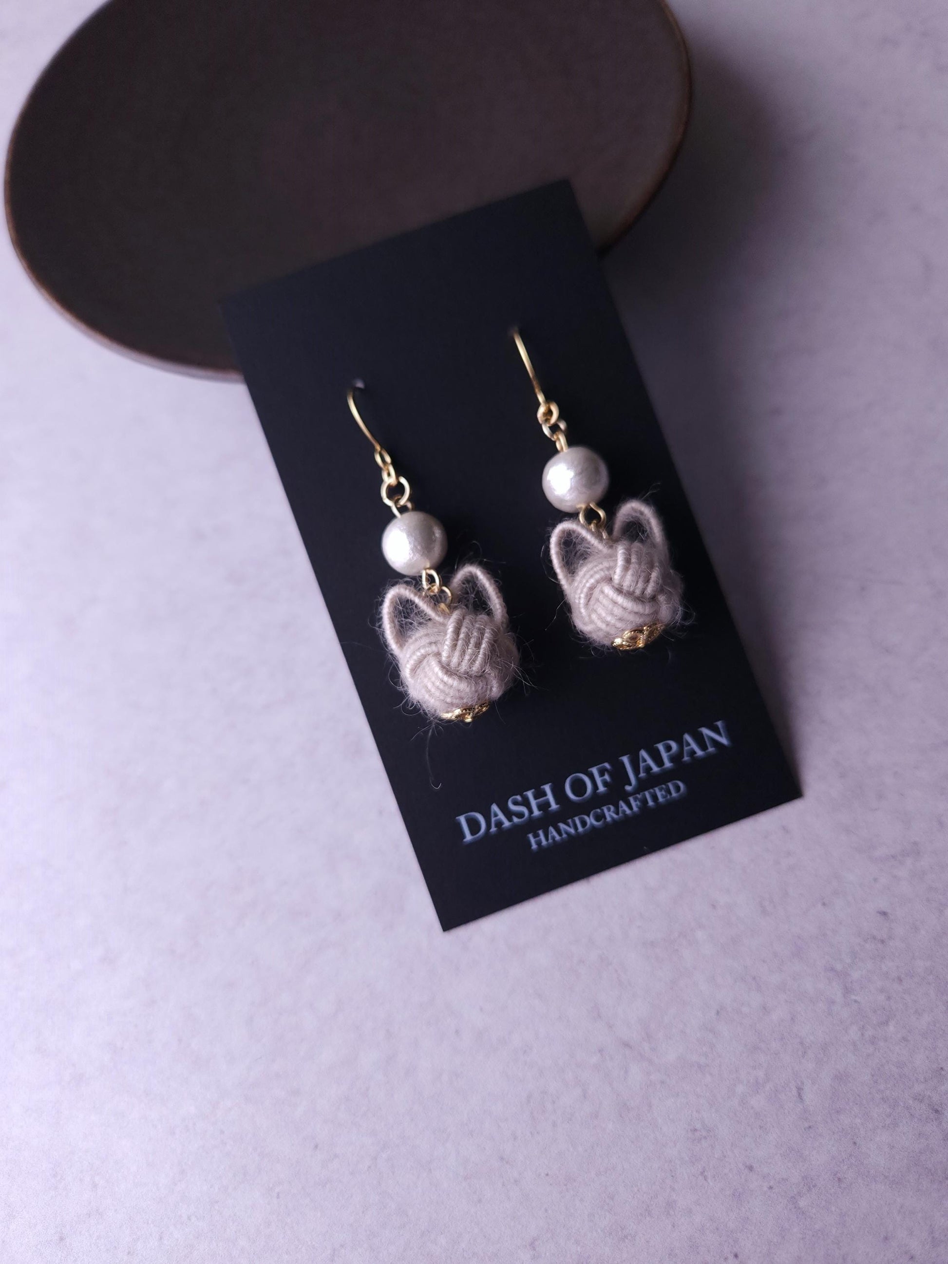 Handcrafted with a unique Mizuhiki cord that resembles yarn, make soft and fluffy cats. The adorable cats are elegantly paired with cotton pearl beads (Compressed Cotton beads). Very lightweight and comfortable to wear all day long.