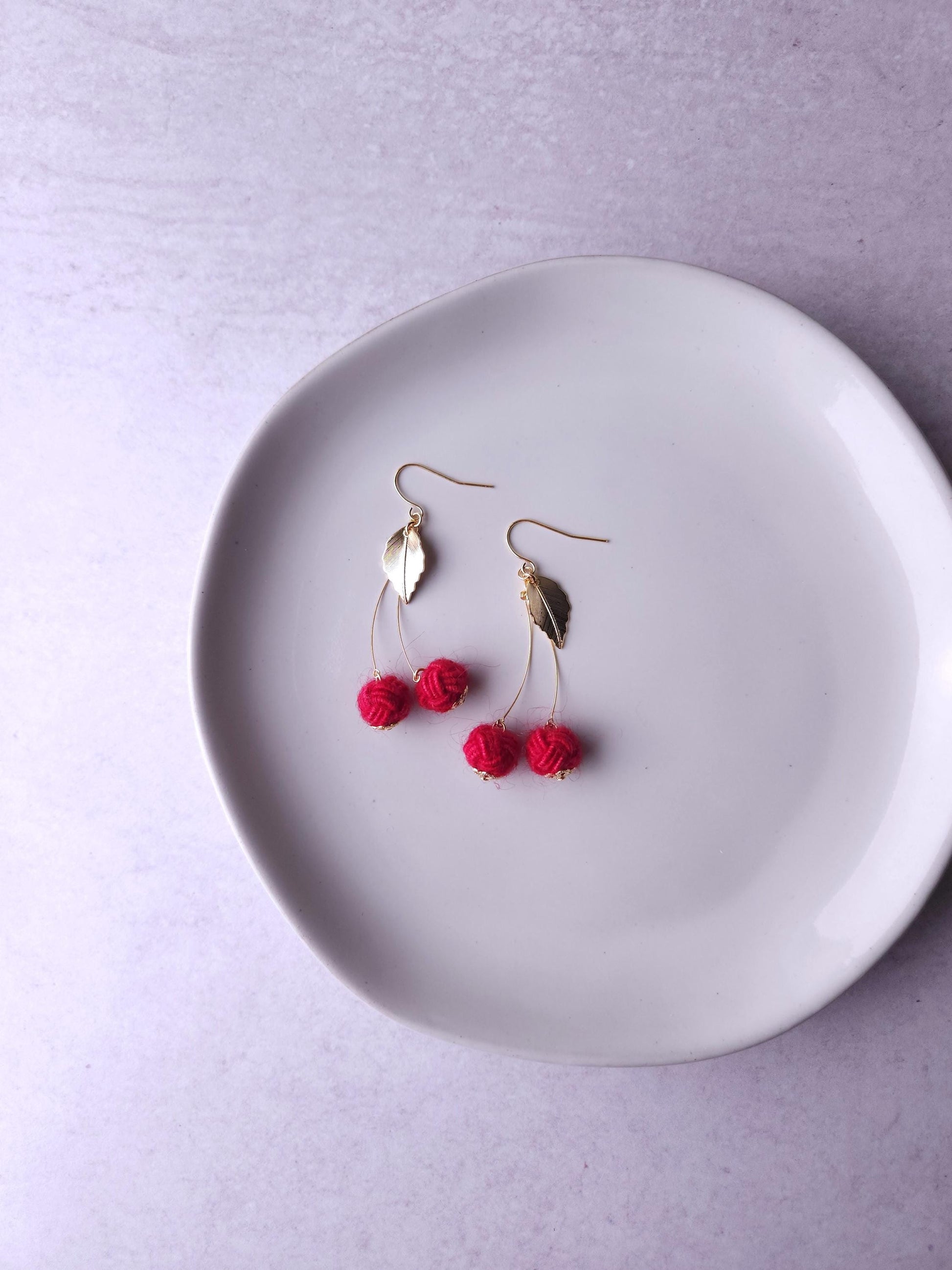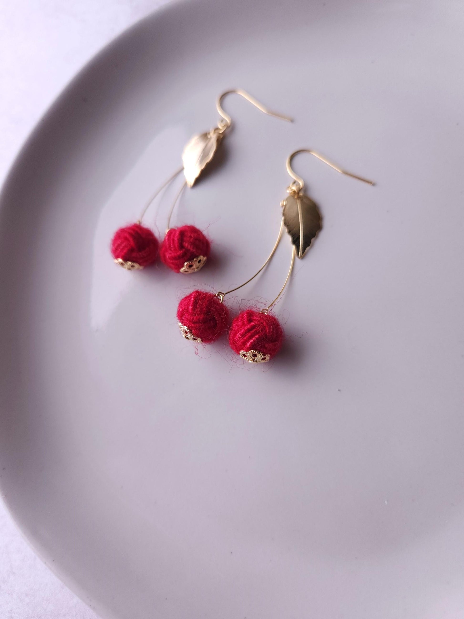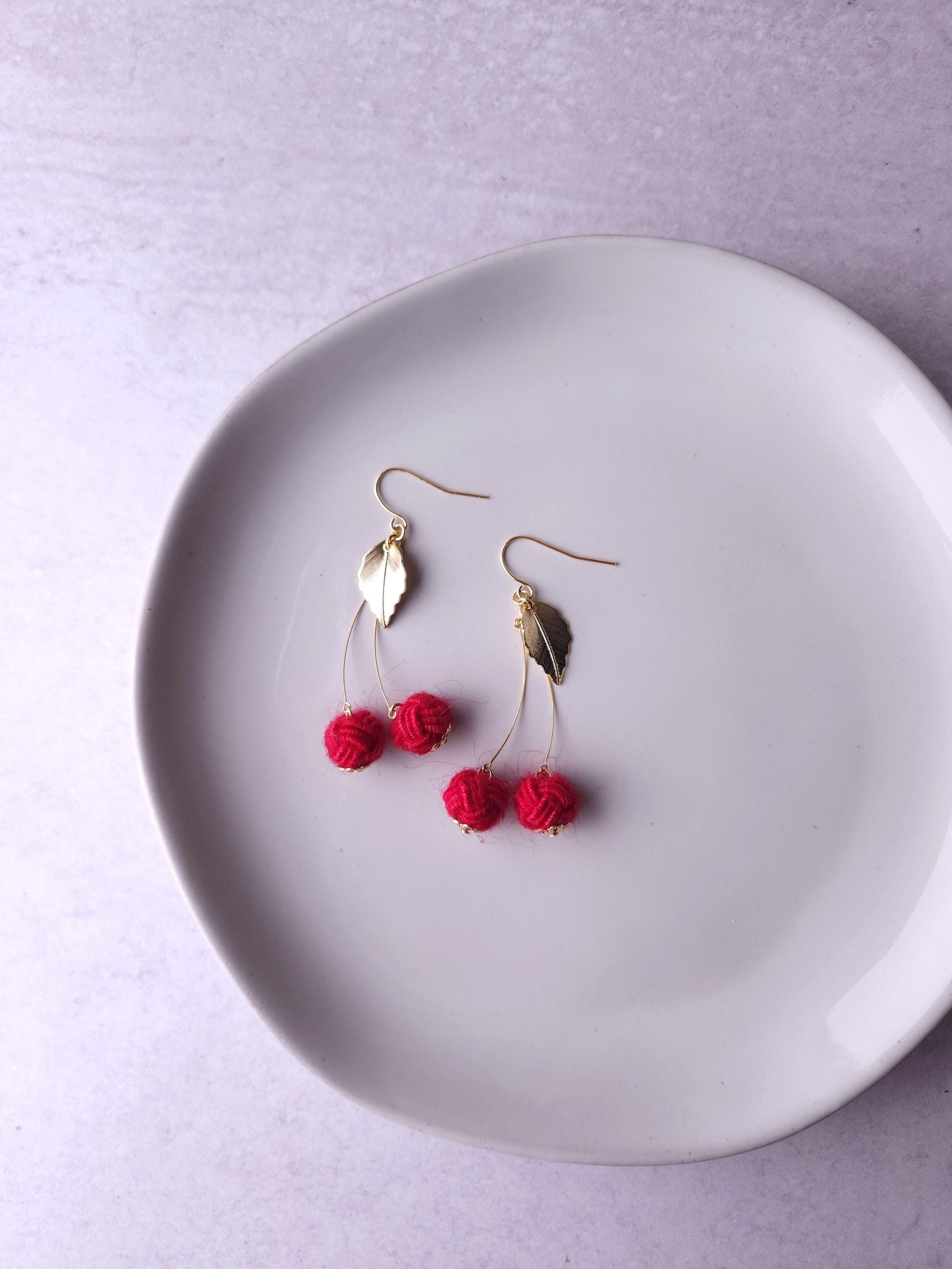A sweet little nod to nature-these cherry-inspired earrings feature fuzzy mohair yarn "fruits" paired with delicate gold leaf charms.