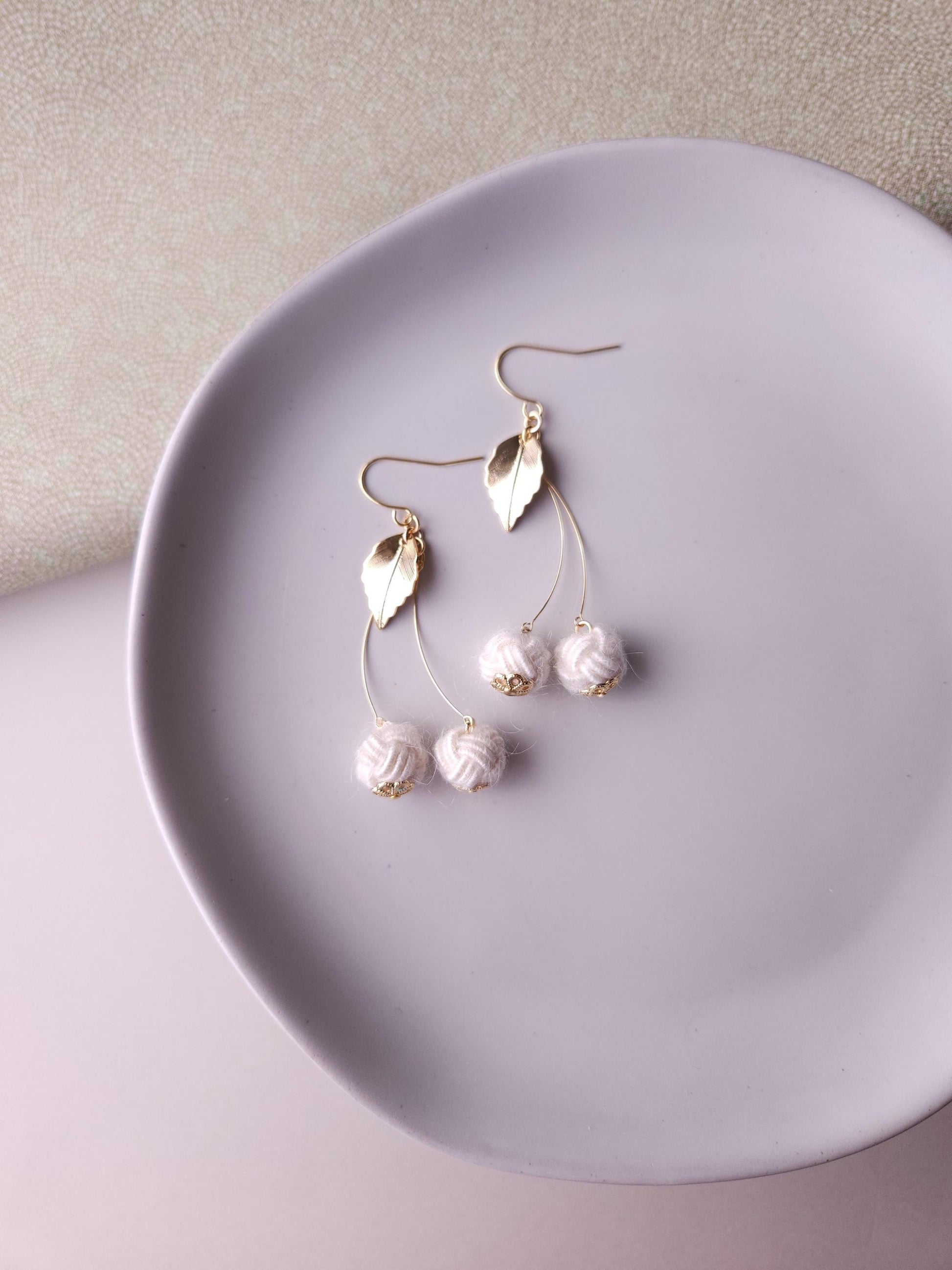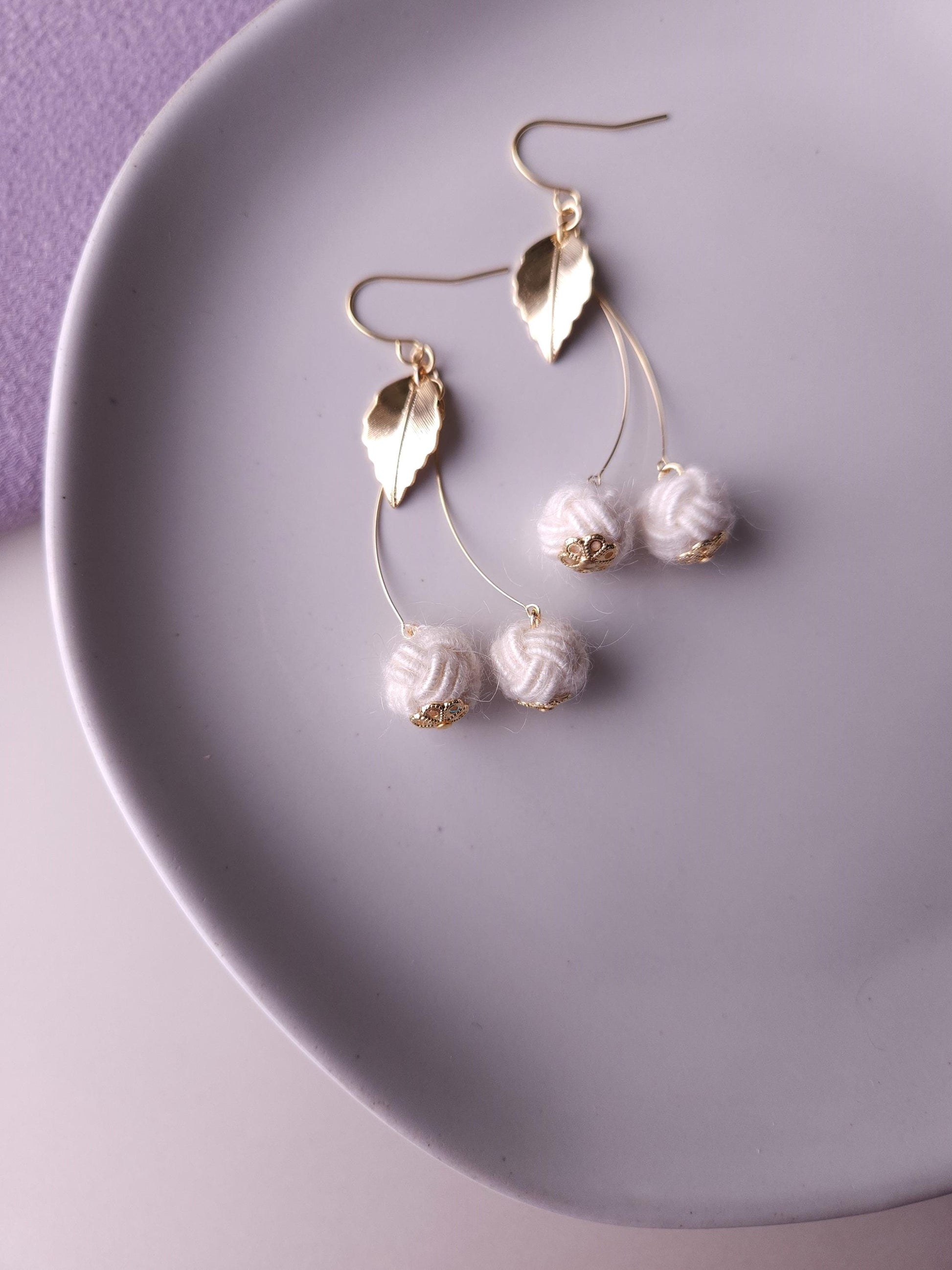 A sweet little nod to nature-these cherry-inspired earrings feature fuzzy mohair yarn "fruits" paired with delicate gold leaf charms.