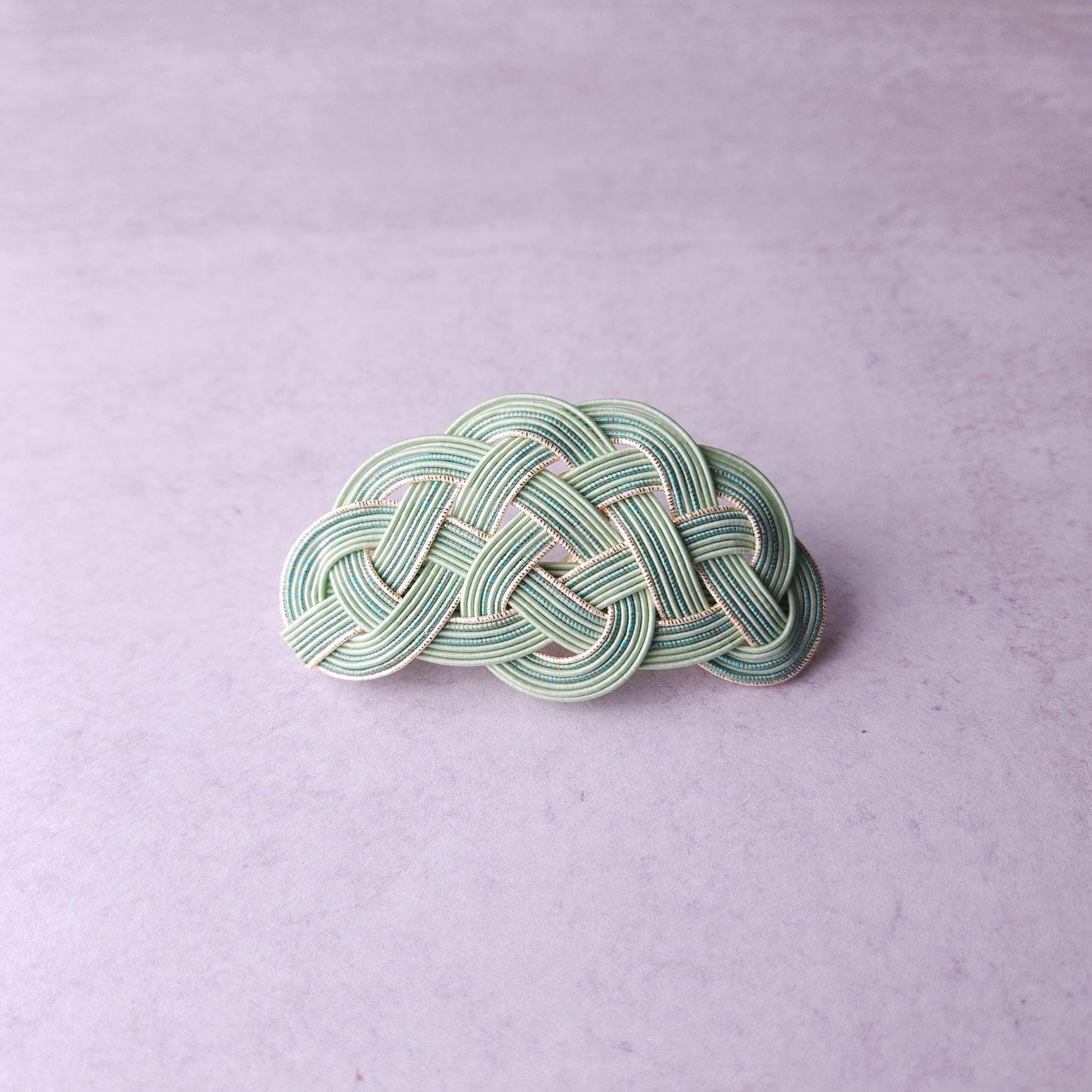 This elegant hair barrette is meticulously handcrafted using traditional Japanese Mizuhiki cords, featuring the Pine Knot technique, symbolizing longevity and good fortune. The intricate weaving showcases timeless craftsmanship, making it a perfect accessory for both everyday wear and special occasions.