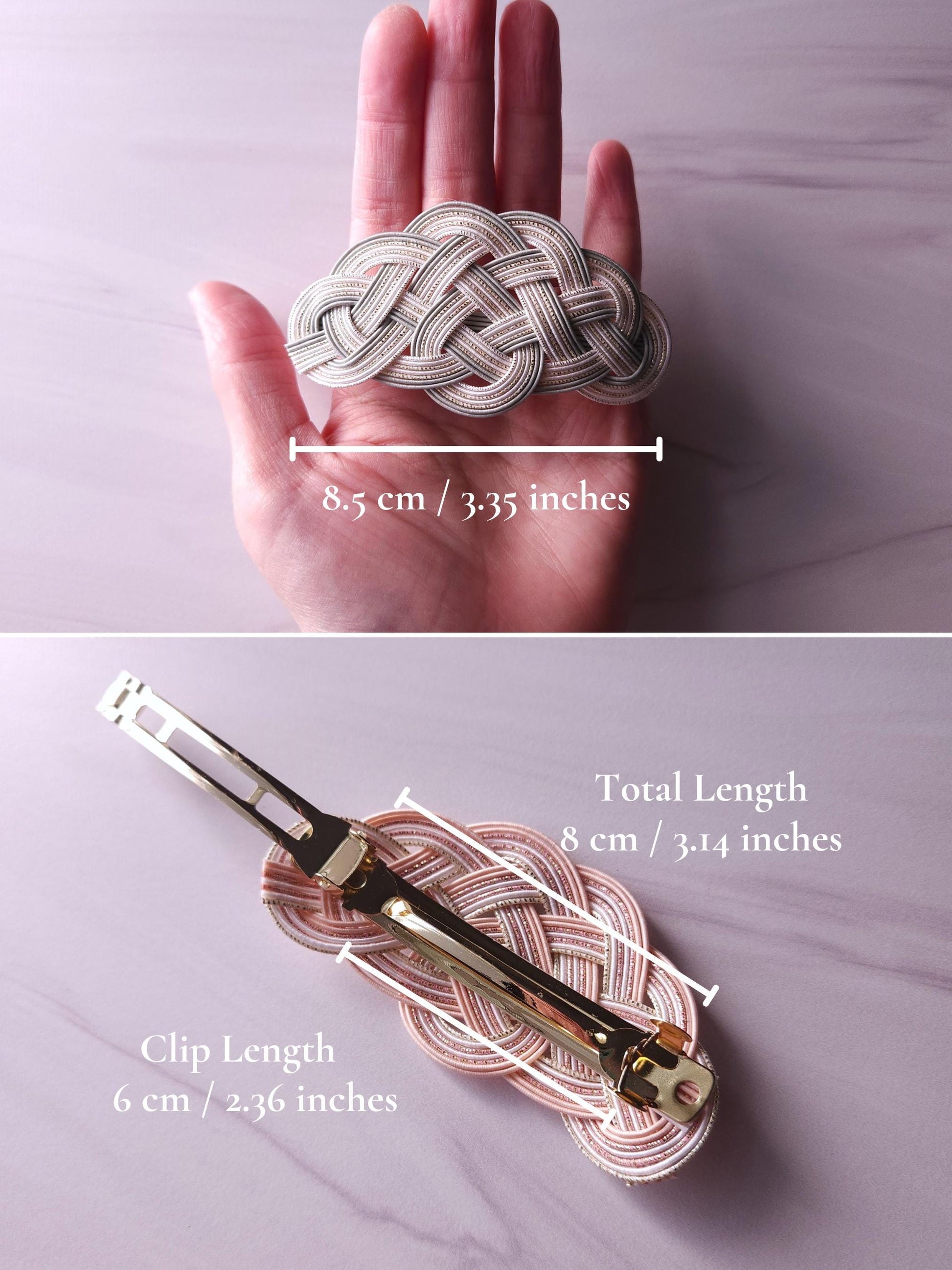 This elegant hair barrette is meticulously handcrafted using traditional Japanese Mizuhiki cords, featuring the Pine Knot technique, symbolizing longevity and good fortune. The intricate weaving showcases timeless craftsmanship, making it a perfect accessory for both everyday wear and special occasions.