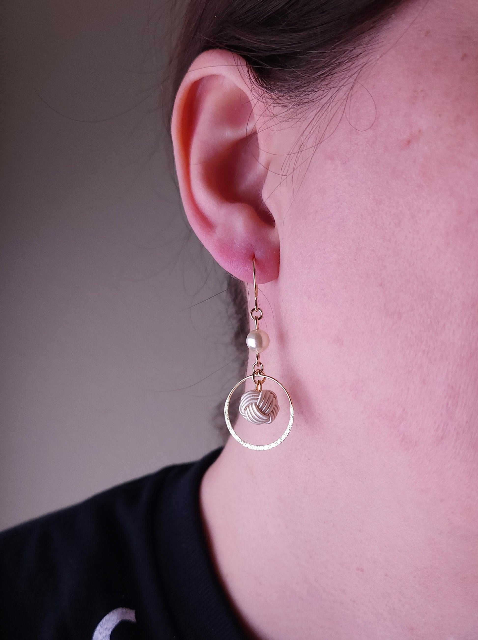Each ball knots are meticulously handwoven and suspended inside a textured gold-tone ring and topped with a shimmering glass pearl pearls, each earring captures movement, light, and elegance in perfect balance.