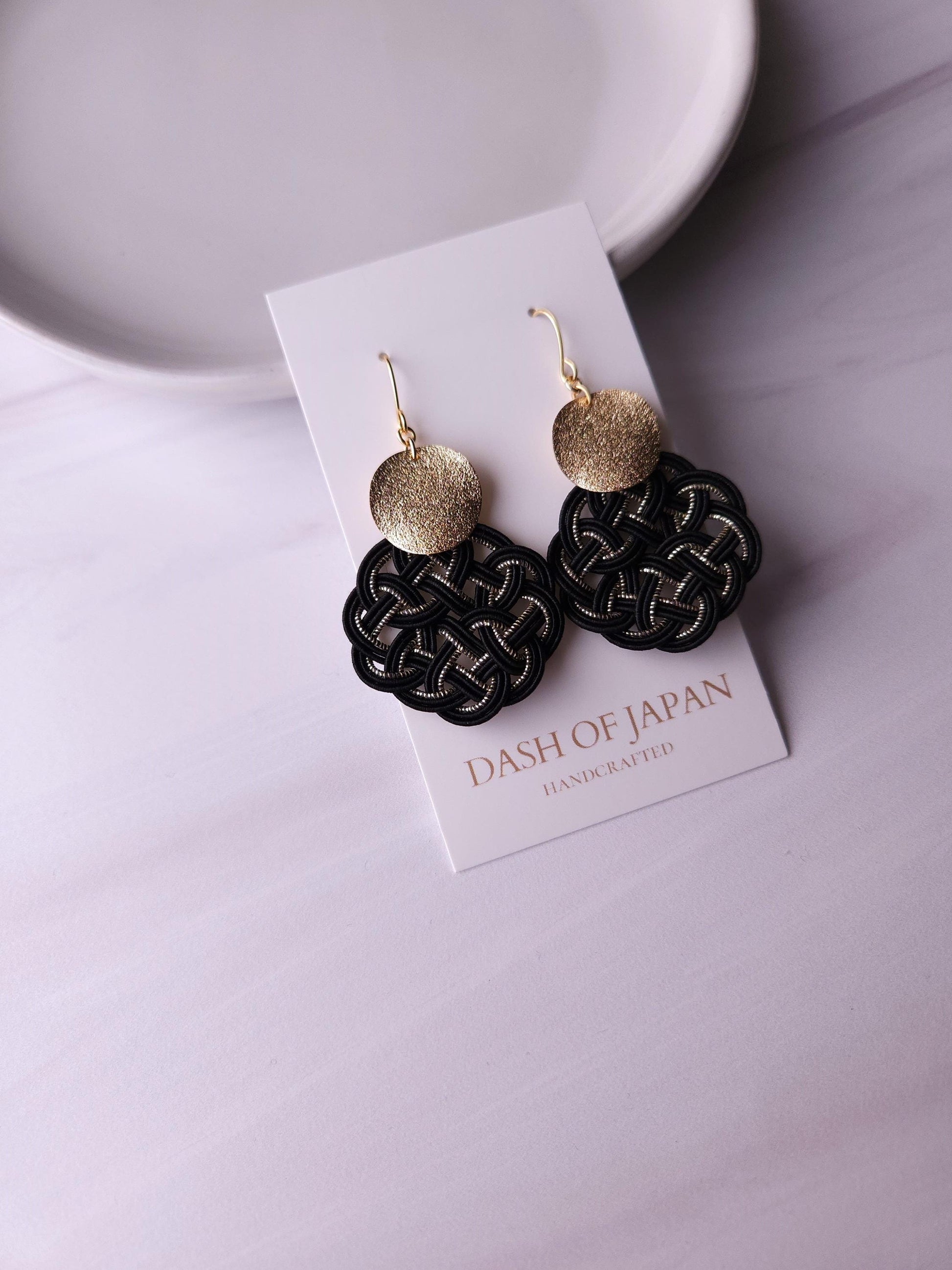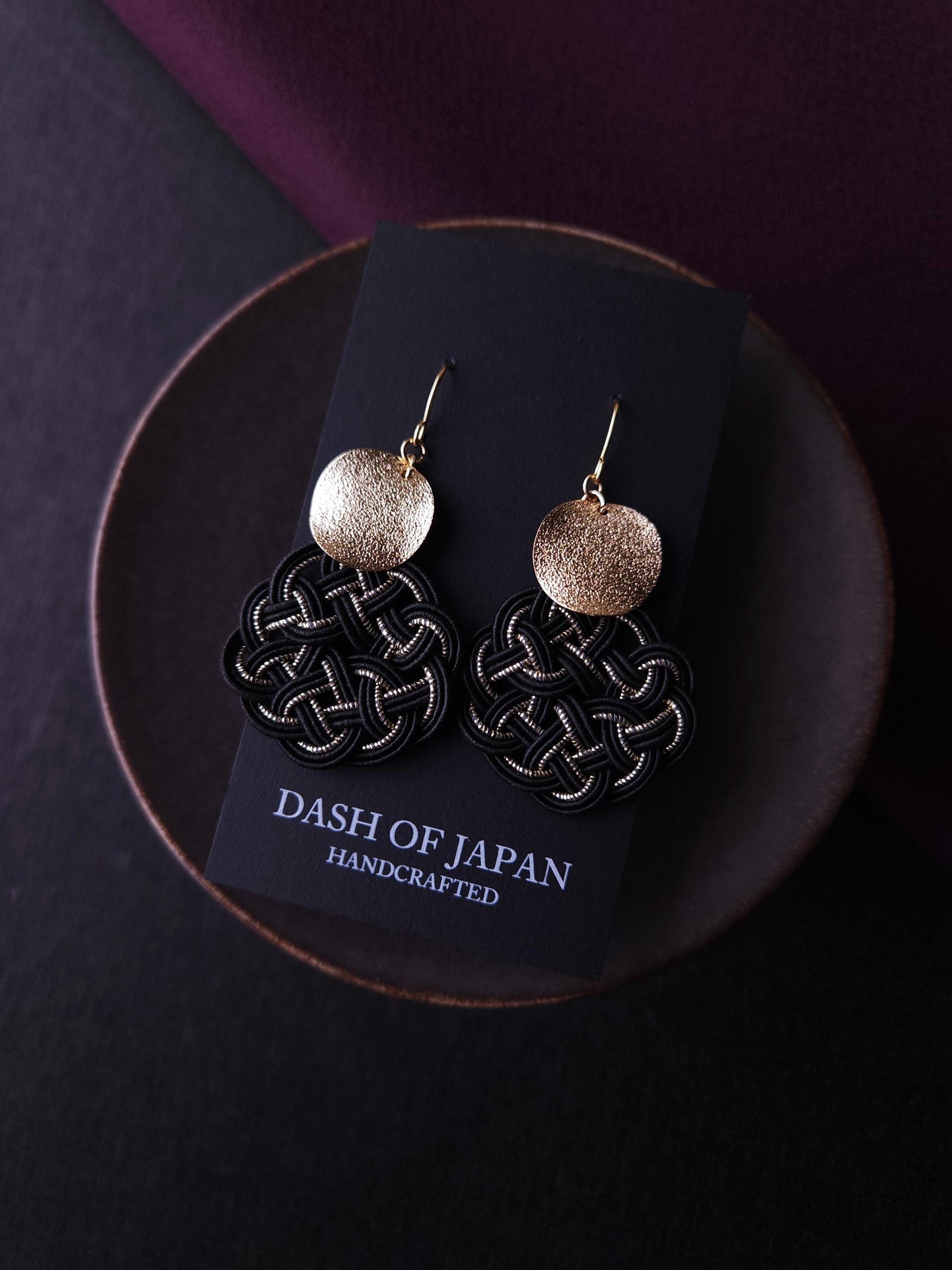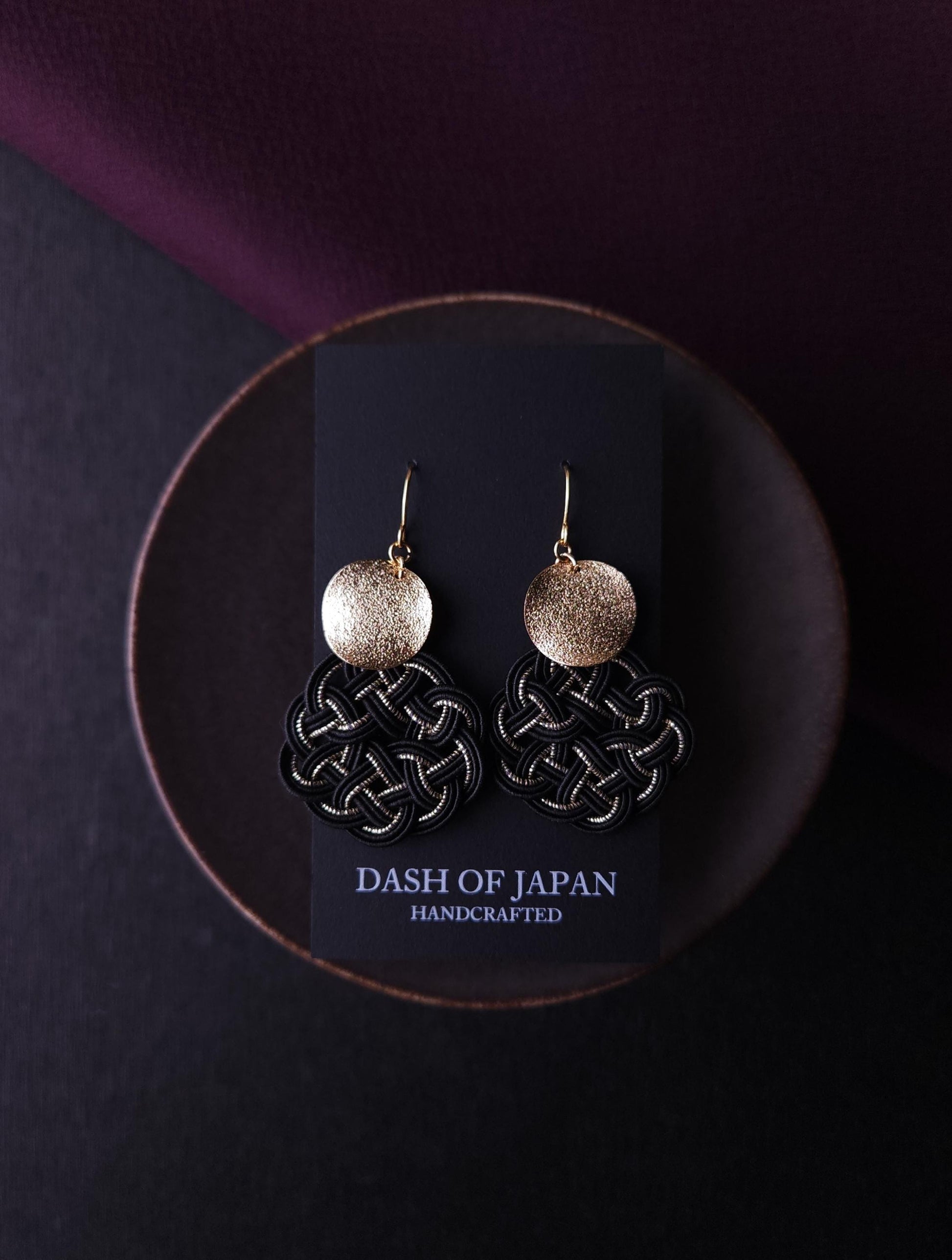 Each pieces are carefully handwoven into infinity knots with Mizuhiki and matched with shiny round metal parts.