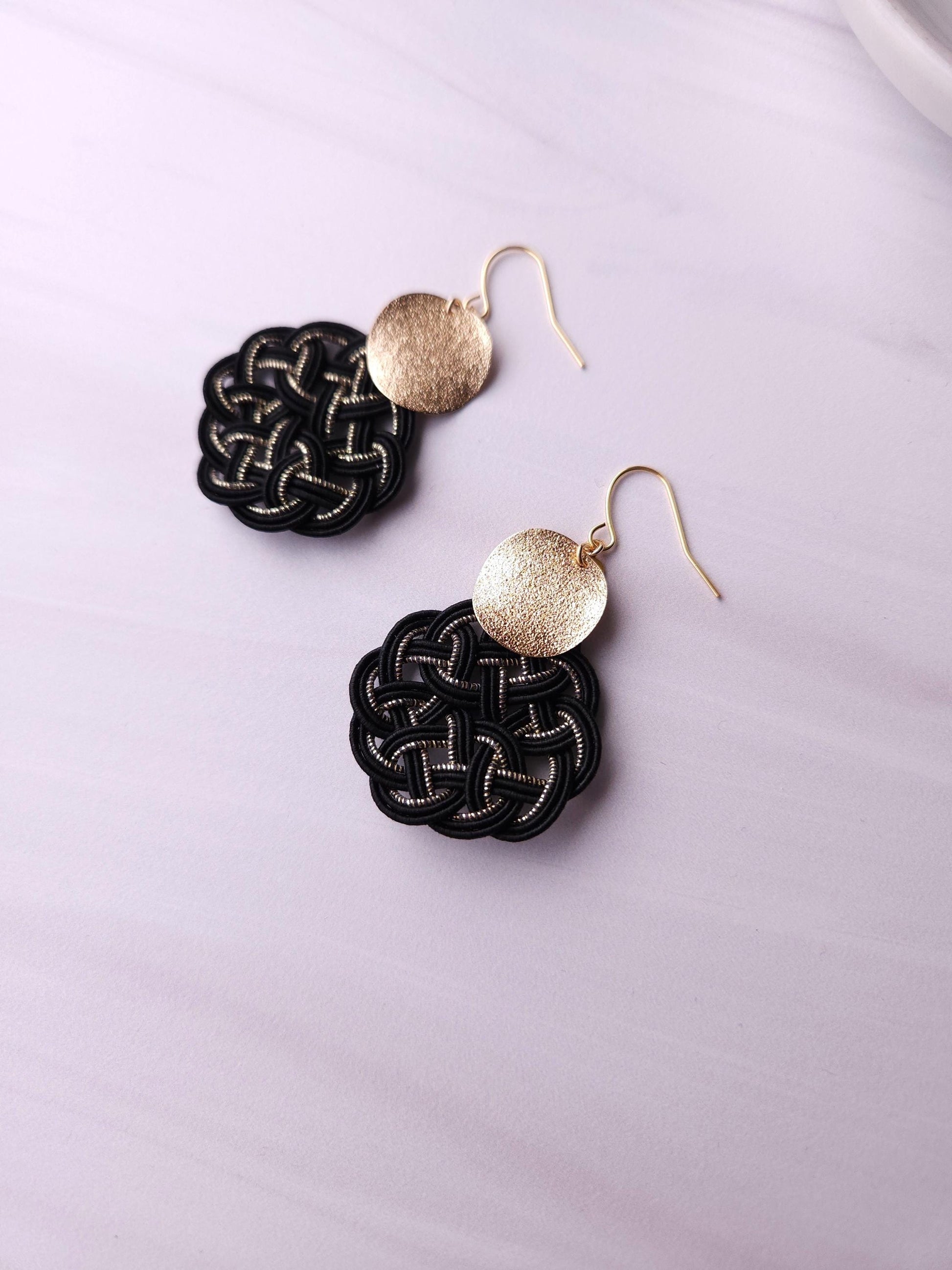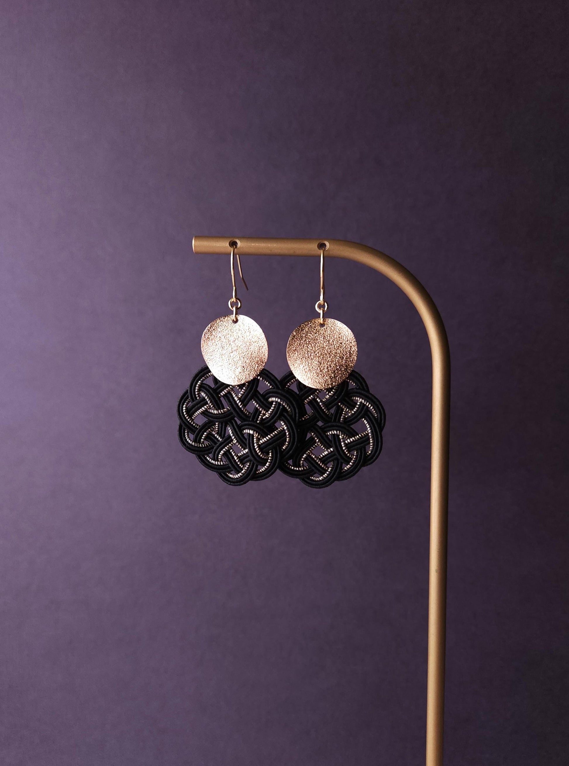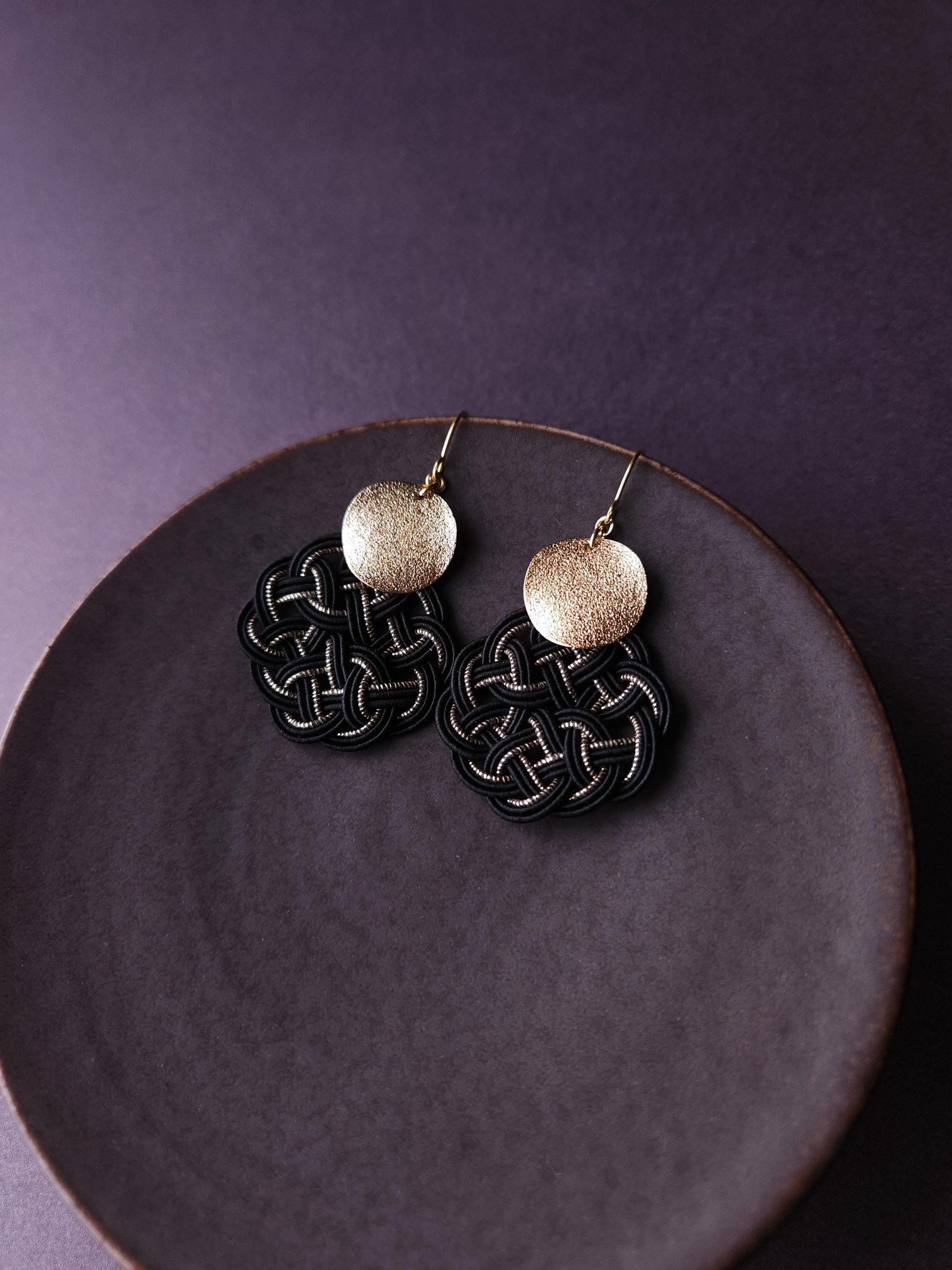 Each pieces are carefully handwoven into infinity knots with Mizuhiki and matched with shiny round metal parts.