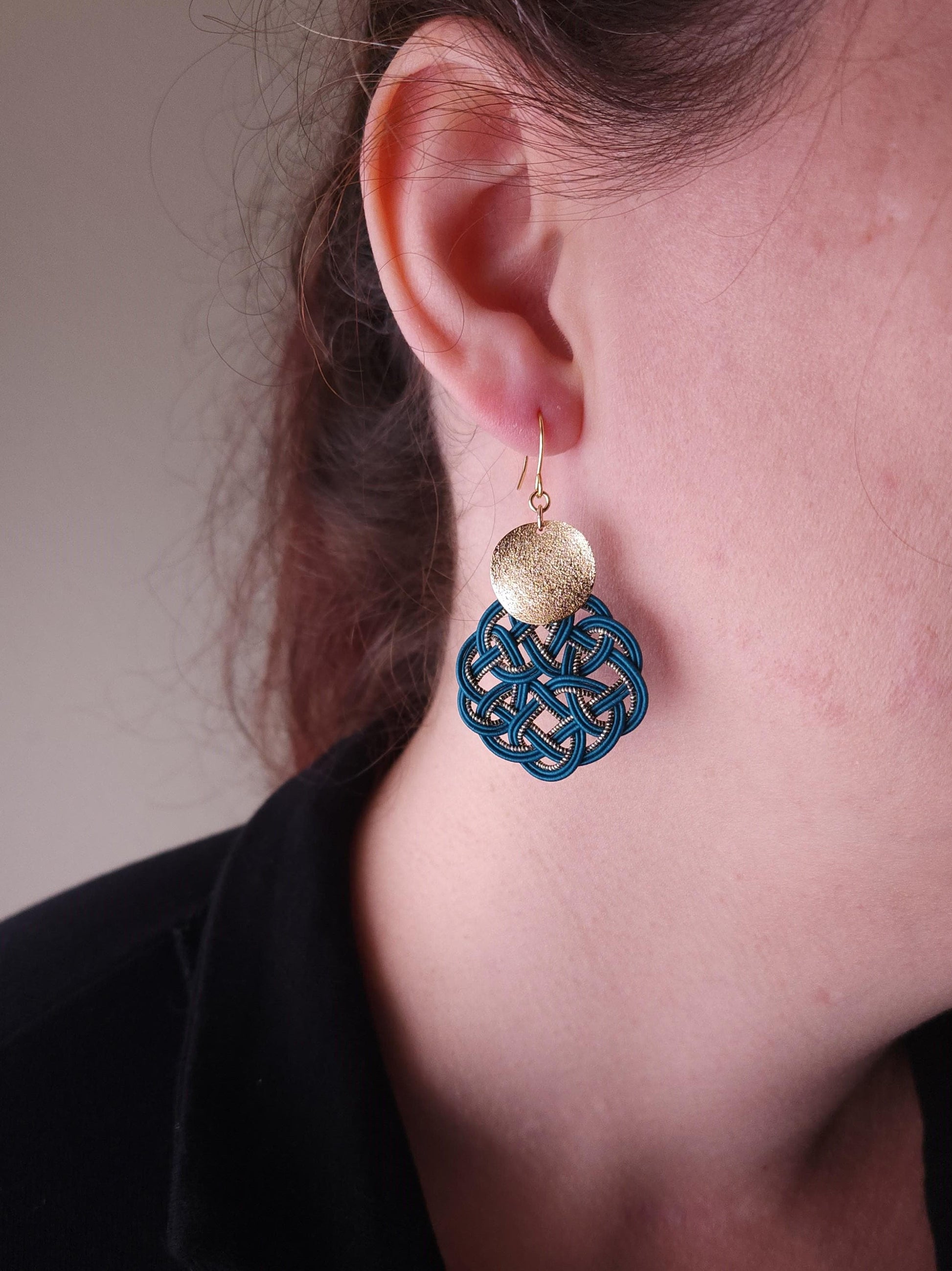 Handwoven earrings made with Japanese paper cord called Mizuhiki.