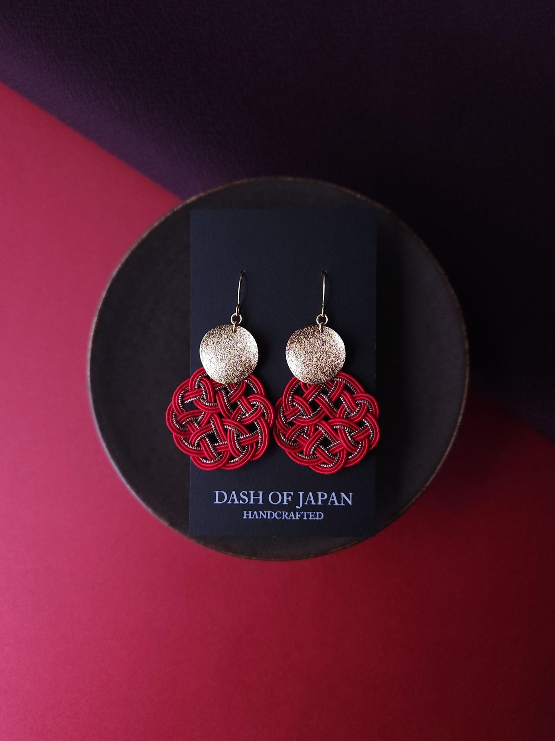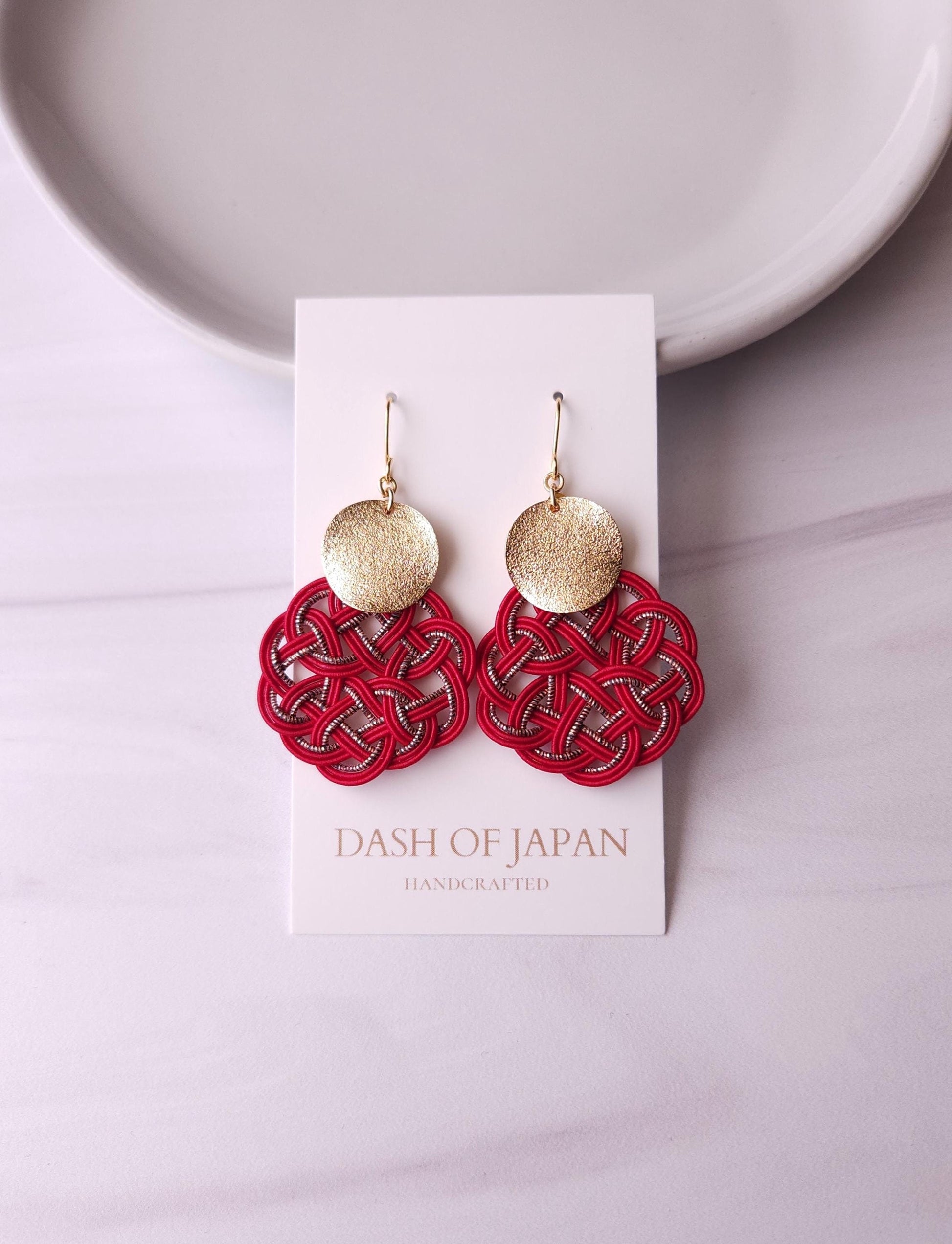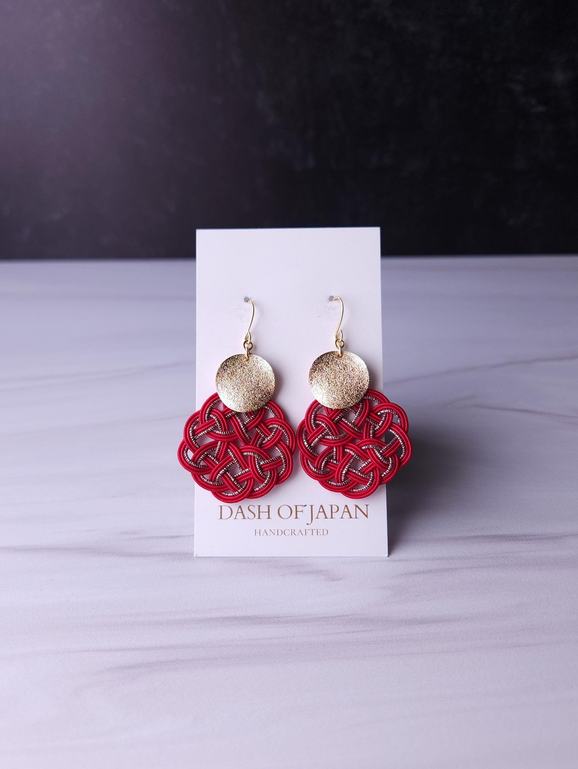 Each pieces are carefully handwoven into infinity knots with Mizuhiki and matched with shiny round metal parts.