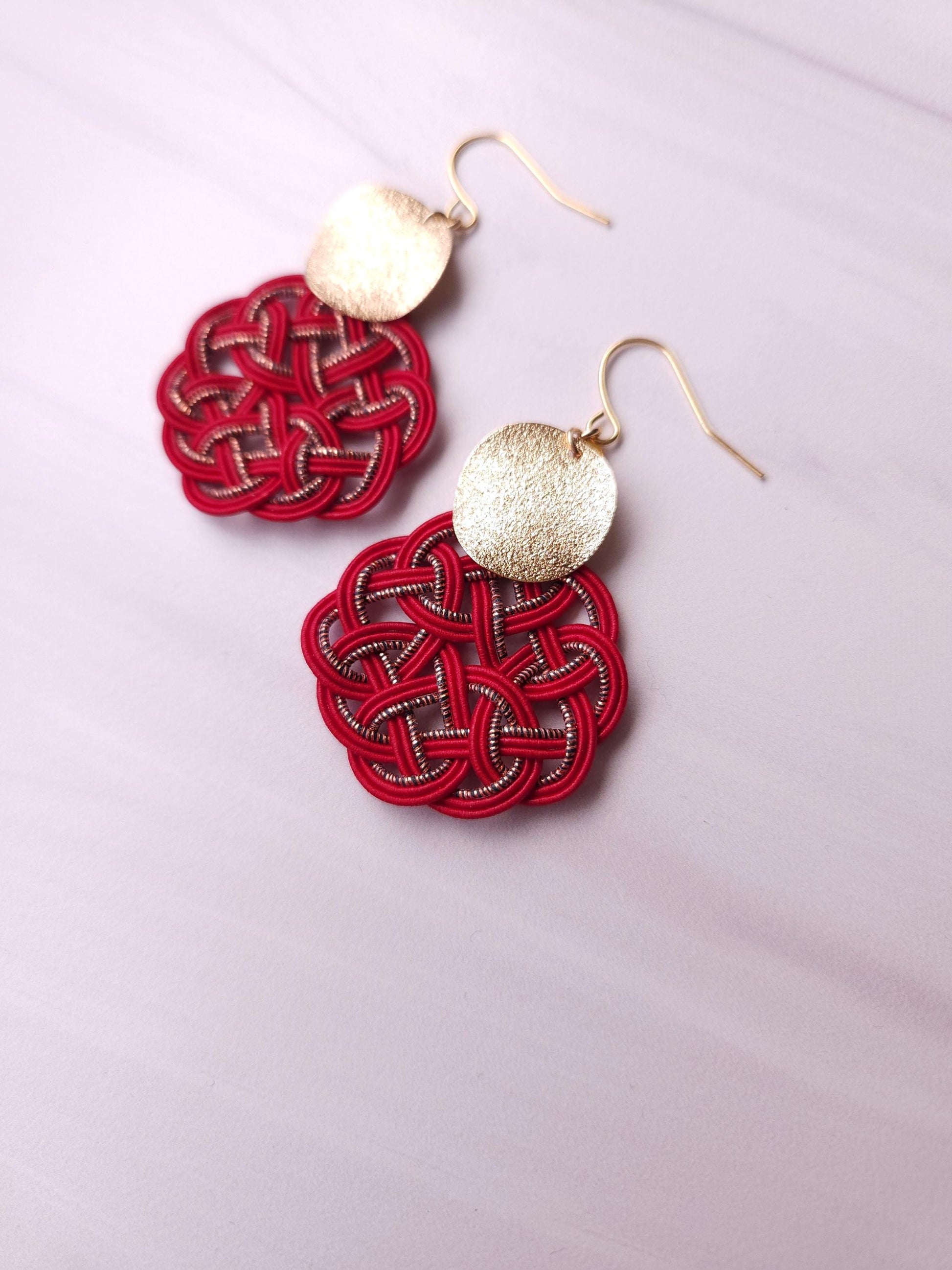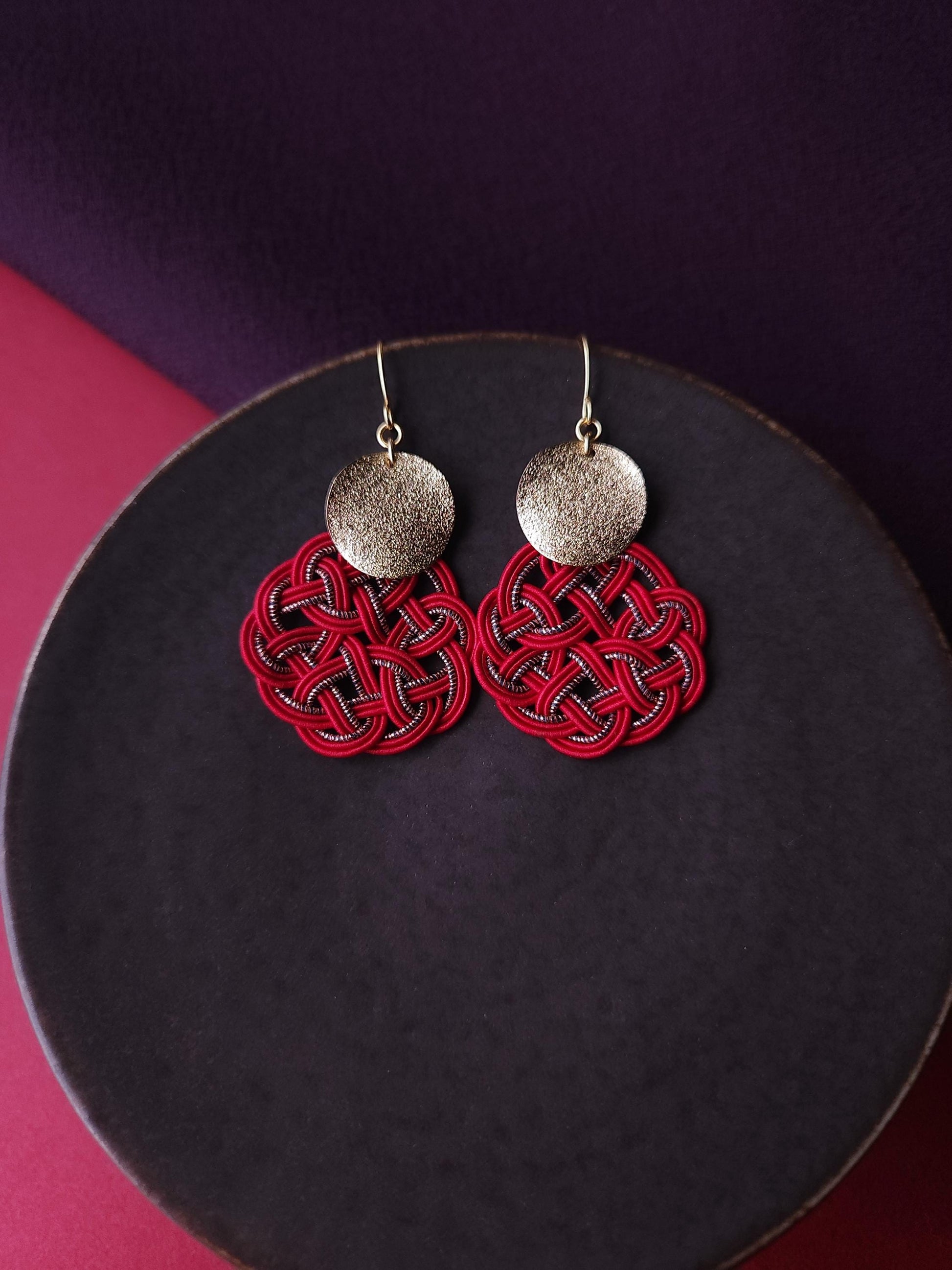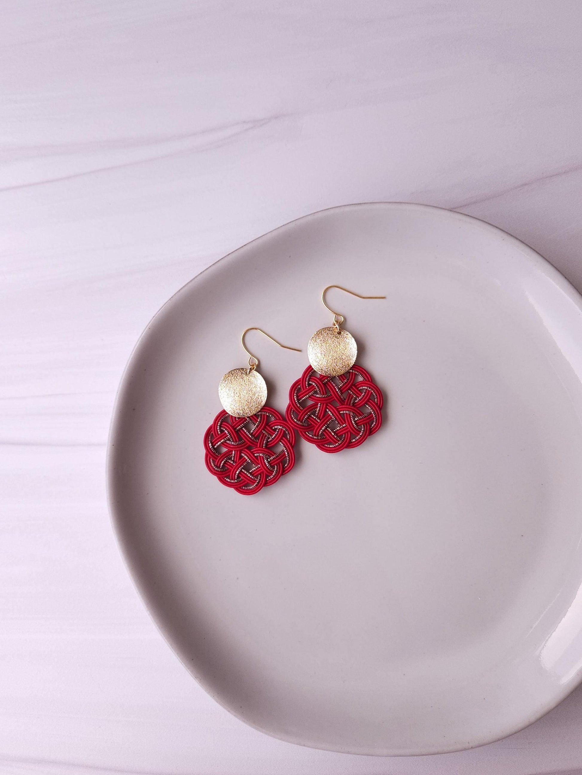 Each pieces are carefully handwoven into infinity knots with Mizuhiki and matched with shiny round metal parts.