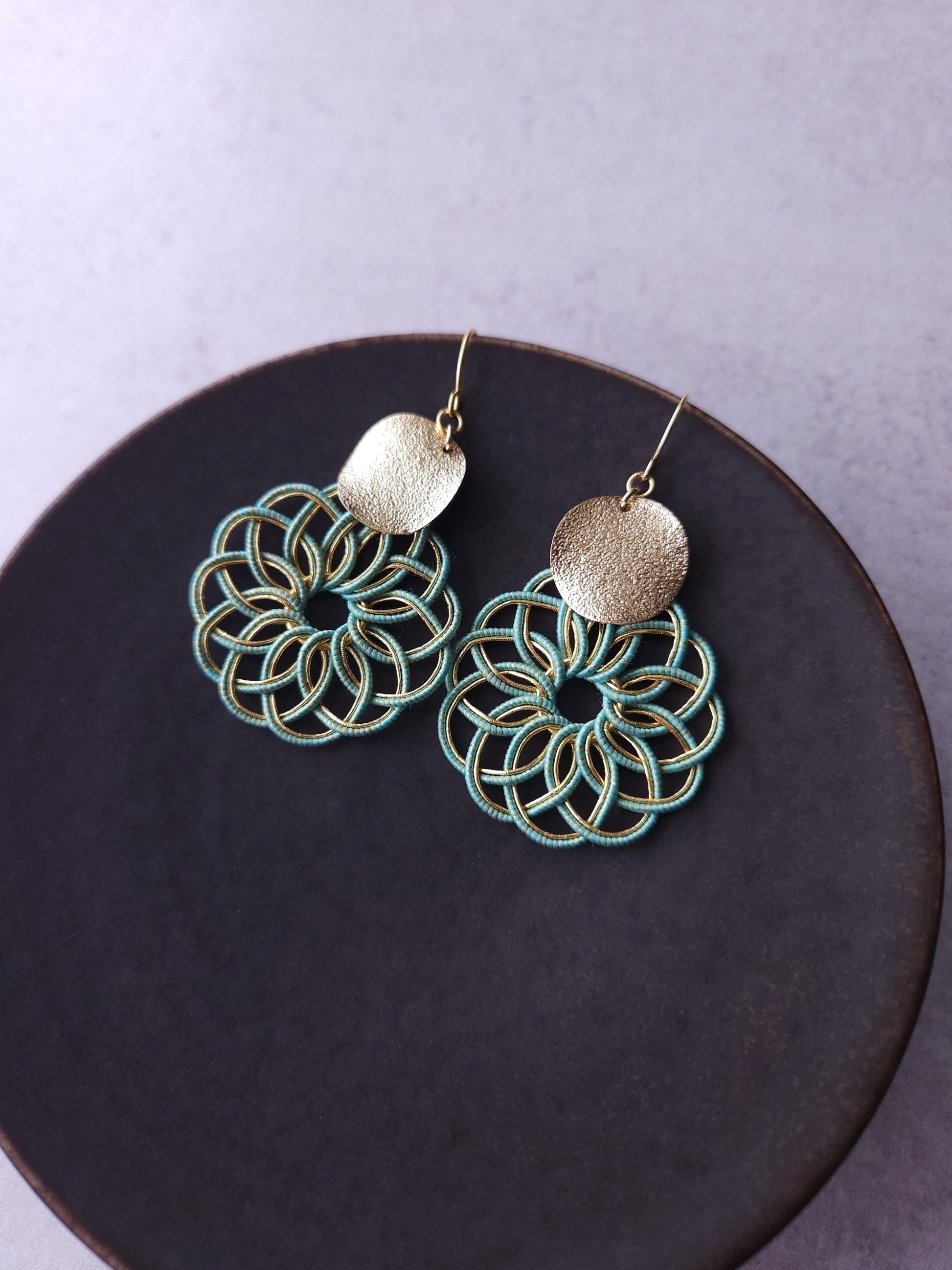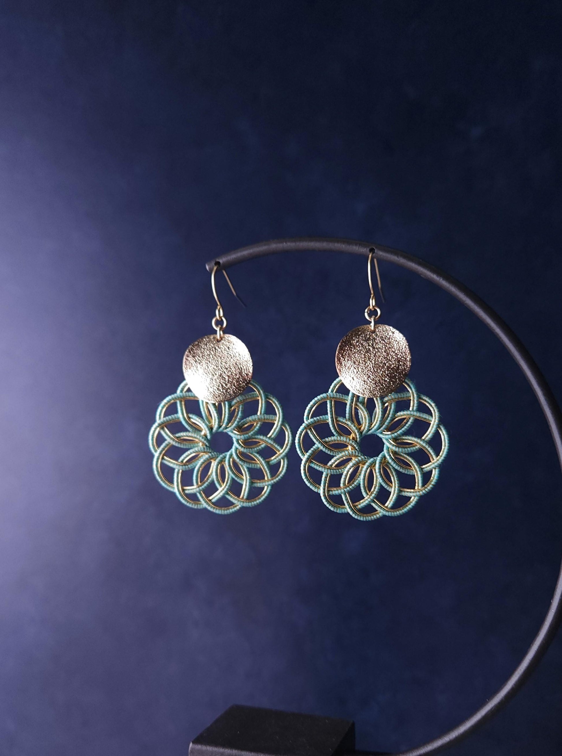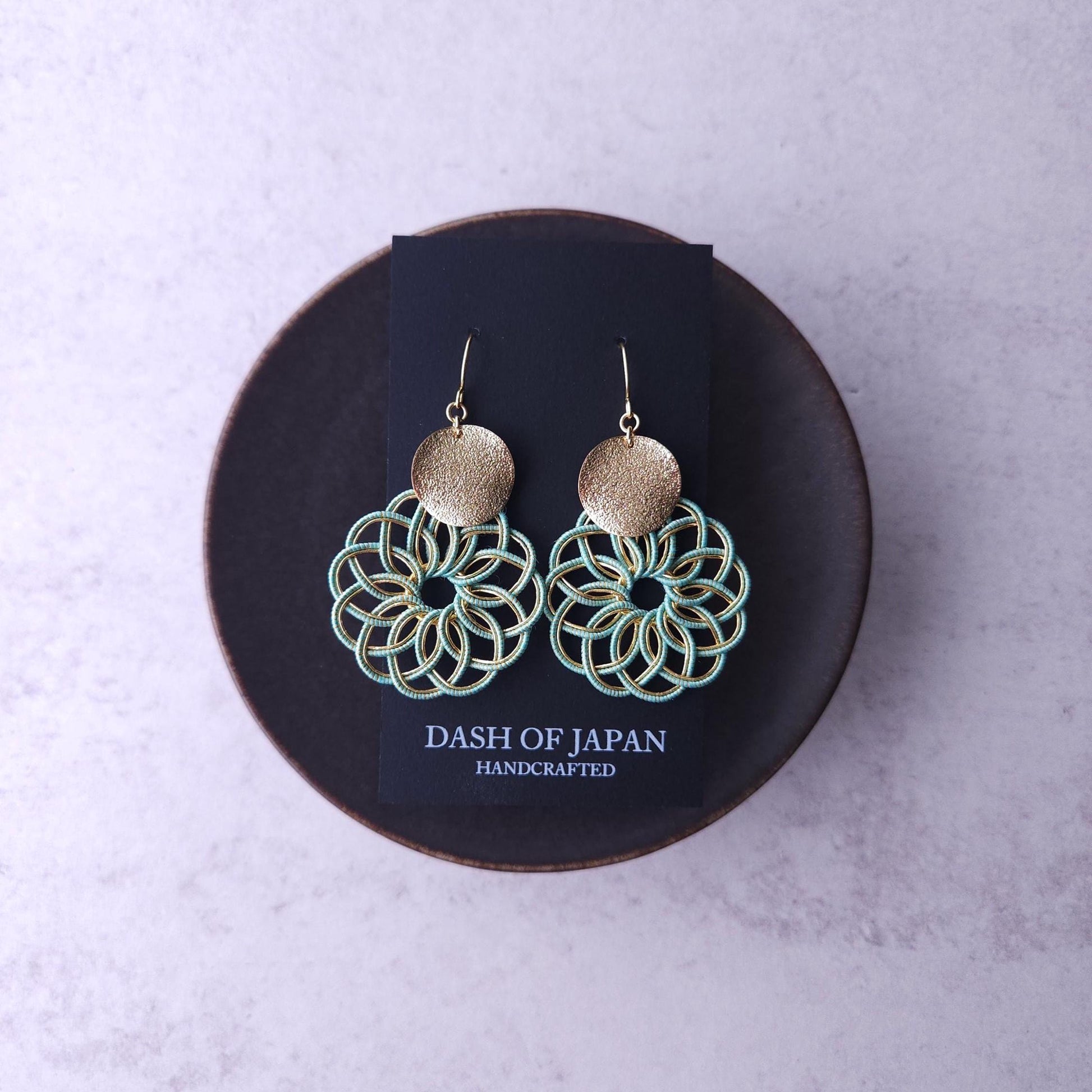 Each pieces are carefully handwoven into infinity Mandala knots with Mizuhiki and matched with textured gold-plated discs, enhancing the lightweight yet eye-catching design. Perfect for special occasions or adding a unique flair to your everyday style, these earrings blend Japanese craftsmanship with contemporary elegance.