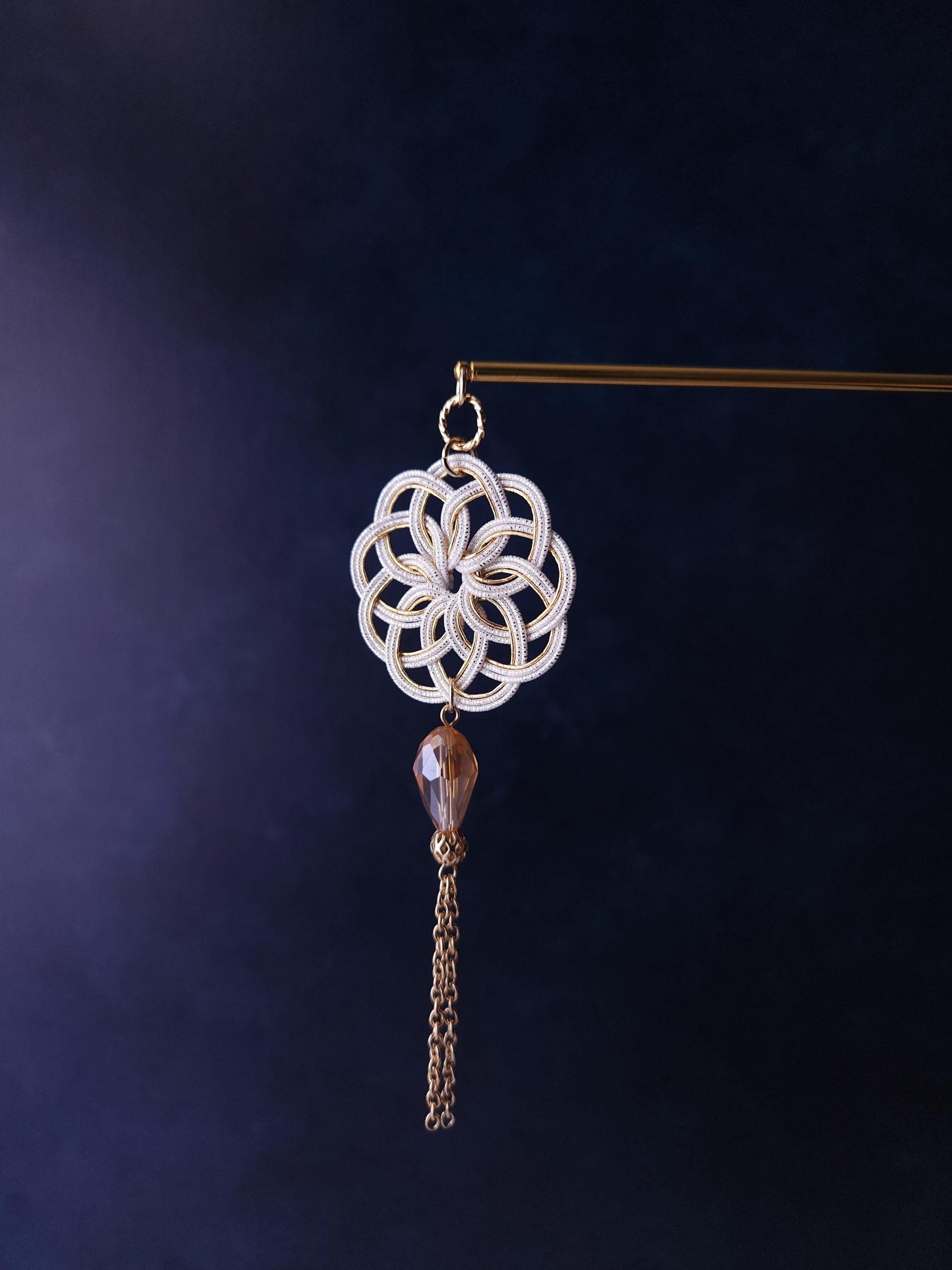 Mizuhiki cord is handwoven into infinity geometric knot, matched with elegant chain with crystal beads. Since Mizuhiki is made of paper, practically weightless causing no burden to the wearer's neck.