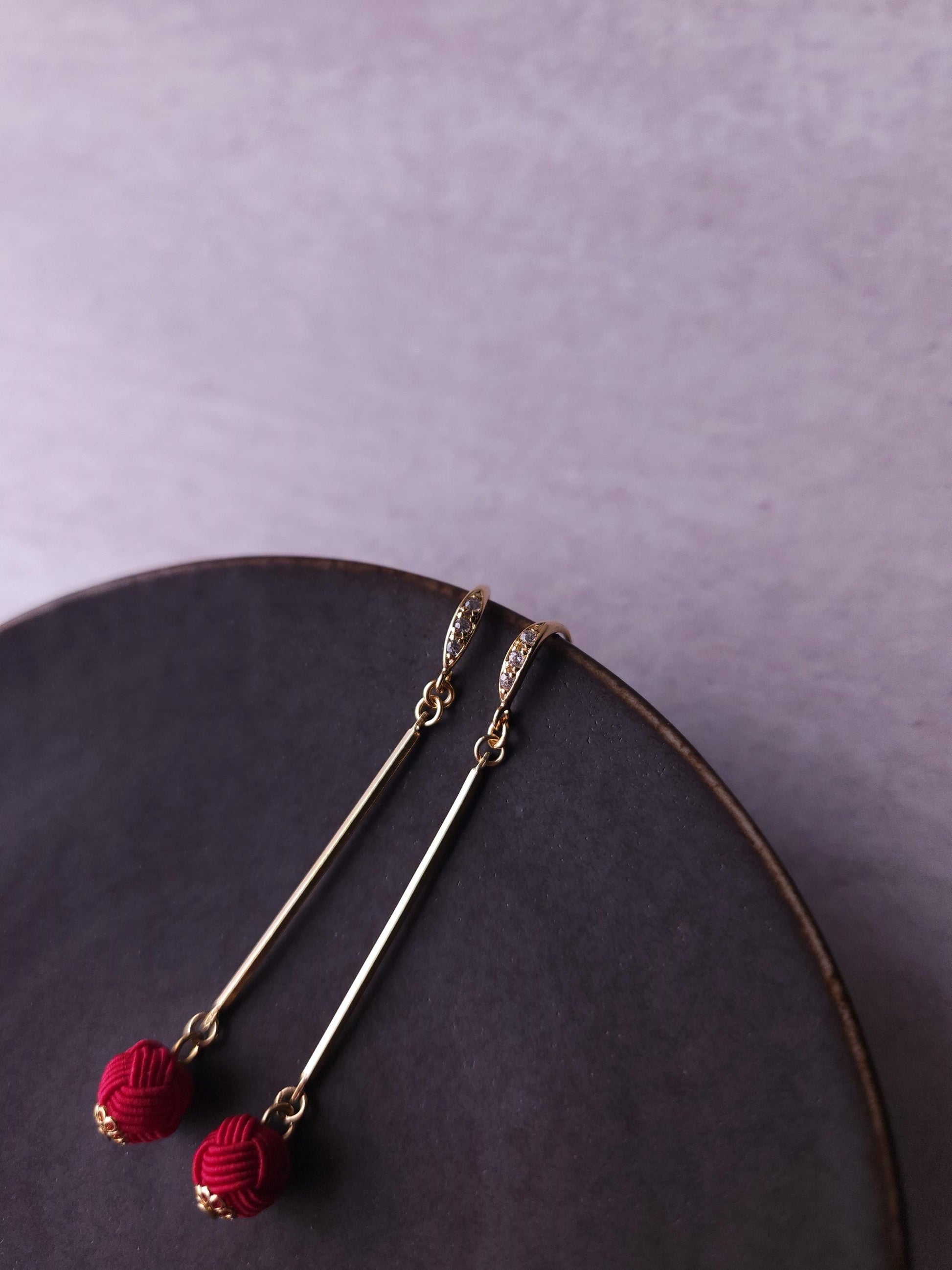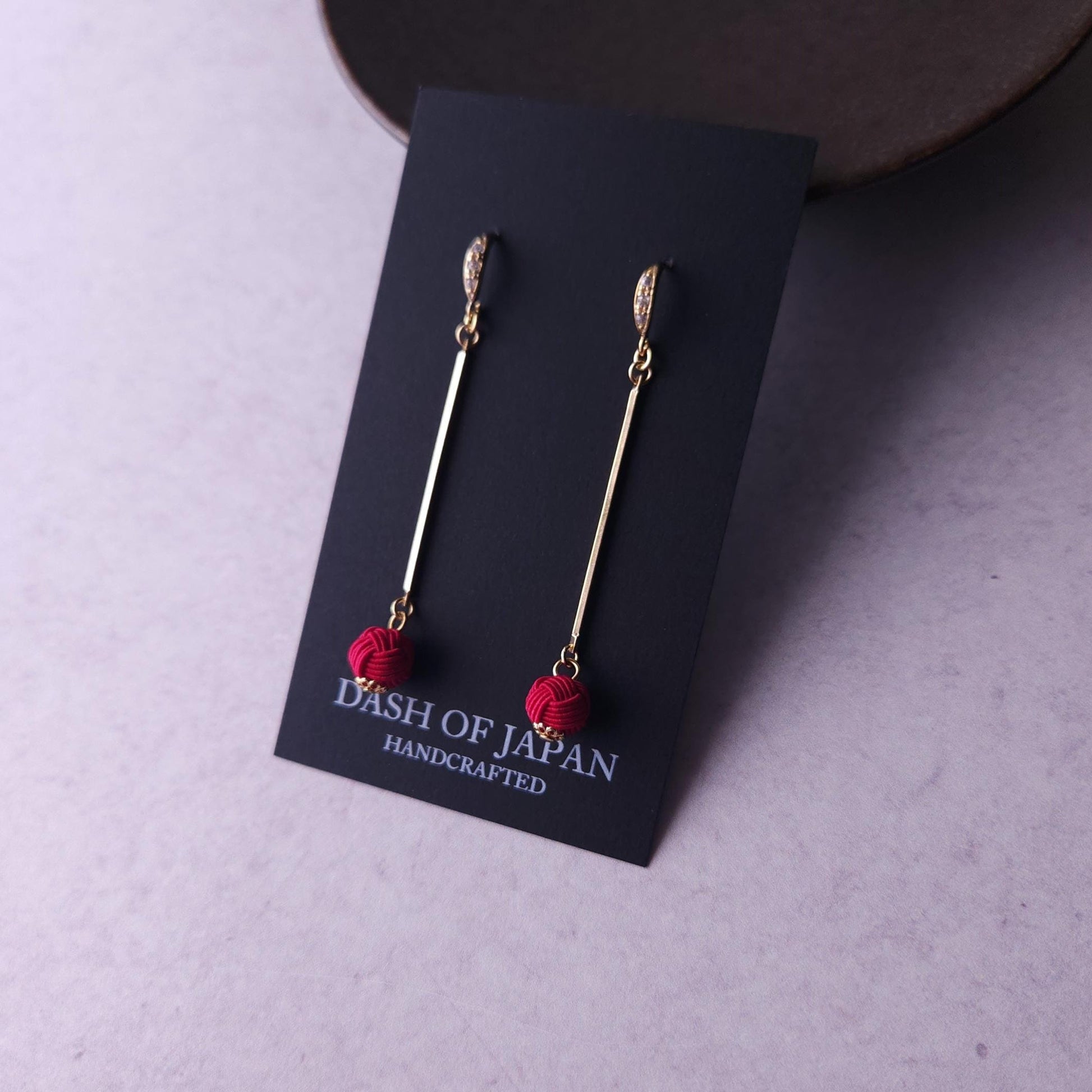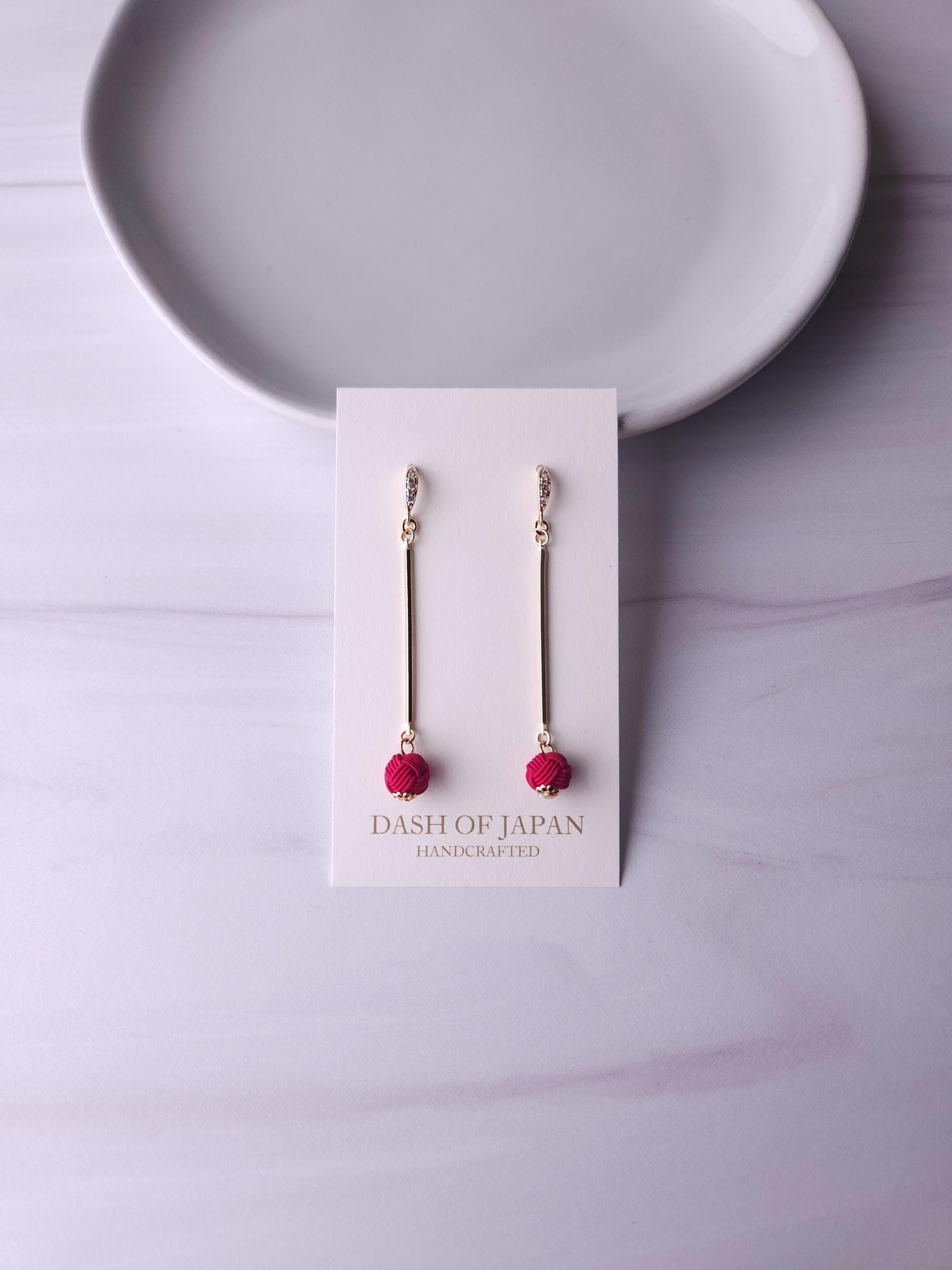 Each knots are meticulously crafted with ultra-fine Mizuhiki cords and delicately suspended from a sleek gold-tone bar. The design is minimal, yet the vibrant knot adds a subtle boldness-perfect for those who appreciate clean lines with a touch of traditional charm.