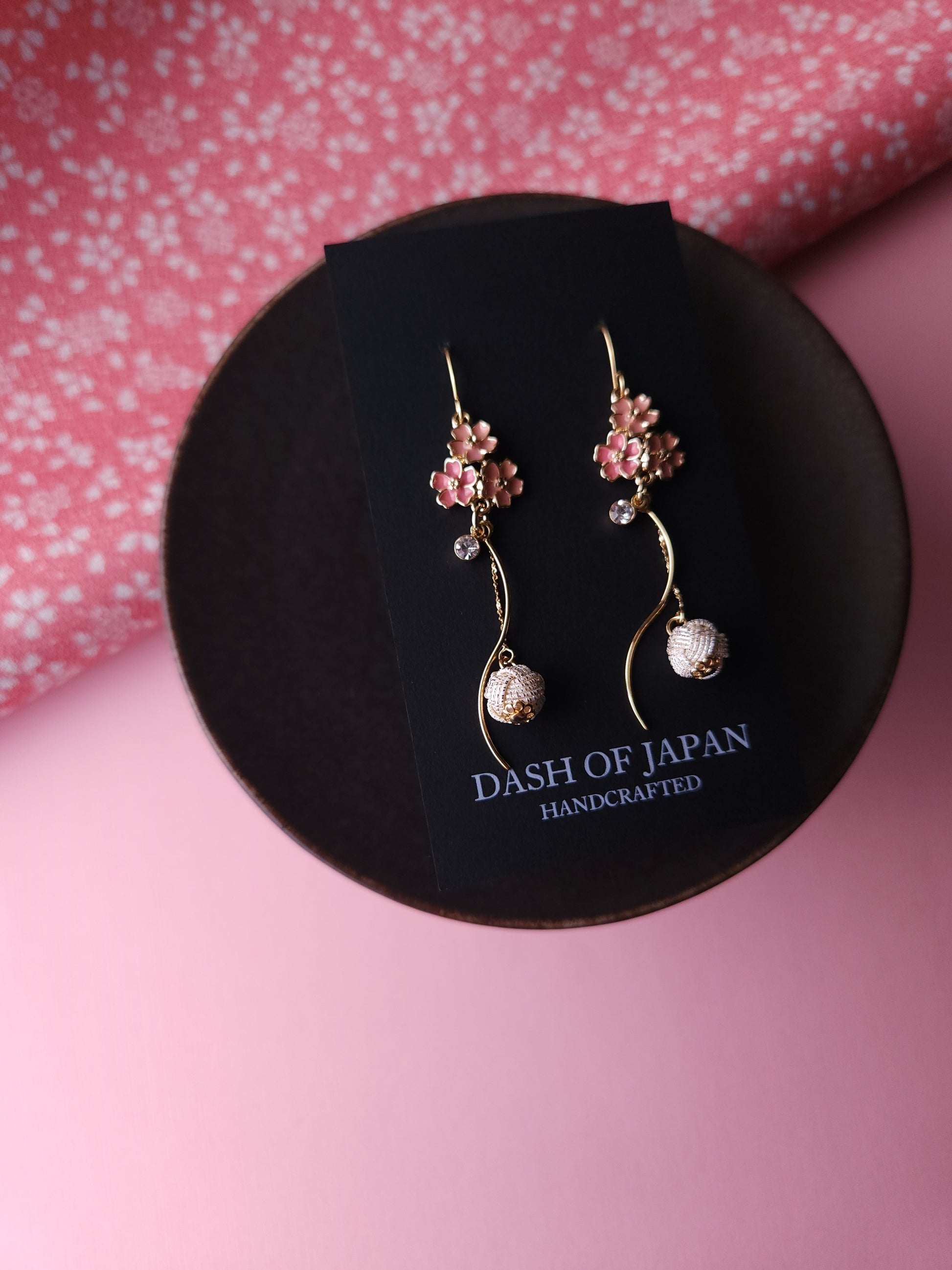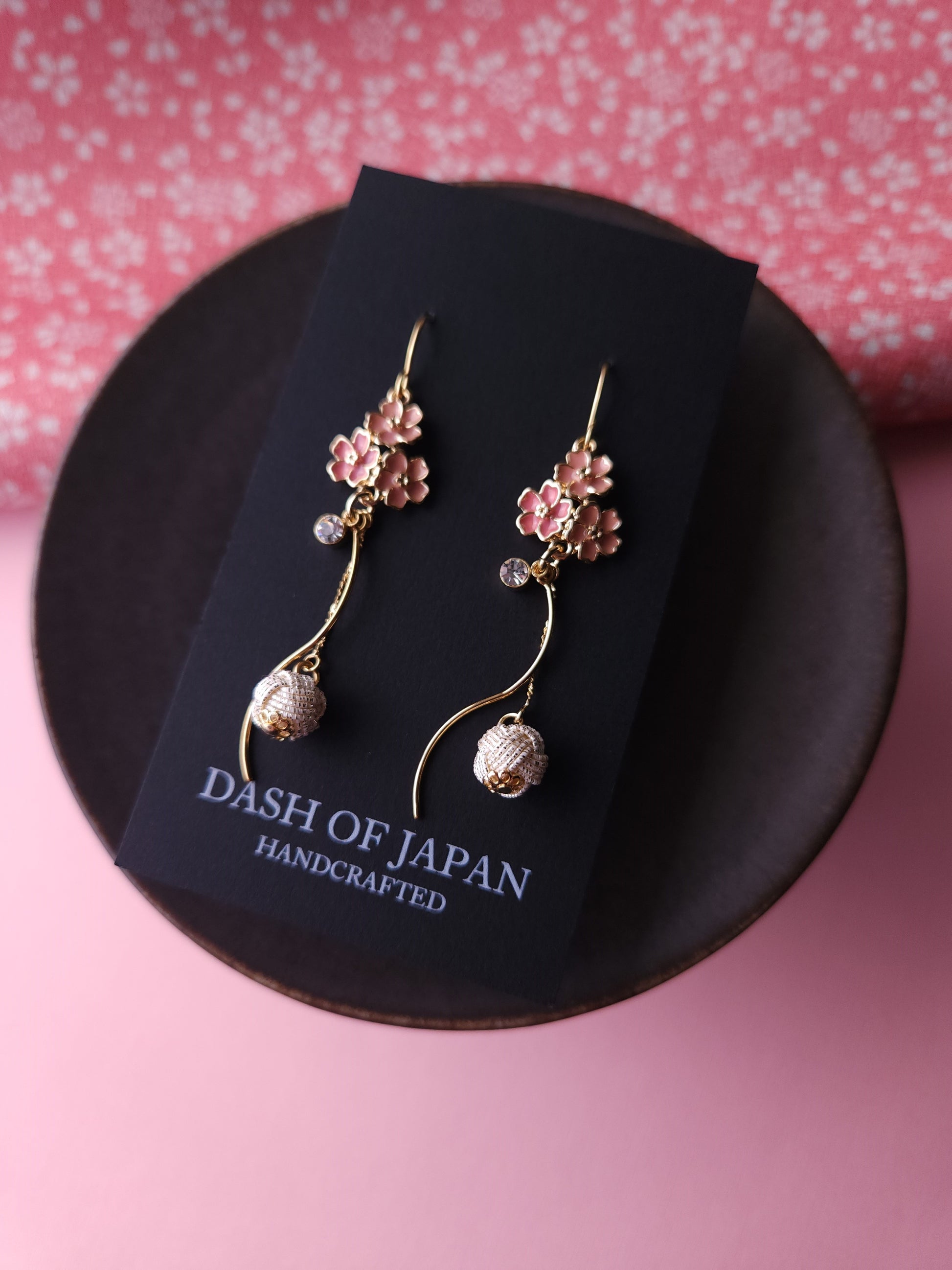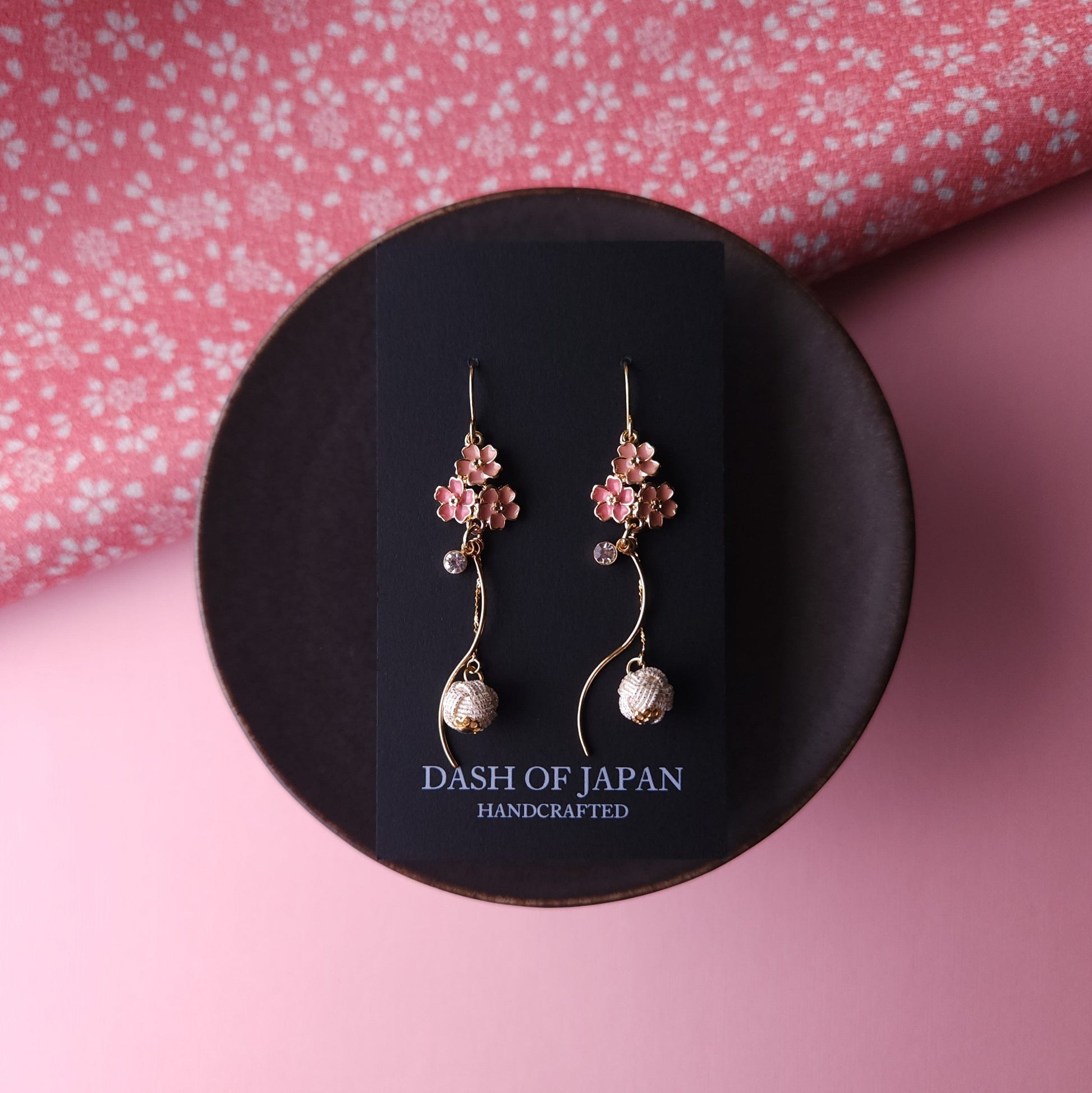These graceful earrings combine the traditional art of Mizuhiki with delicate cherry blossom motif charms. Each knots are meticulously handwoven with very thin type Mizuhiki cords, forming a delicate ball.