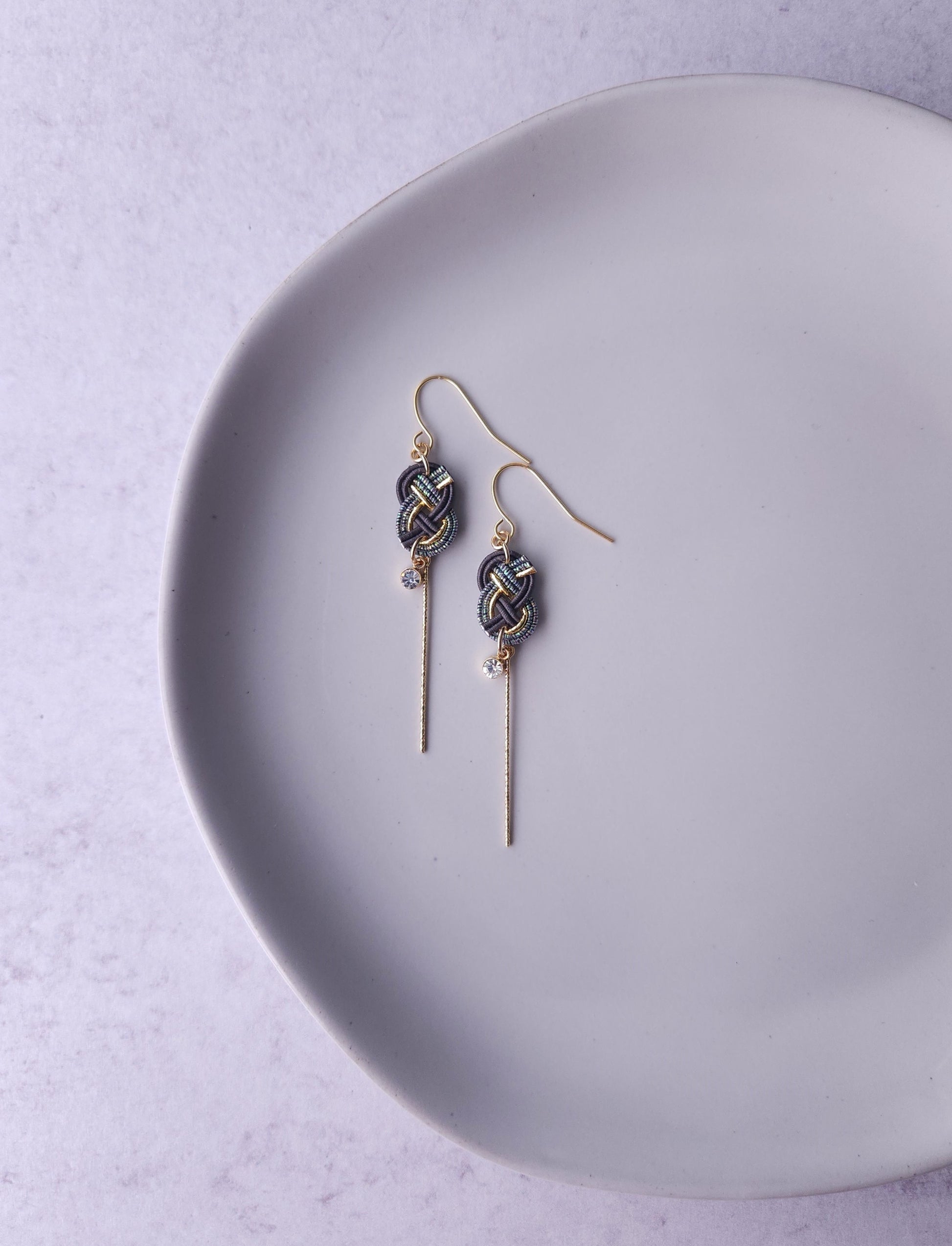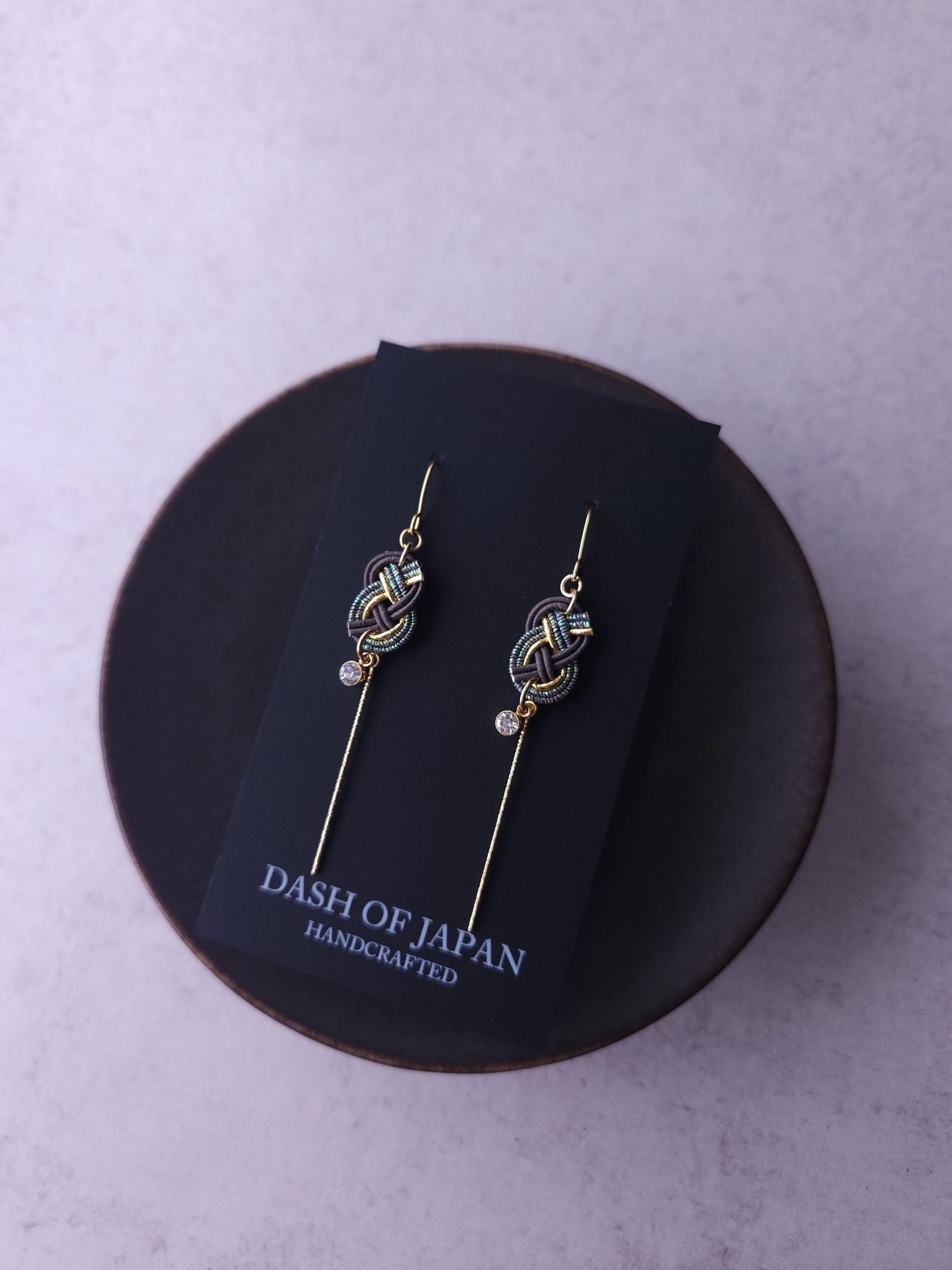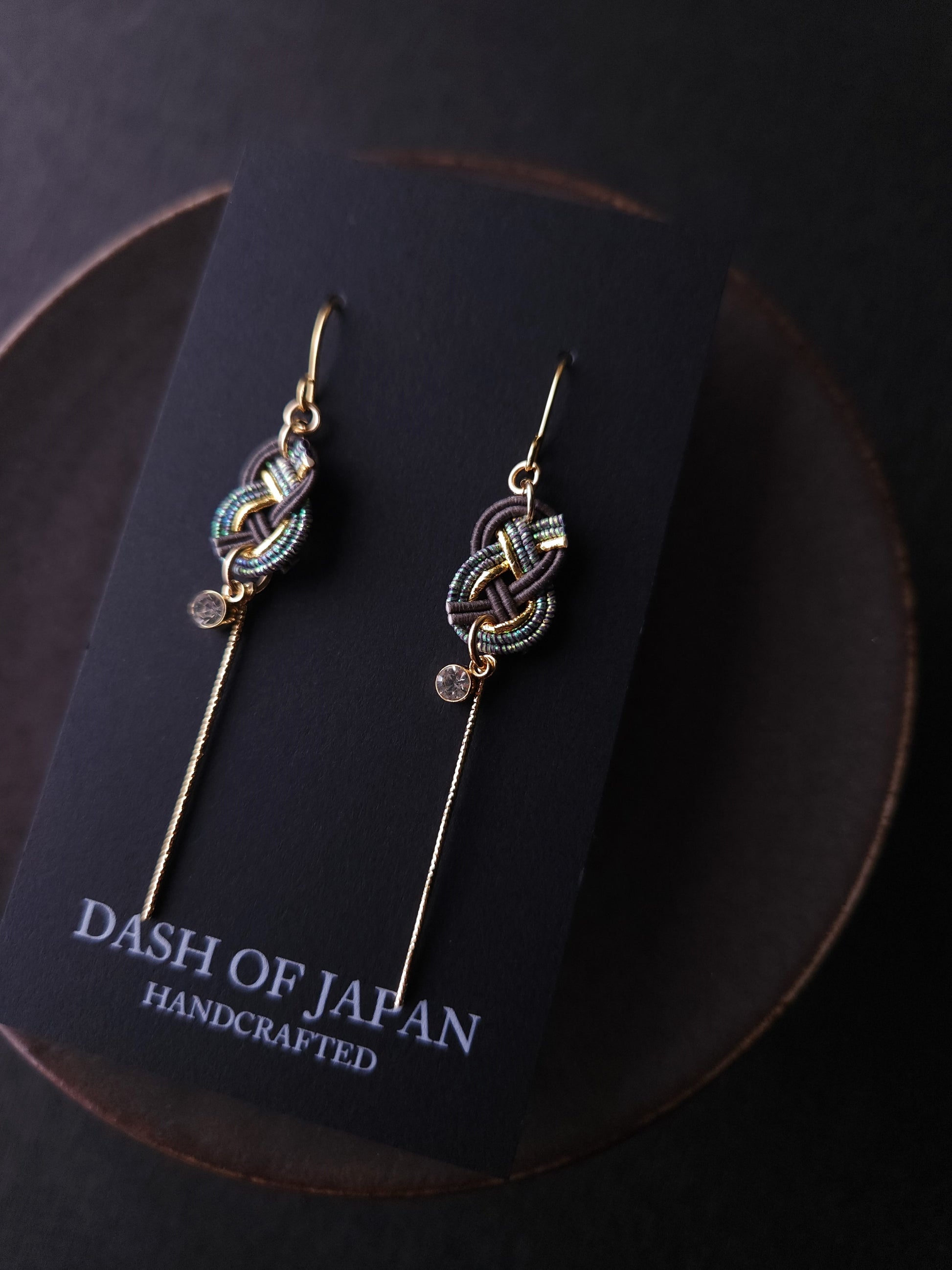 These handcrafted earrings showcase the beauty of traditional Japanese Mizuhiki knot. A delicate shiny gold bars add a graceful movement, while a tiny crystal accent brings a subtle sparkle.