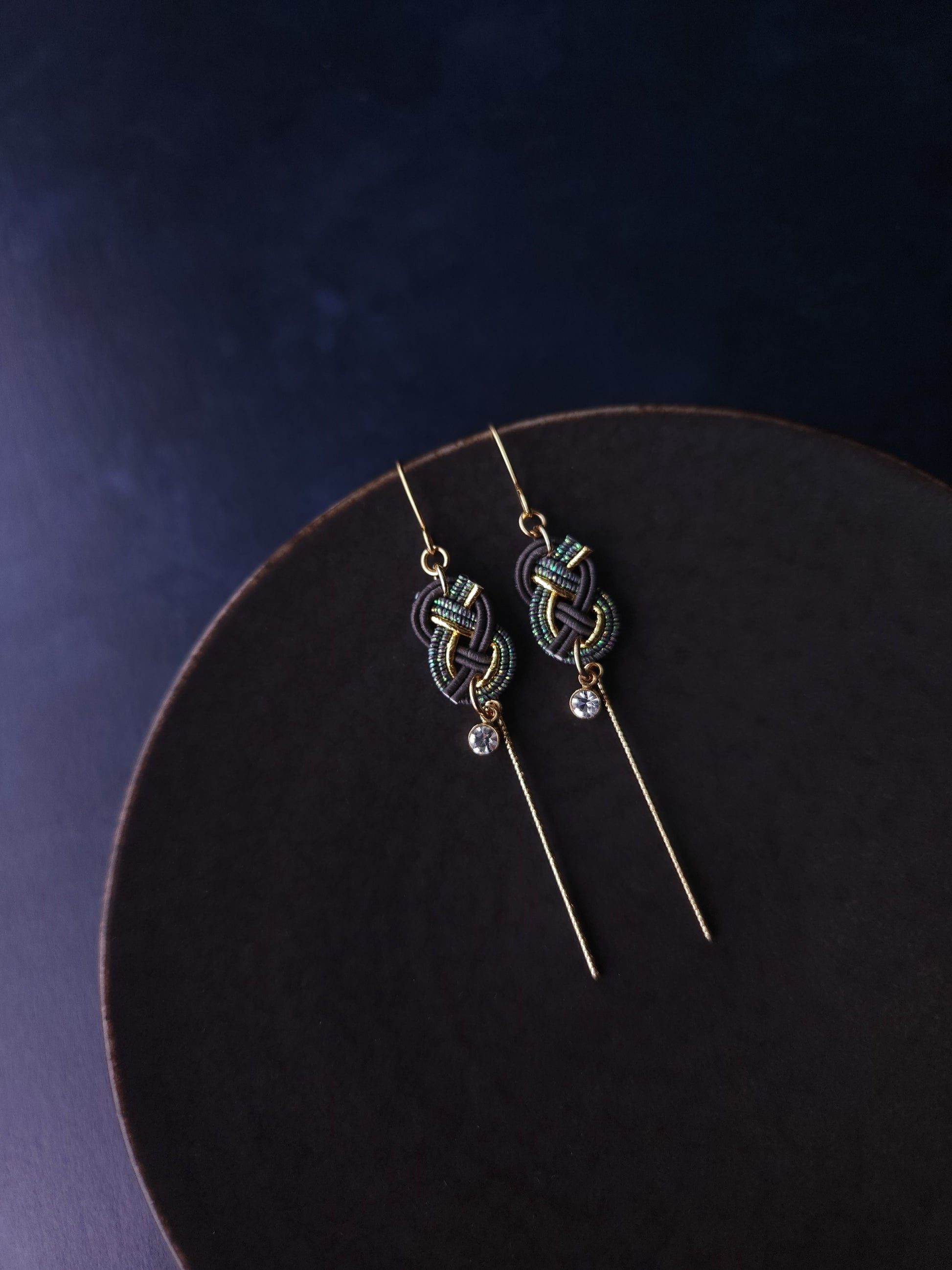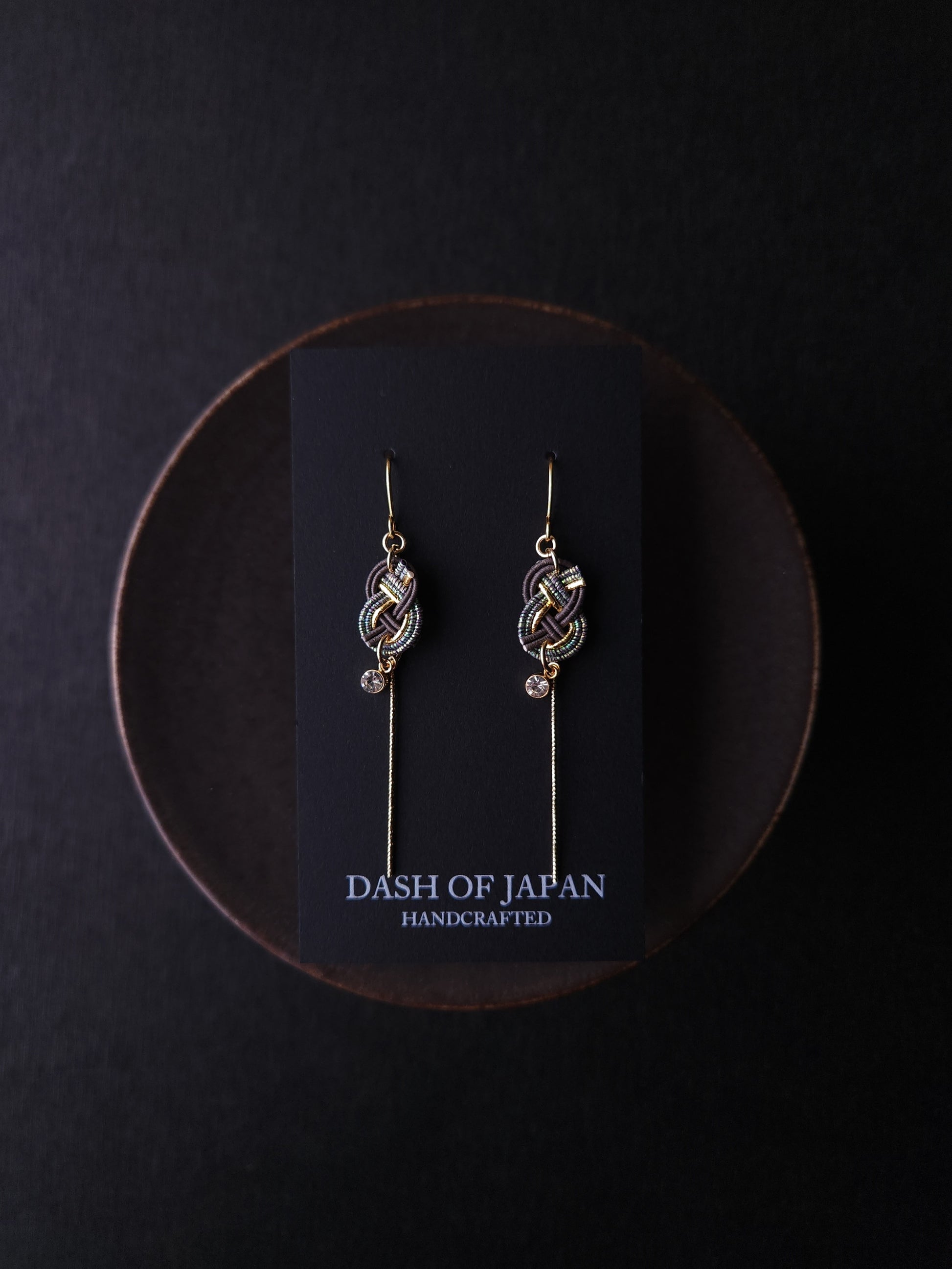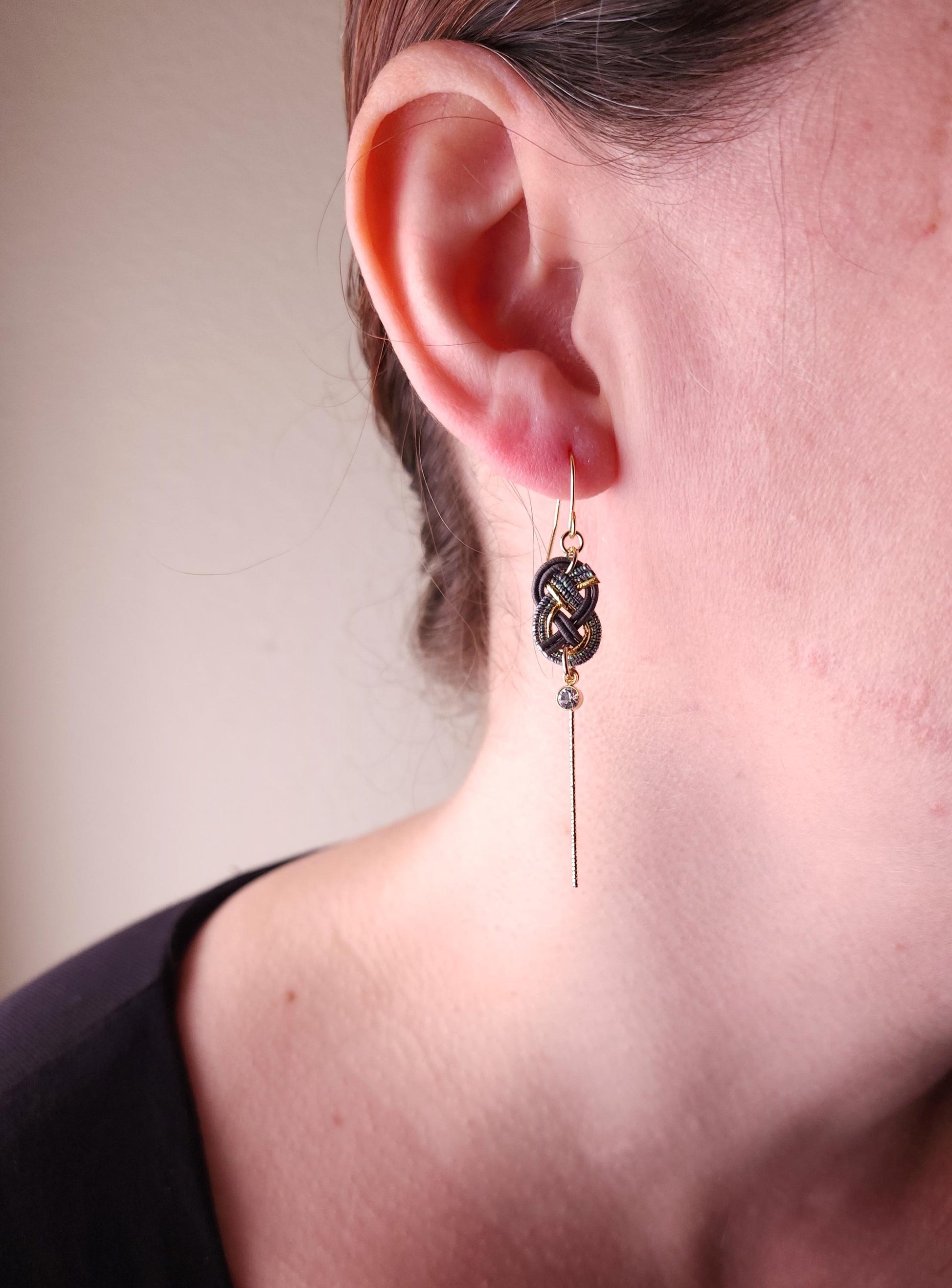 These handcrafted earrings showcase the beauty of traditional Japanese Mizuhiki knot. A delicate shiny gold bars add a graceful movement, while a tiny crystal accent brings a subtle sparkle.