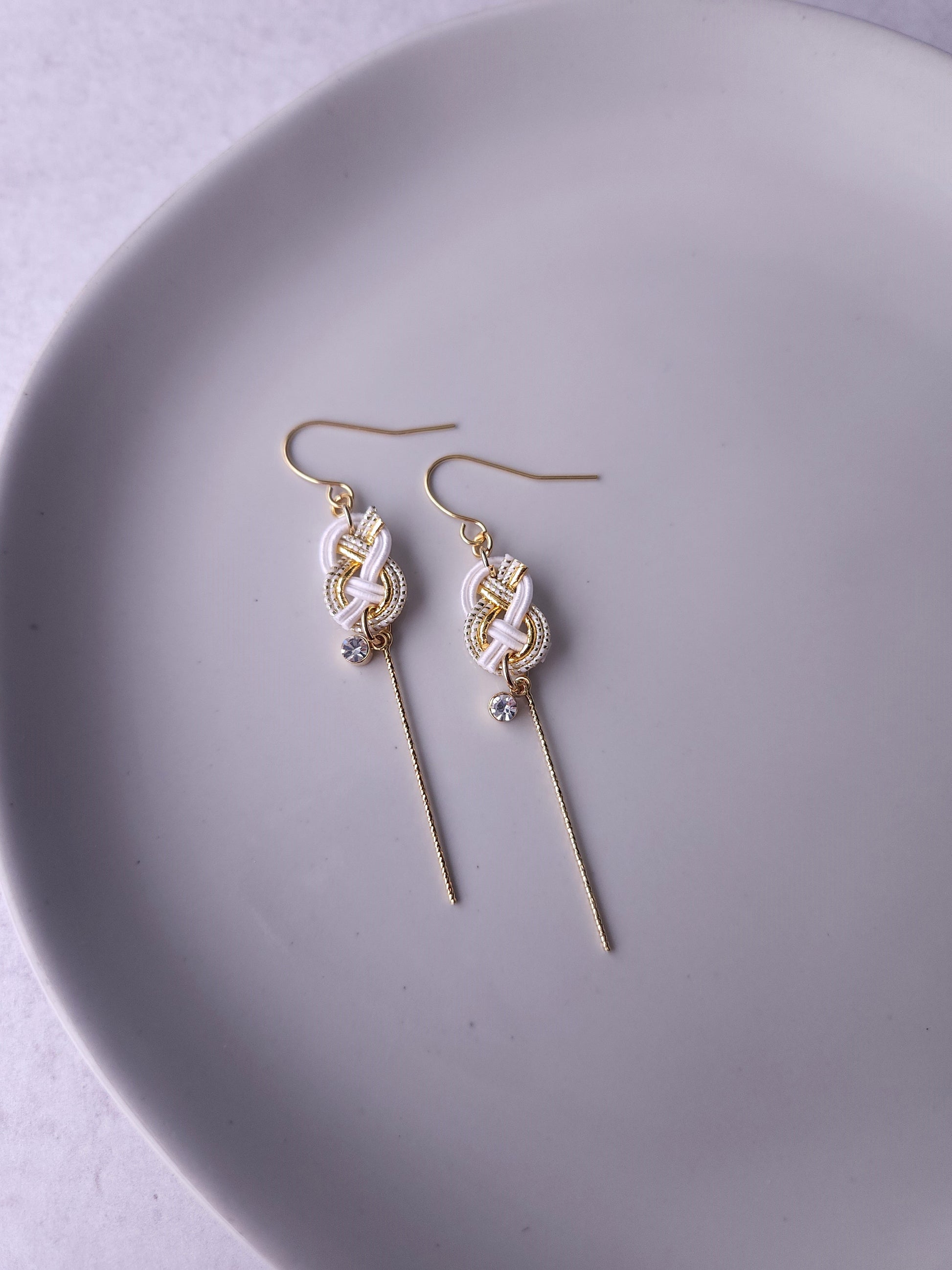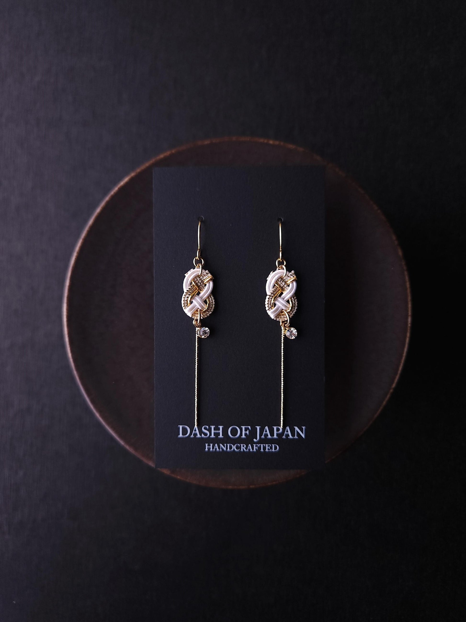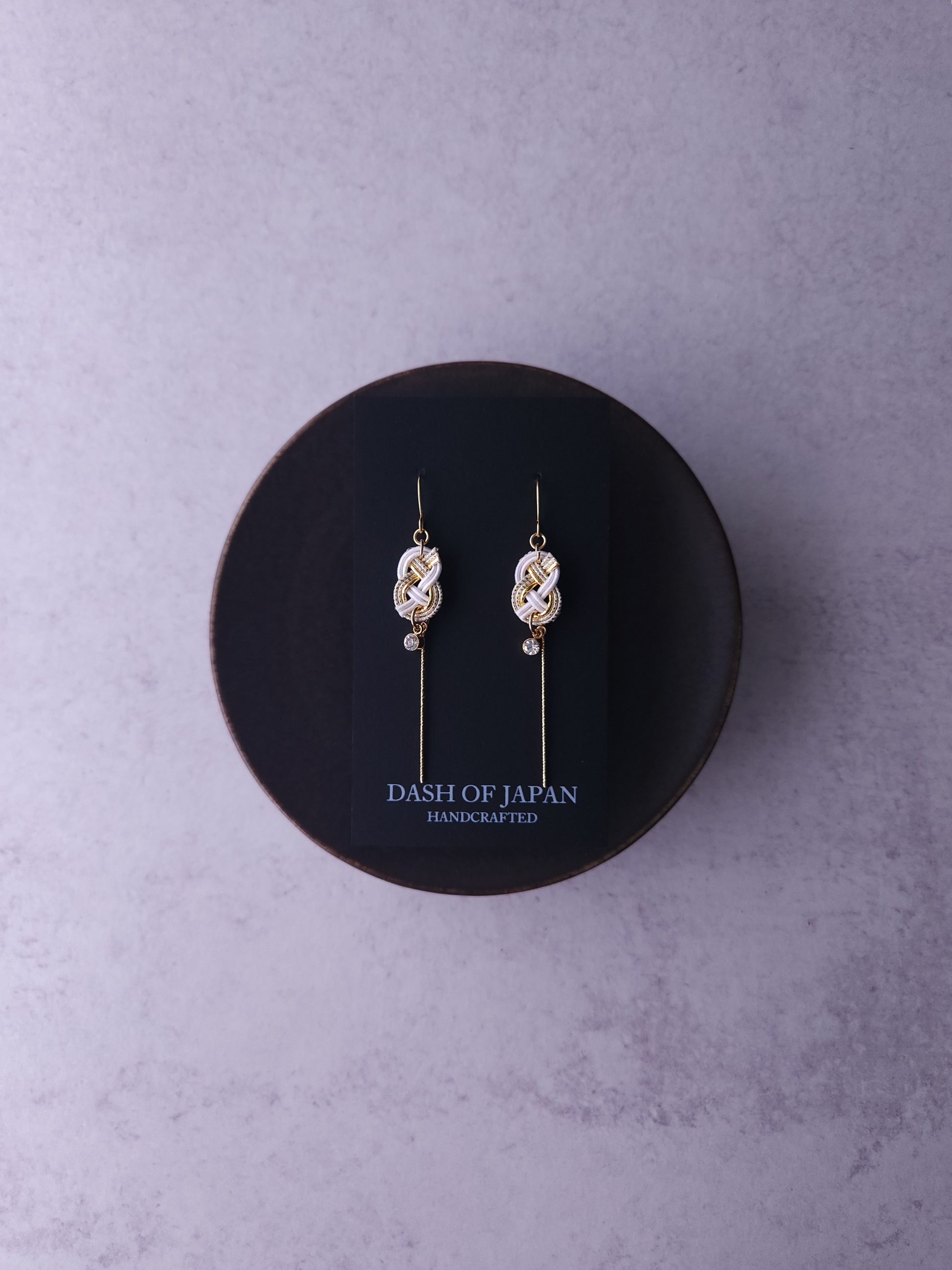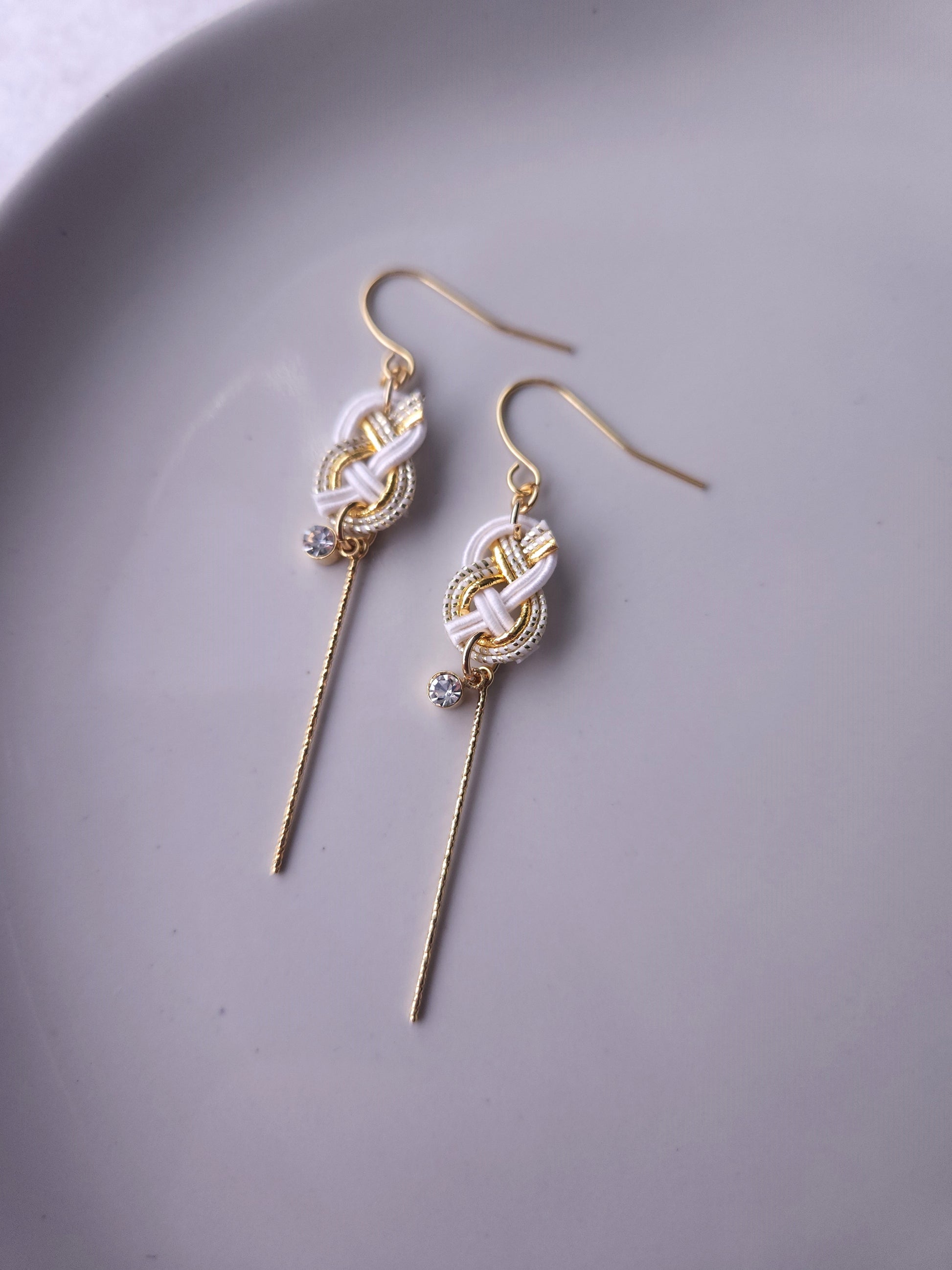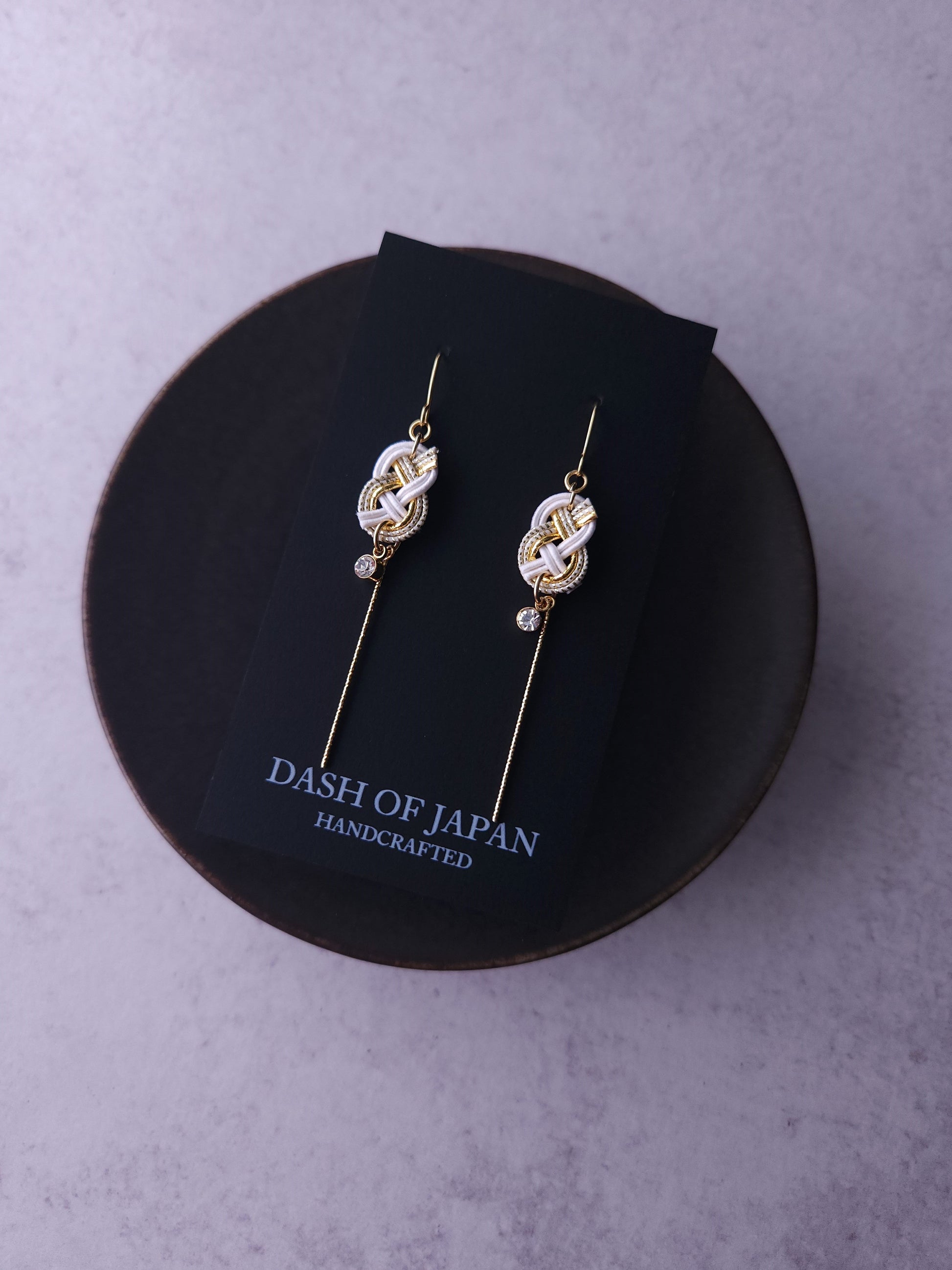These handcrafted earrings showcase the beauty of traditional Japanese Mizuhiki knot. A delicate shiny gold bars add a graceful movement, while a tiny crystal accent brings a subtle sparkle.