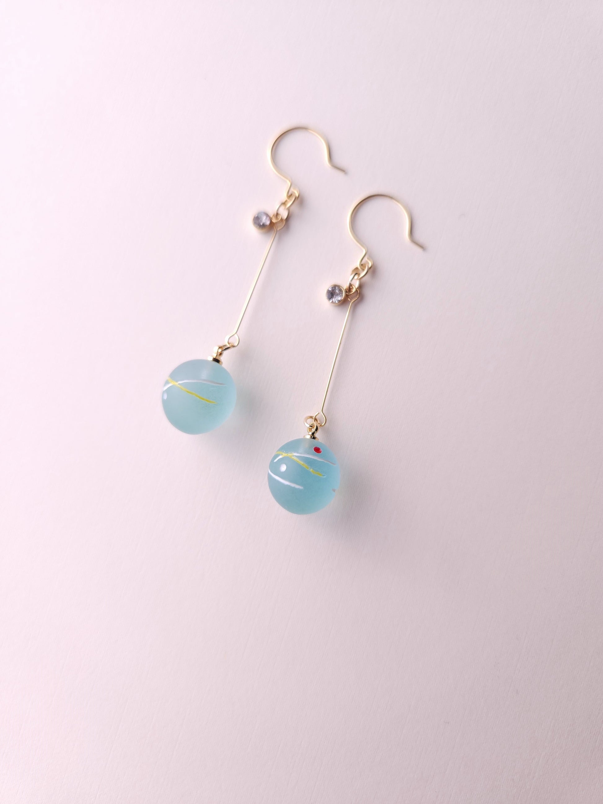 These playful earrings are inspired by yo-yo water balloons seen at Japanese summer festivals. Each piece features a translucent glass-like charm with delicate swirls that capture the nostalgic joy of a summer night.