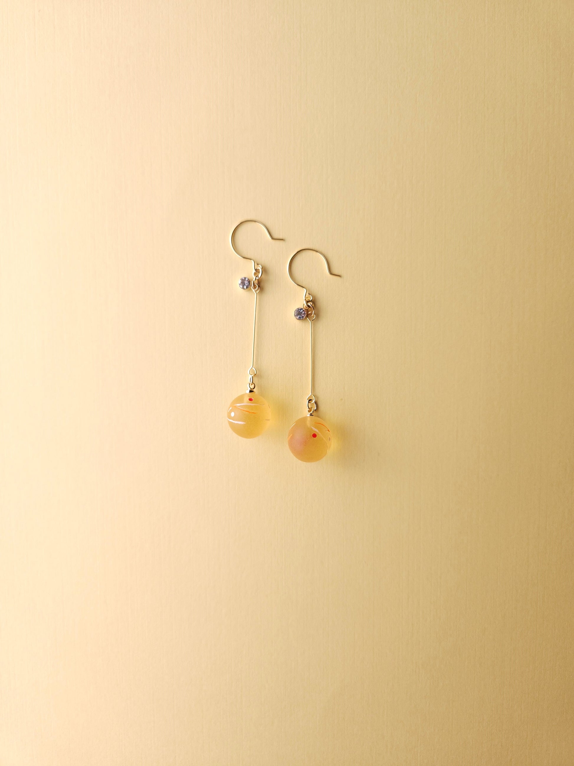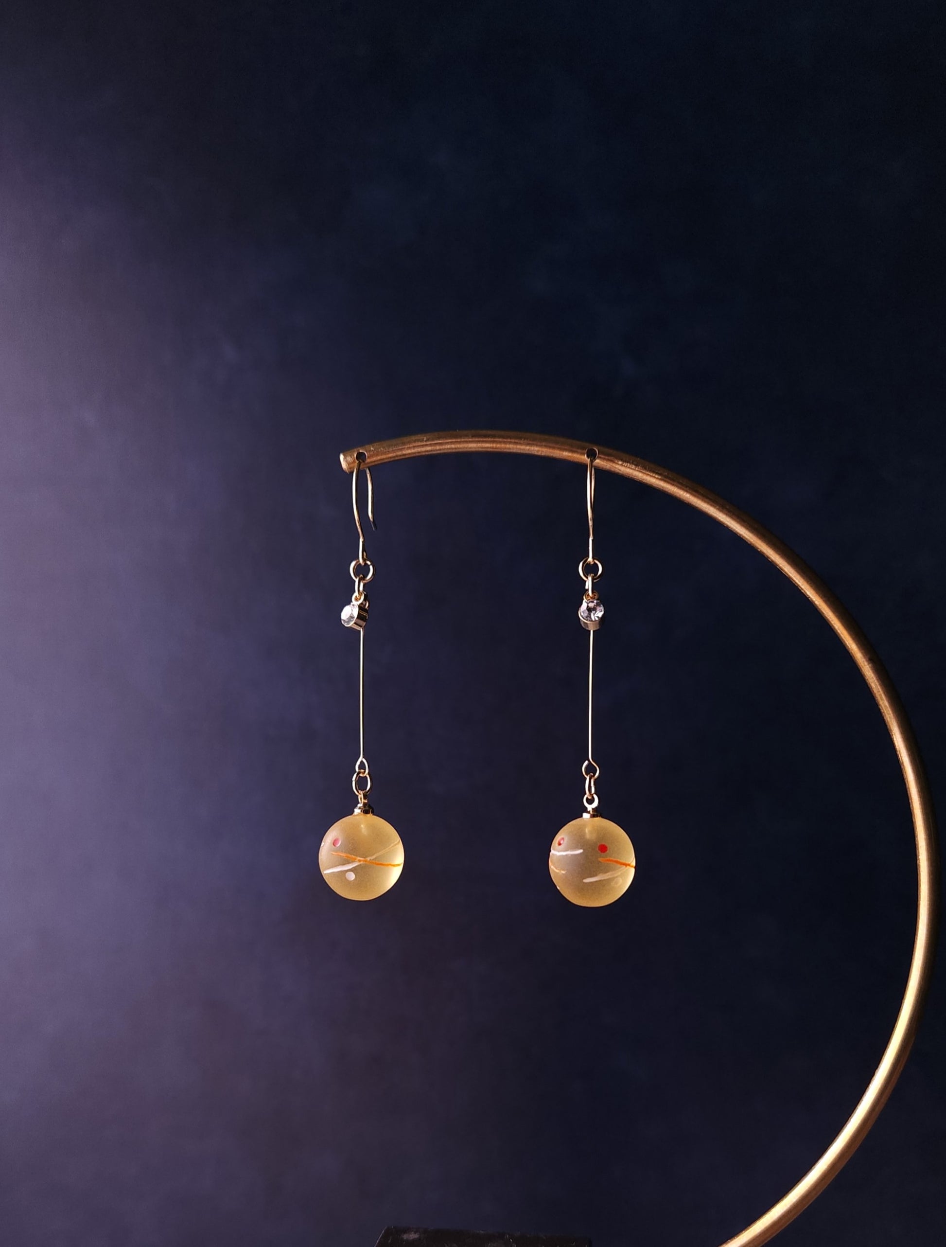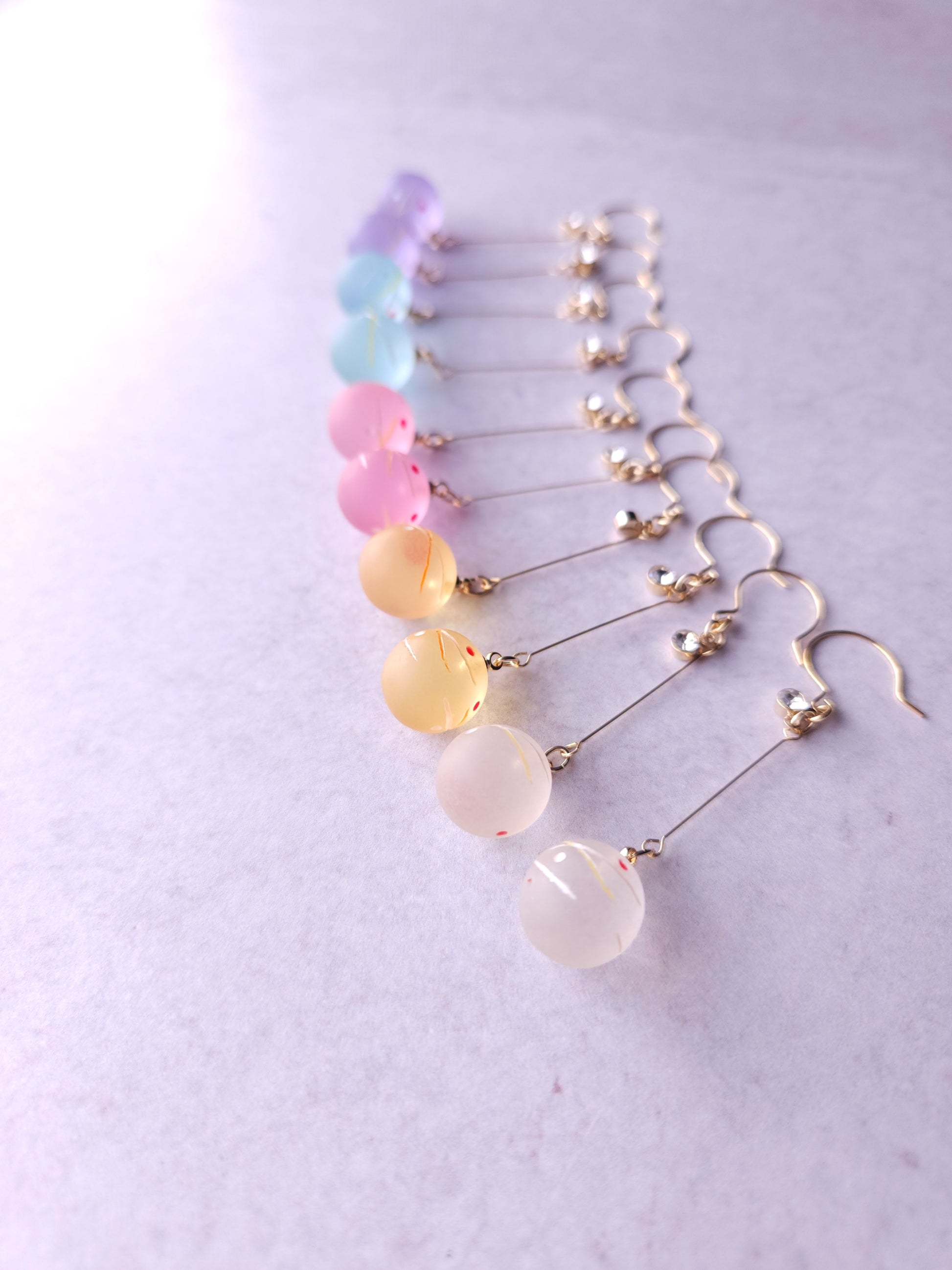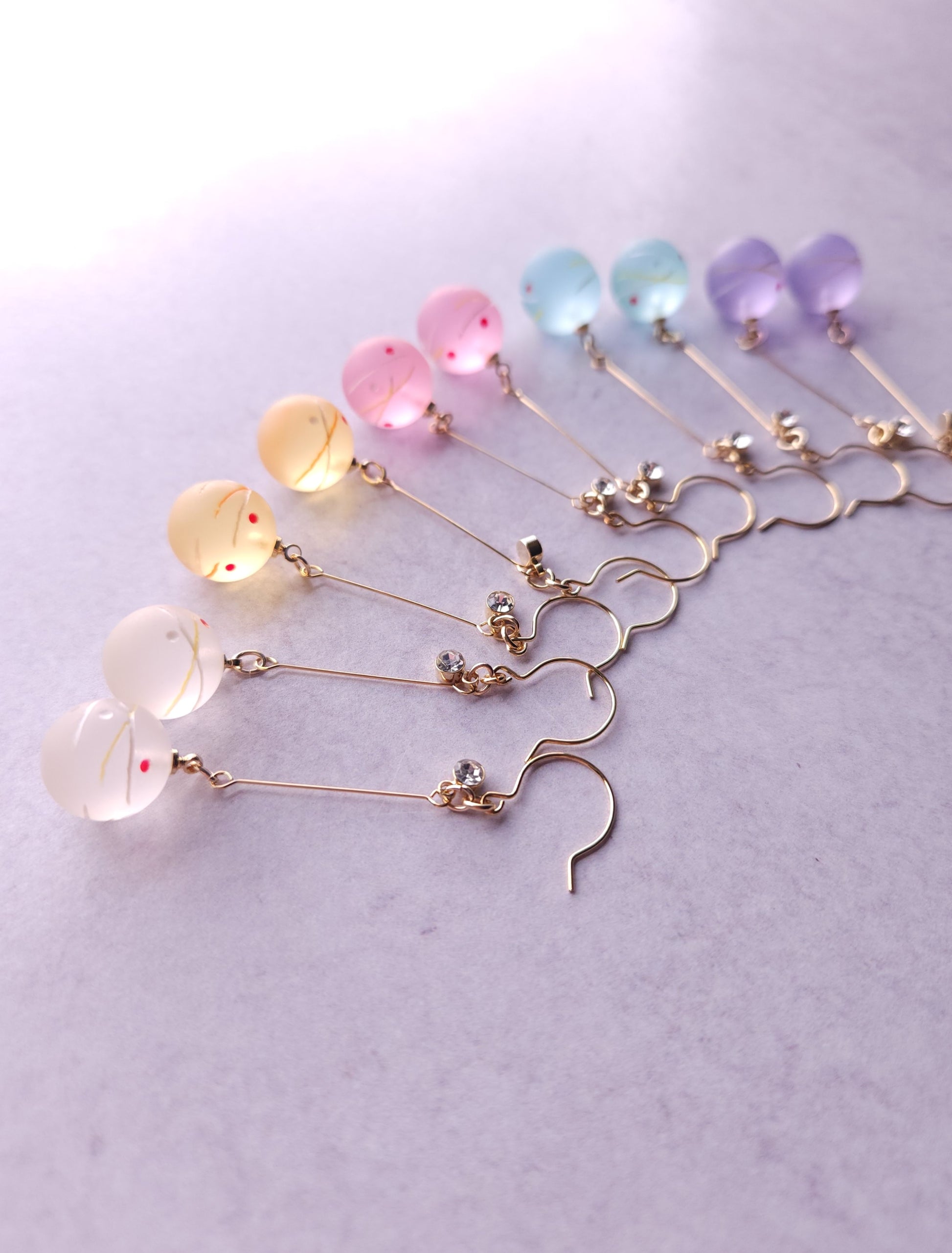 These playful earrings are inspired by yo-yo water balloons seen at Japanese summer festivals. Each piece features a translucent glass-like charm with delicate swirls that capture the nostalgic joy of a summer night.